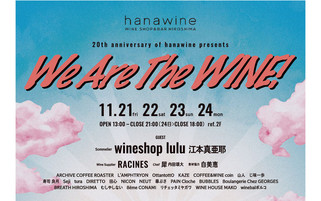開催日時: 11/21(金)・22(土)・23(日)…13:00~21:00 11/24(月祝)…13:00~18:00(最終日は早めにCLOSE) 場所:ref. 2階住所:広島県広島市中区袋町8-18<メインスペース:着席 25席 & サブスペース:スタンディングバーあり> 今年はhanawineが20周年の節目の年。この節目に、今...