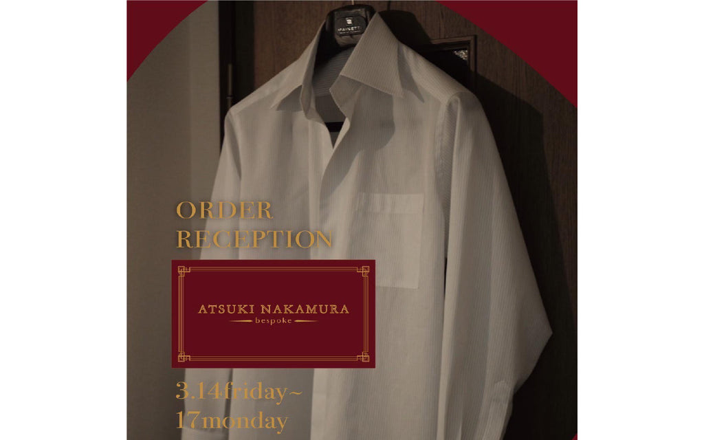 【ATSUKI NAKAMURA BESPOKE EVENT】3/14(金)~3/17(月)にて、BESPOKE EVENTと題し-SHIRTS- ”ATSUKI NAKAMURA”オーダー会 を開催致します。“何気ない瞬間を彩る為のツール”というコンセプトのもと、主に肩周りの緻密な設計から生まれる”空気の層を纏うようなフィッティング”で、着用者が体型...