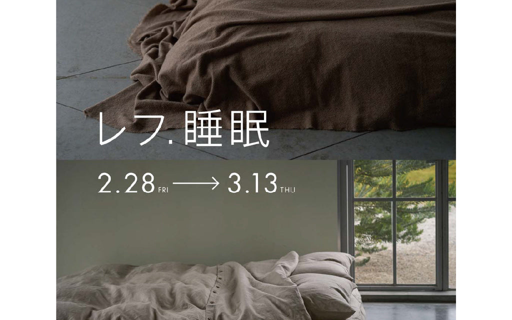 【レフ.睡眠】『人生の3分の1は睡眠費やす』ともはや常套句にもなっていますが、みなさんは満足な睡眠を取られておりますでしょうか?今回のイベントの特集は『良い睡眠』です。今回は、ref.の考える『理想の眠り』提案させていただきます。会期中は、ベッド、枕、布団、ブランケット、ベッドカバー、布団カバー、シーツ、リカバリーウェア他を、実際体験していただきながら...