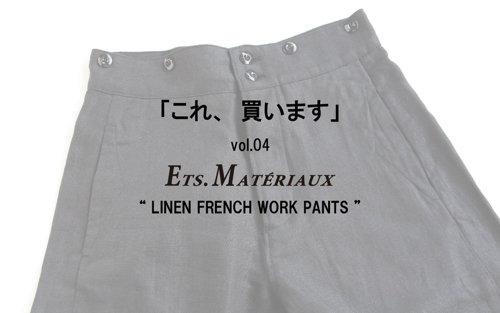 ref.スタッフがウィッシュリストに入れたものや、密かに狙っているアイテムなど不定期にご紹介する「これ、買います」のコーナー。奇跡的に首の皮一枚残った状態のスタッフIから引き継いで、今回はスタッフKがお送りします。ご紹介するのはETS.MATERIAUX(イーティーエスマテリオ)のLINEN FRENCH WORK PANTSです。 アイテムを紹介する...