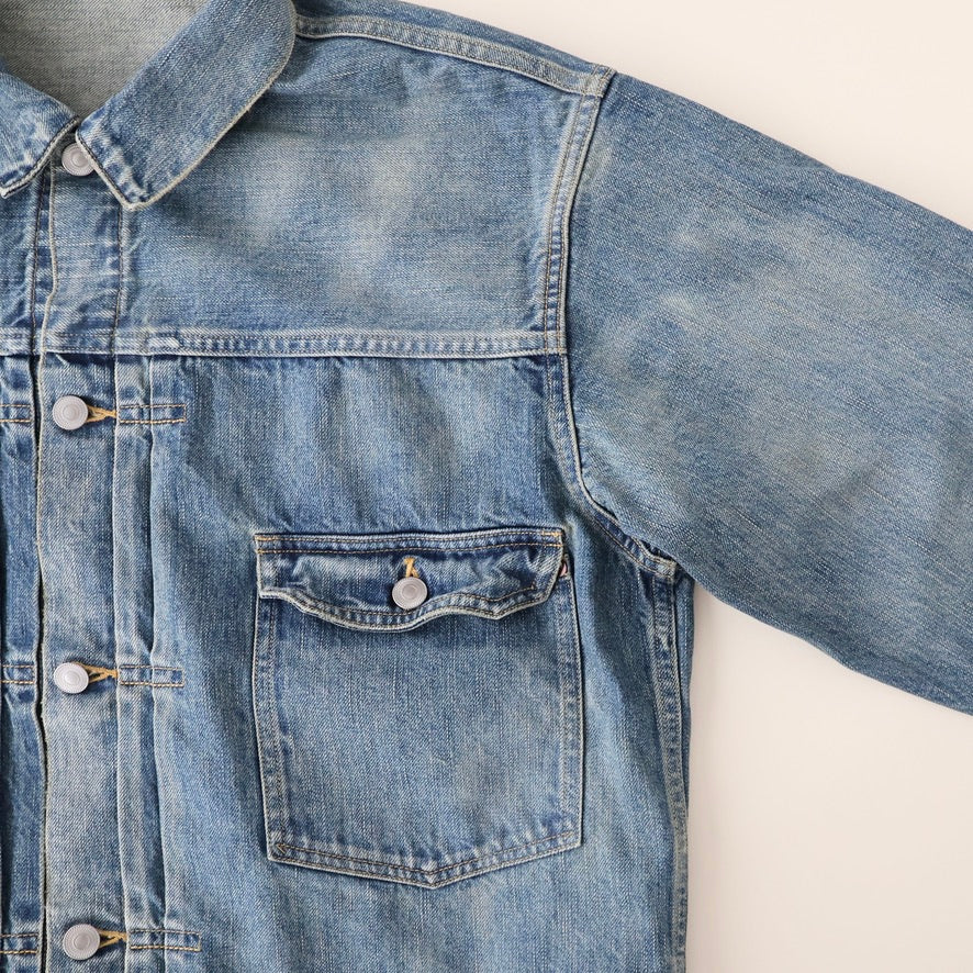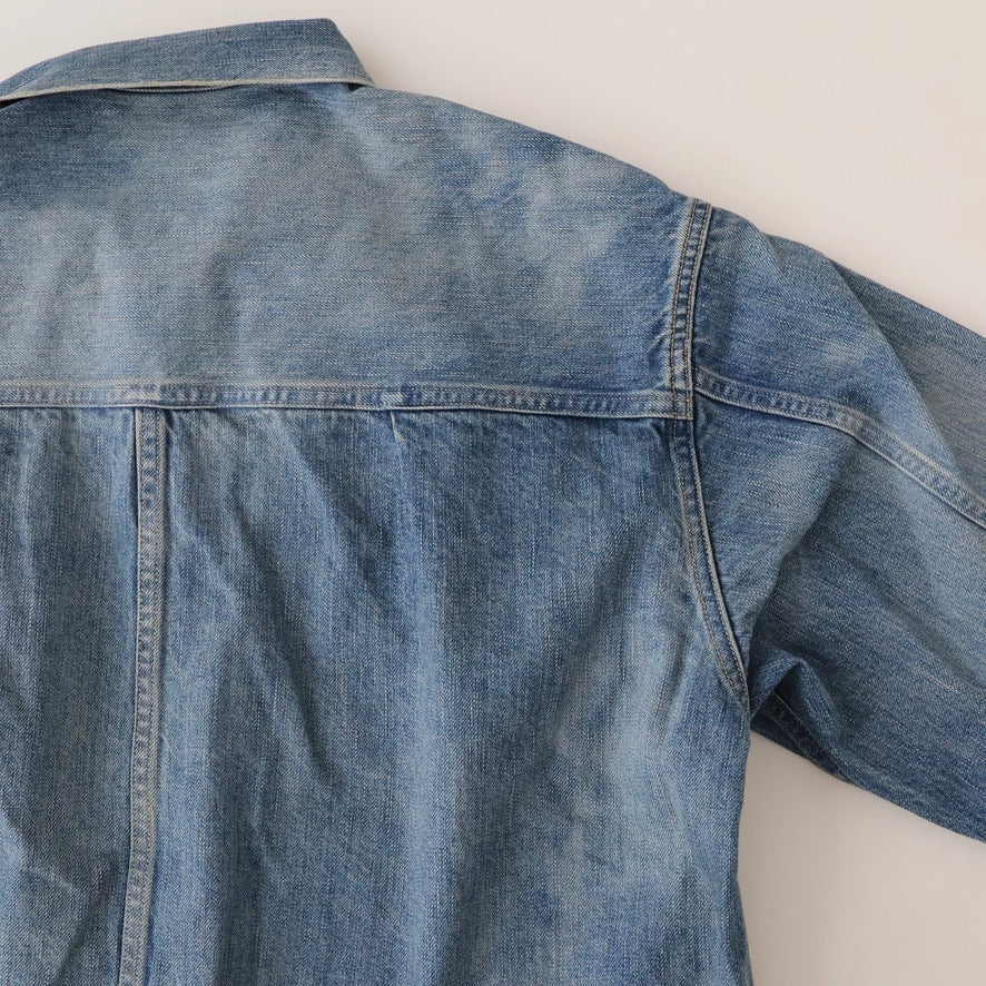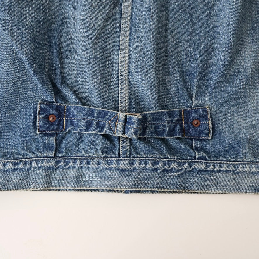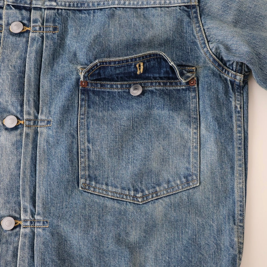 40's 506XXE通称「Tバック」をベースにアレンジ。着丈を僅かに伸ばして、短過ぎず着やすい設定にした。原型は肩傾斜が少なく、肩からアームホールにかけてシワが溜まってしまうが、肩傾斜を下げ、袖山を僅かに高くすることでシルエットを改善した。オリジナルのタック釦を採用。