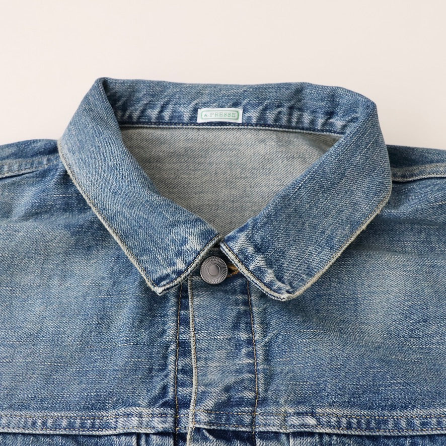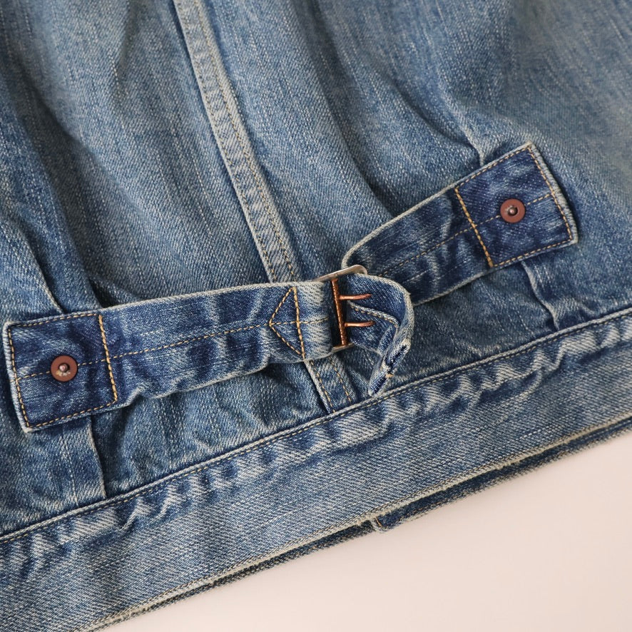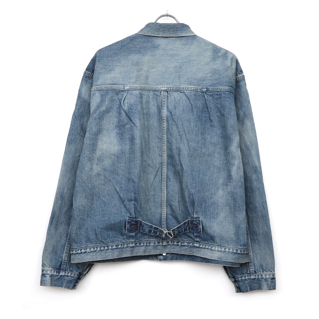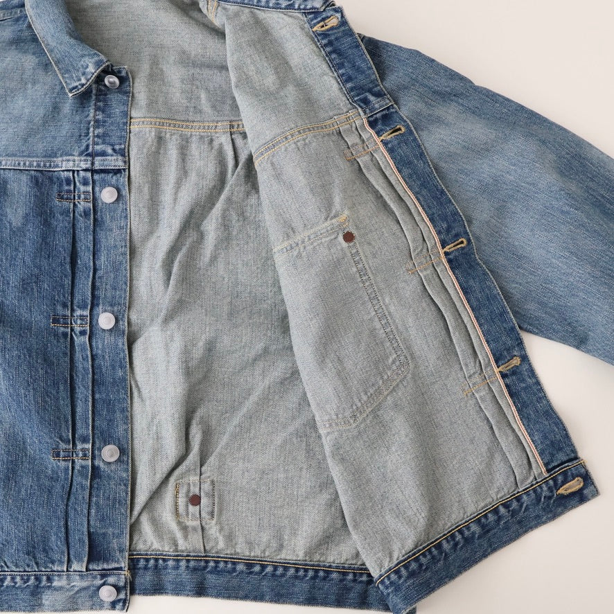 40's 506XXE通称「Tバック」をベースにアレンジ。着丈を僅かに伸ばして、短過ぎず着やすい設定にした。原型は肩傾斜が少なく、肩からアームホールにかけてシワが溜まってしまうが、肩傾斜を下げ、袖山を僅かに高くすることでシルエットを改善した。オリジナルのタック釦を採用。