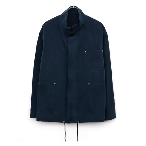 経糸はコットンシルク、緯糸はコットンとヘンプの混紡糸と超長綿を交互に打ち込んで高密度で織り上げたダック素材。糸の染色は洗い後に退色感が出るように硫化染め(BLACKのみ)で仕上げている。ヘンプは麻の中でも一番硬さがある糸で、生地にハリ感を持たせる役割として使用し、生地が硬すぎないように超長綿でハリ感を中和させている。シルクや超長綿で光沢感とヌメリ感を出しながらも色落ちで経年変化を表現させたダック生地。