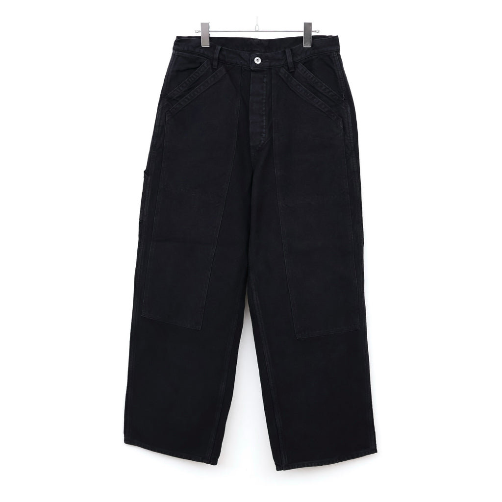 経糸はコットンシルク、緯糸はコットンとヘンプの混紡糸と超長綿を交互に打ち込んで高密度で織り上げたダック素材。糸の染色は洗い後に退色感が出るように硫化染め(BLACKのみ)で仕上げている。ヘンプは麻の中でも一番硬さがある糸で、生地にハリ感を持たせる役割として使用し、生地が硬すぎないように超長綿でハリ感を中和させている。シルクや超長綿で光沢感とヌメリ感を出しながらも色落ちで経年変化を表現させたダック生地。