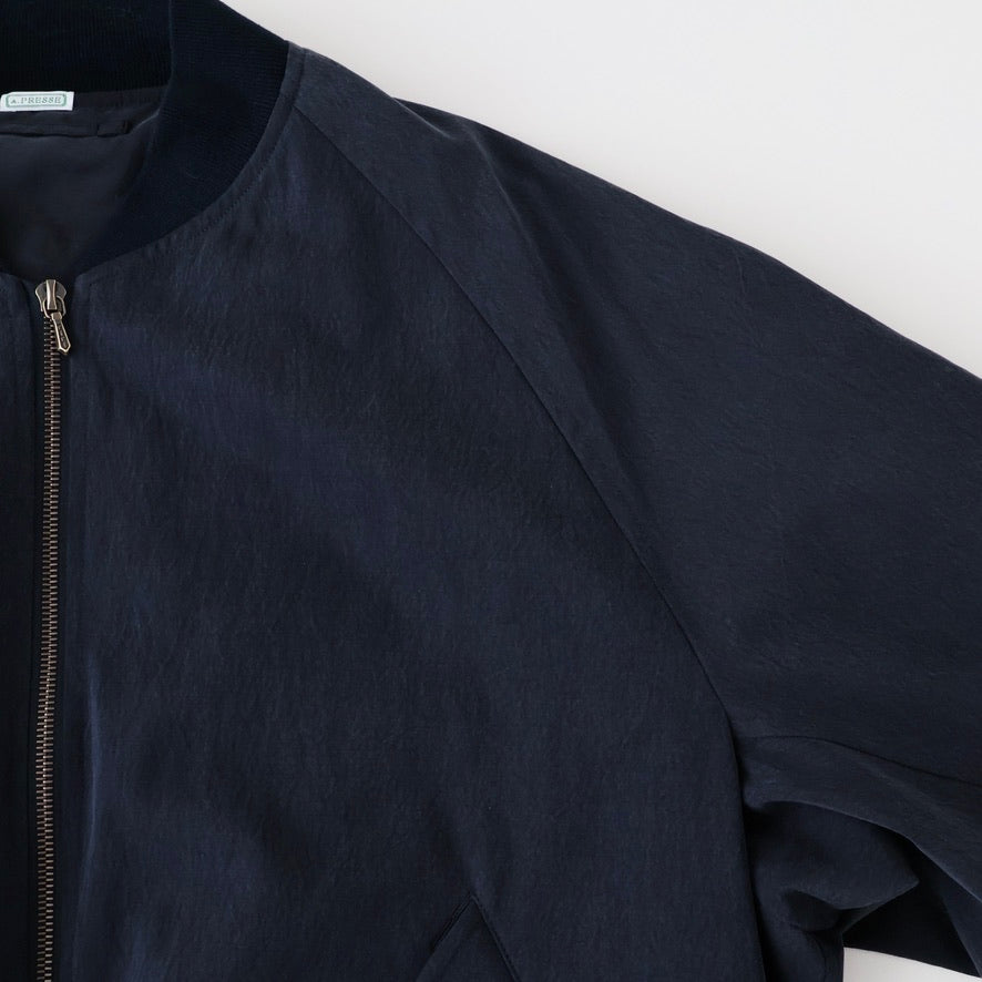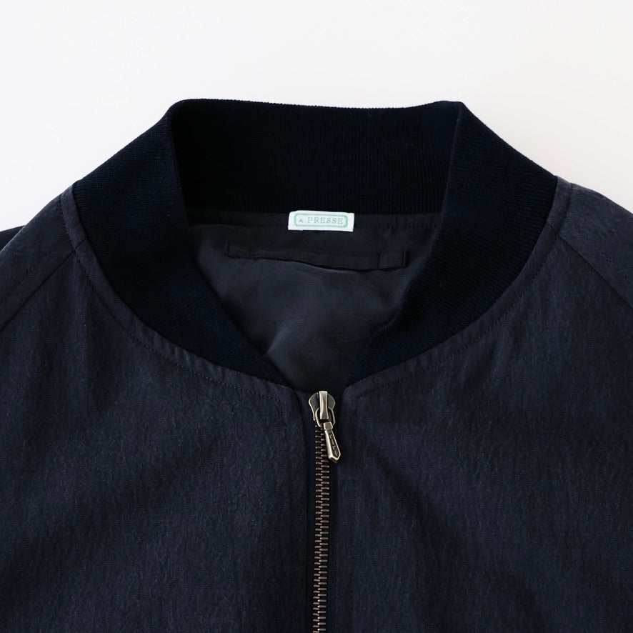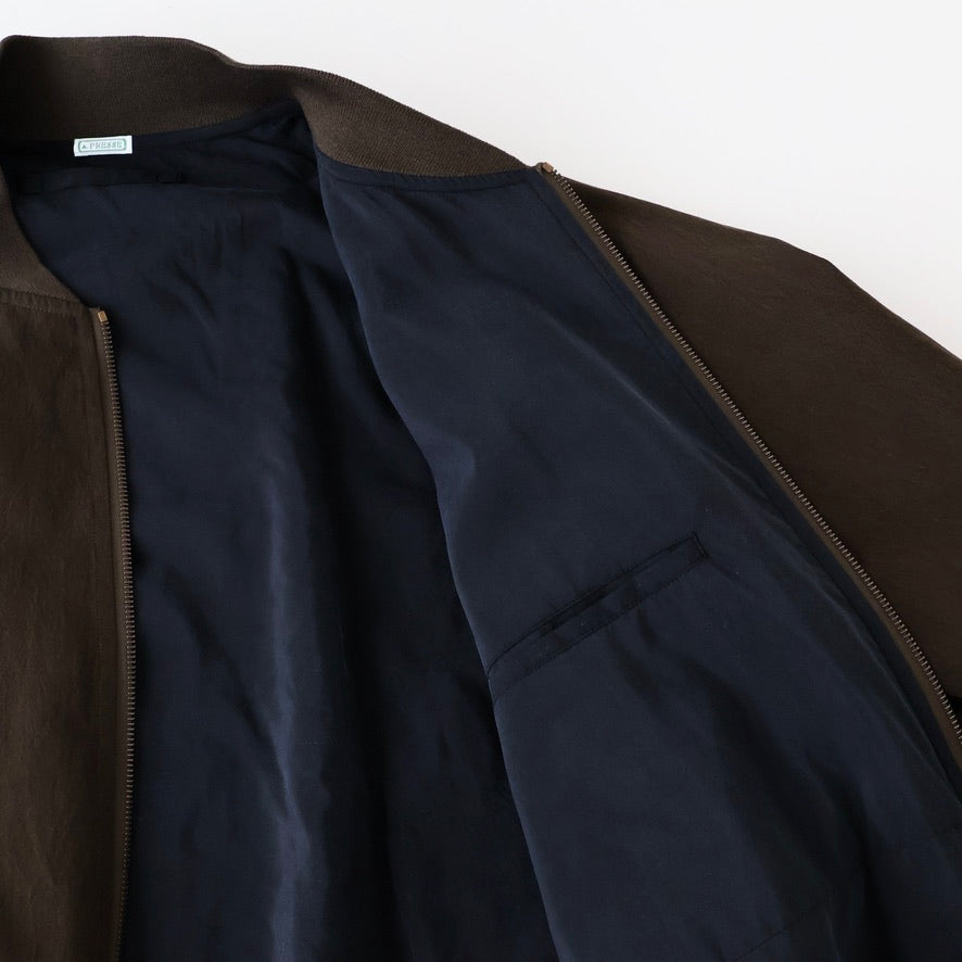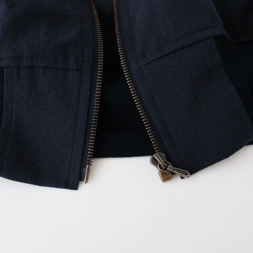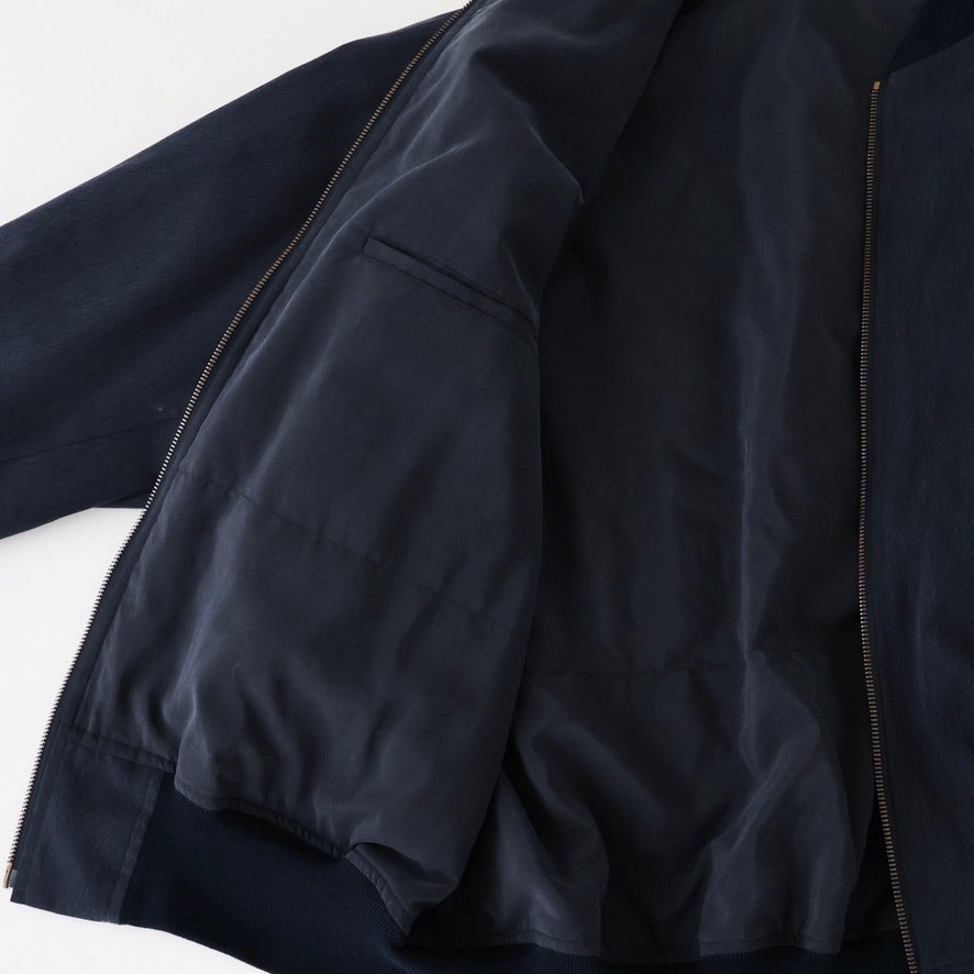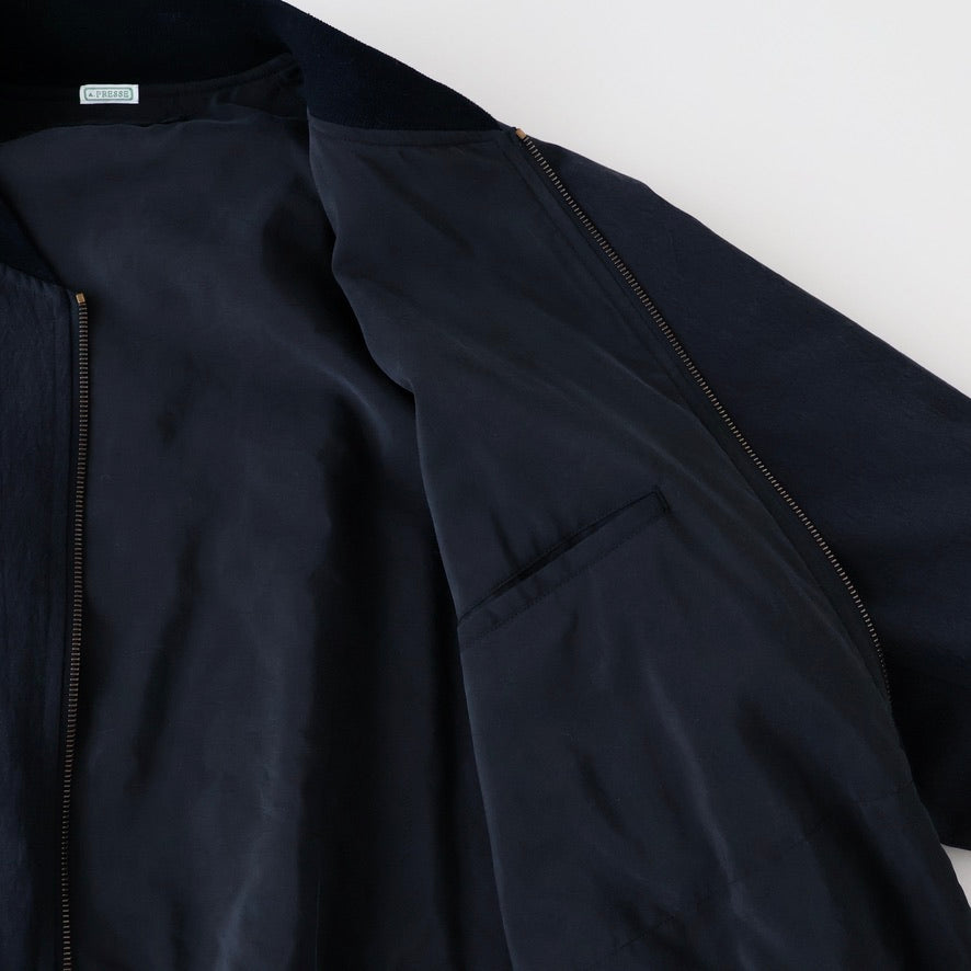 表地は経糸にシルクフィラメント糸を使用し、緯糸に細番手のコットンを高密度に打ち込んだ、超高密度ダブルクロス。仕上げにヴィンテージ加工を施すことにより、表面のシルクがフィブリルし光沢が落ち着き、適度なコシは残しつつも、とても滑らかな素晴らしい風合いに仕上がった。着用可能な時期が長くなる様に、中綿は極薄のものを入れた。