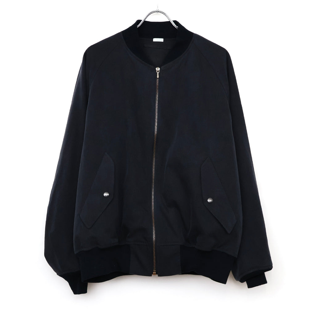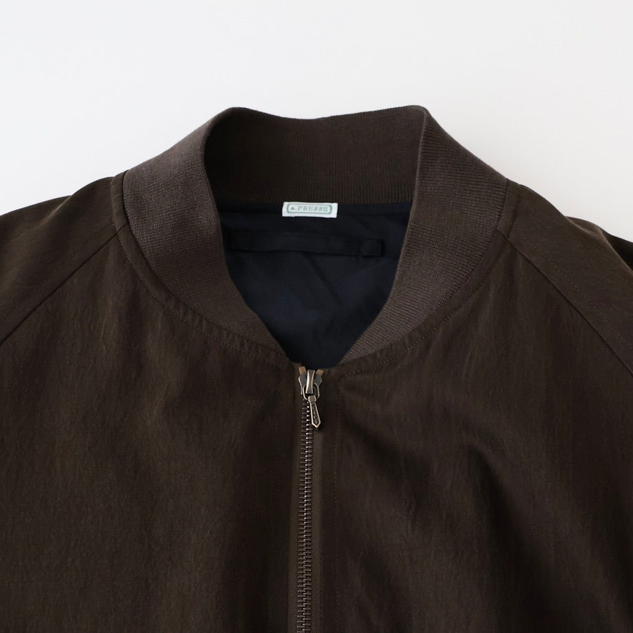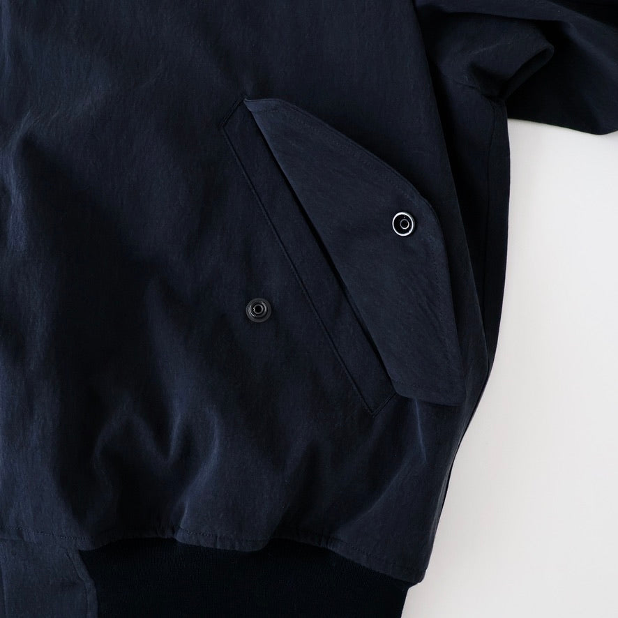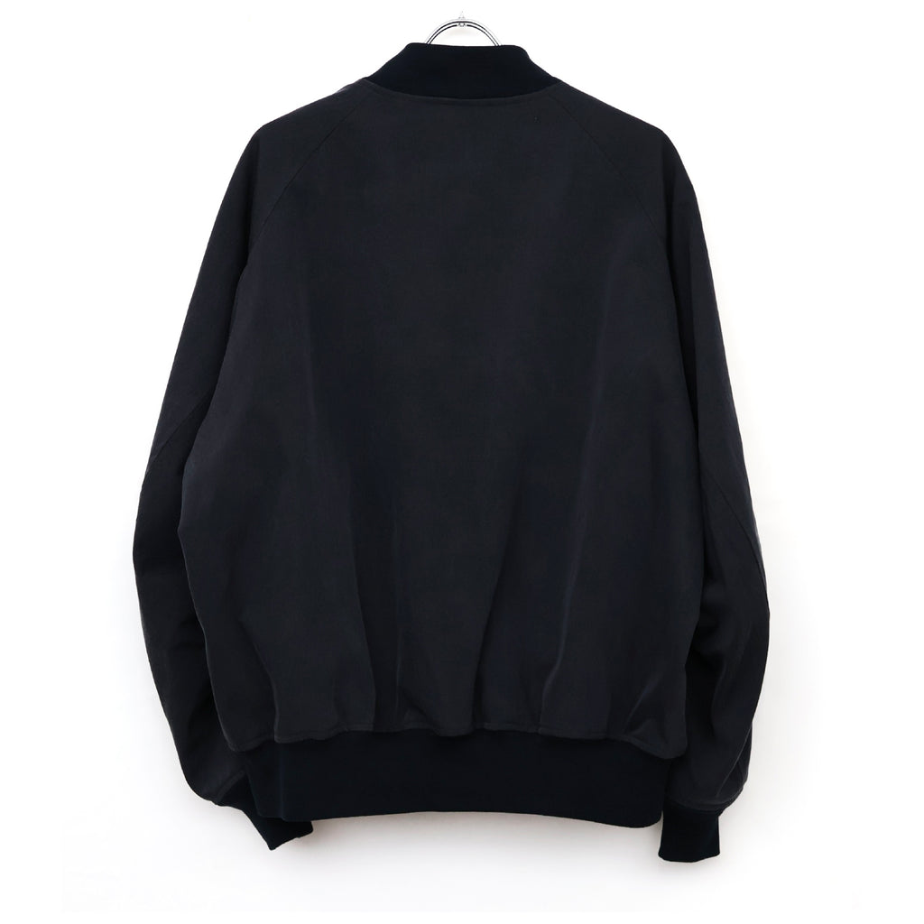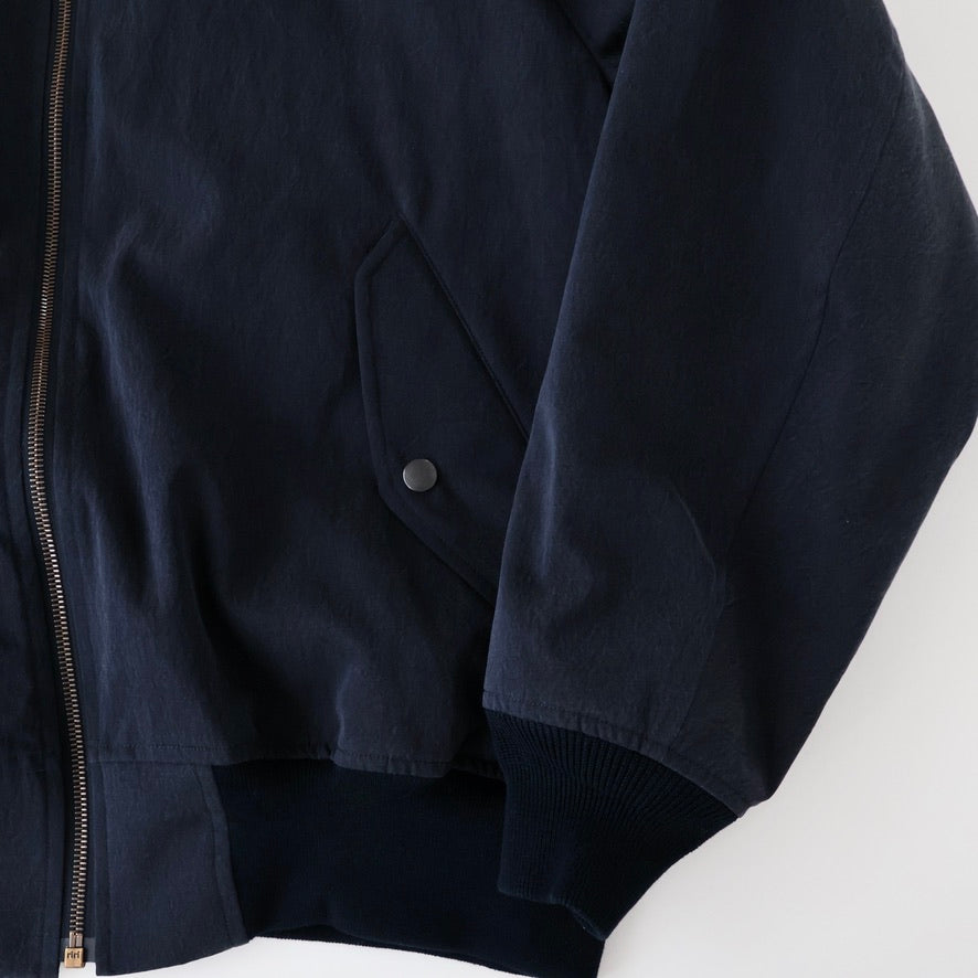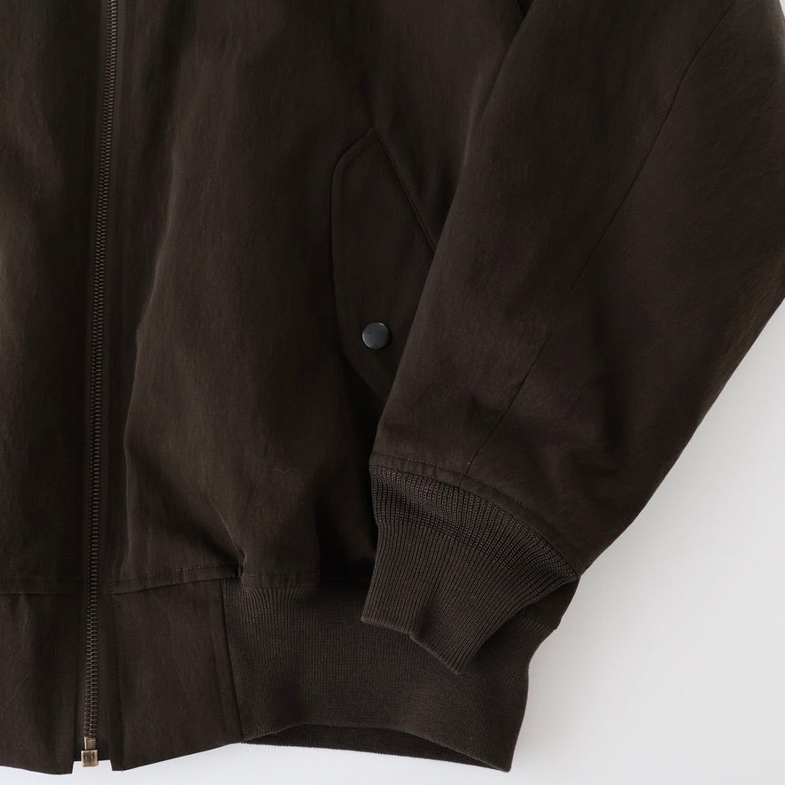 表地は経糸にシルクフィラメント糸を使用し、緯糸に細番手のコットンを高密度に打ち込んだ、超高密度ダブルクロス。仕上げにヴィンテージ加工を施すことにより、表面のシルクがフィブリルし光沢が落ち着き、適度なコシは残しつつも、とても滑らかな素晴らしい風合いに仕上がった。着用可能な時期が長くなる様に、中綿は極薄のものを入れた。