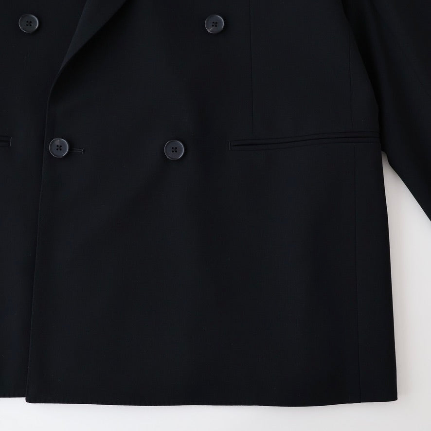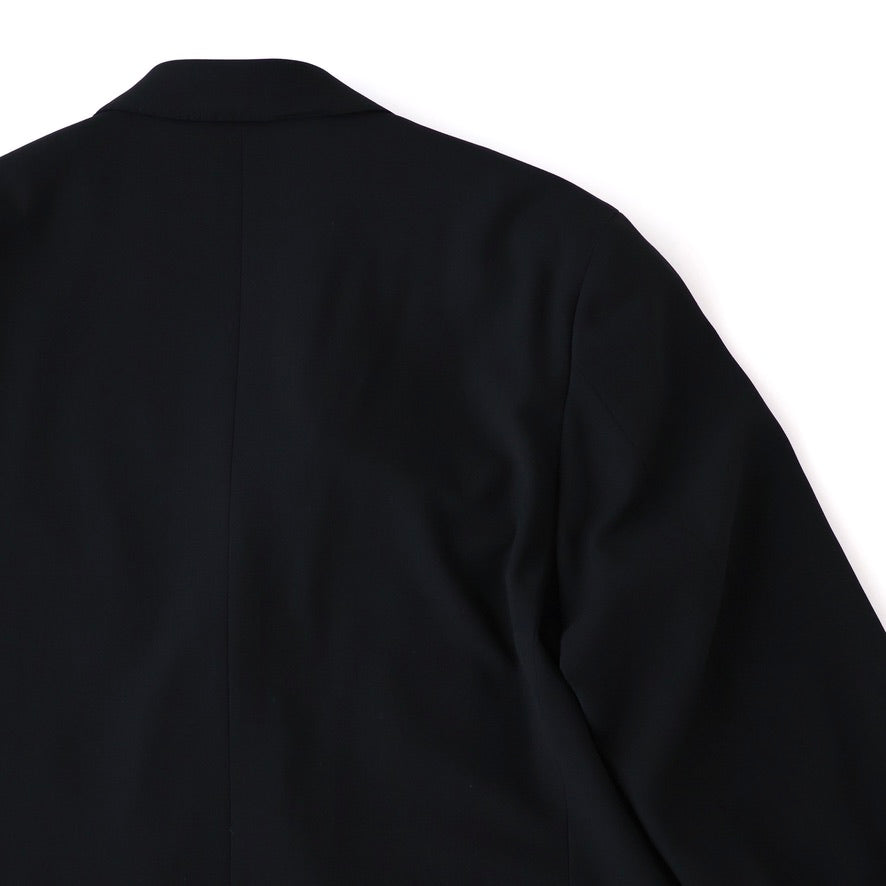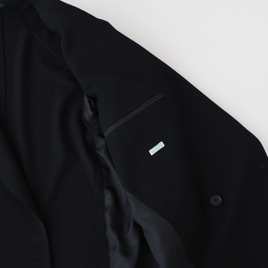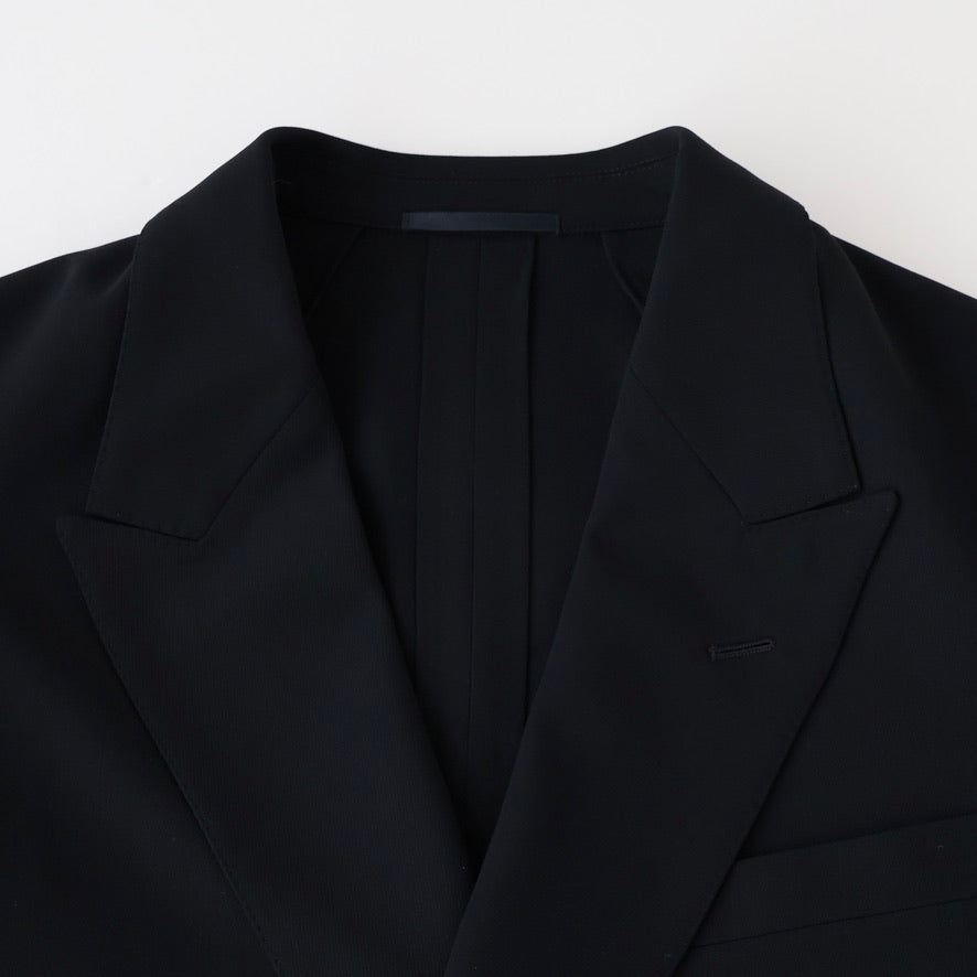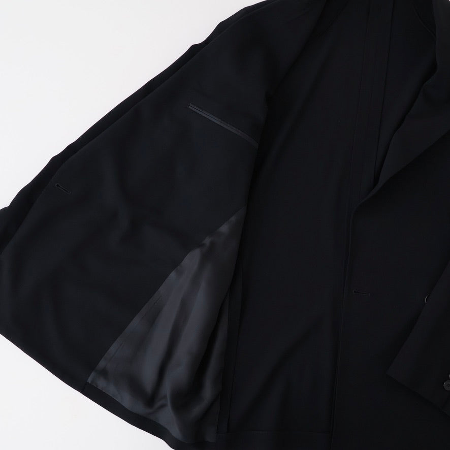 オーストラリア産Super160'sのファインメリノ種を使用した双糸を強撚し、経緯同じ糸で織り上げた。組織は80年代に流行した変形バラシア(変形の斜子織組織の生地)の裏面のカルゼ面を使用した。立体的な綾組織で原料からくる上質な艶と滑らかなドレープが特徴。裏地は無くし、袖裏だけ袖通しを考慮しキュプラツイルを使用した。釦はオリジナルホーン釦。