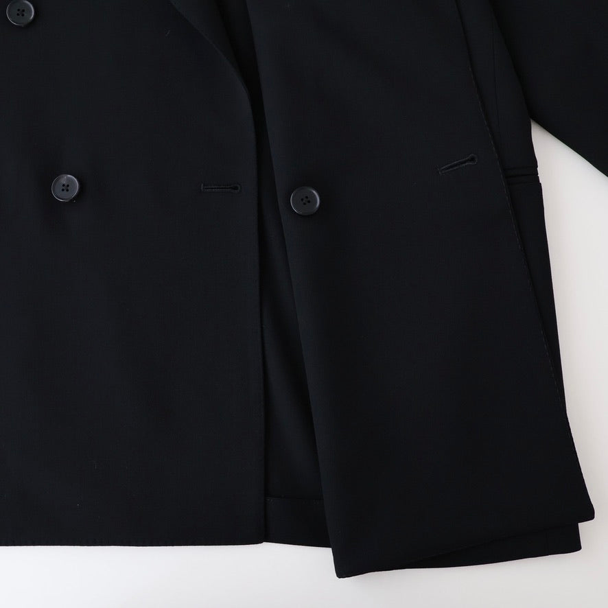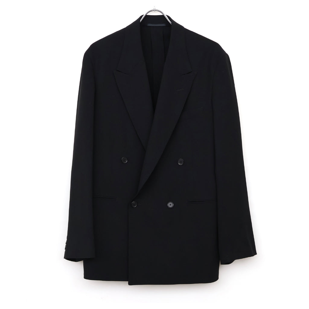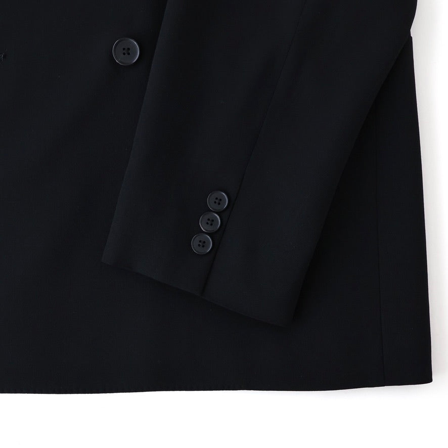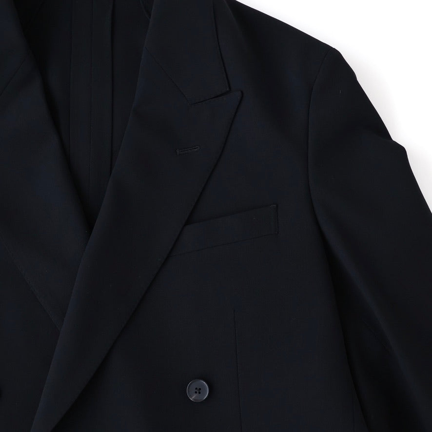 オーストラリア産Super160'sのファインメリノ種を使用した双糸を強撚し、経緯同じ糸で織り上げた。組織は80年代に流行した変形バラシア(変形の斜子織組織の生地)の裏面のカルゼ面を使用した。立体的な綾組織で原料からくる上質な艶と滑らかなドレープが特徴。裏地は無くし、袖裏だけ袖通しを考慮しキュプラツイルを使用した。釦はオリジナルホーン釦。