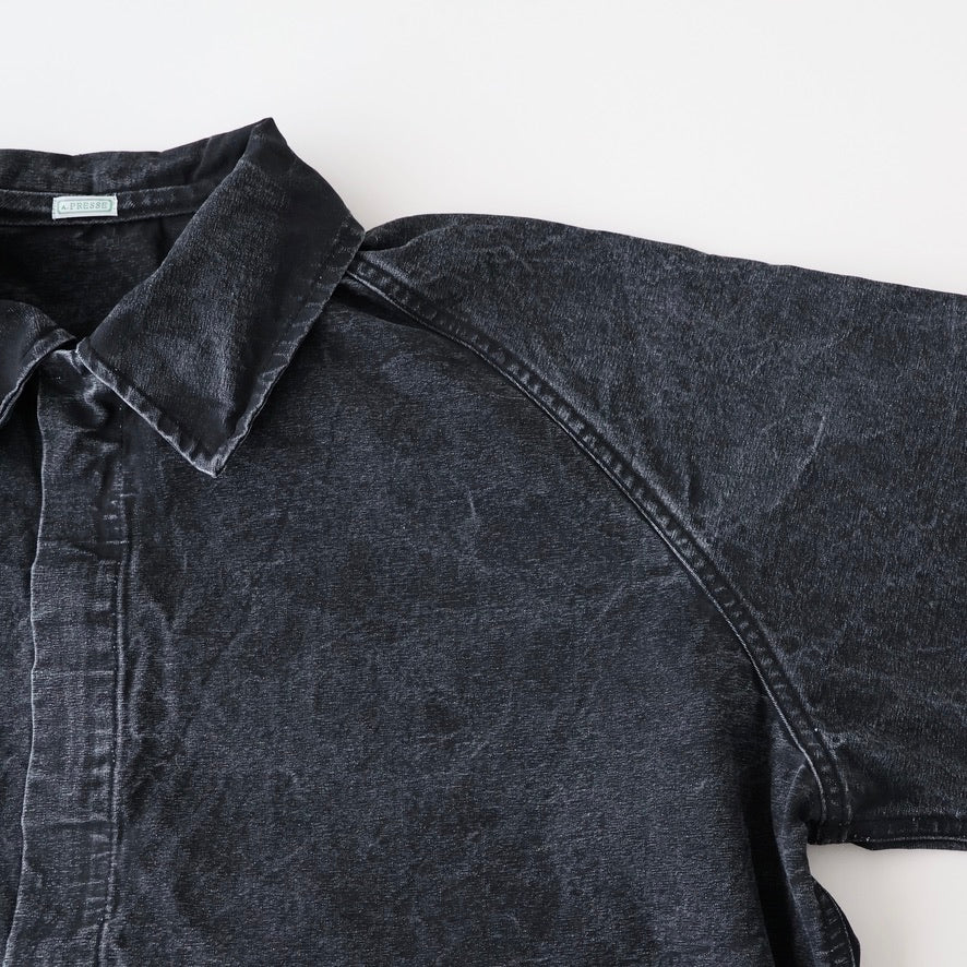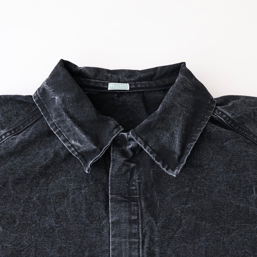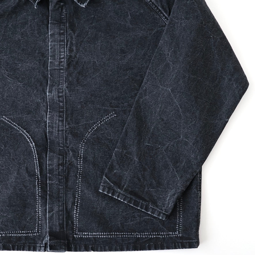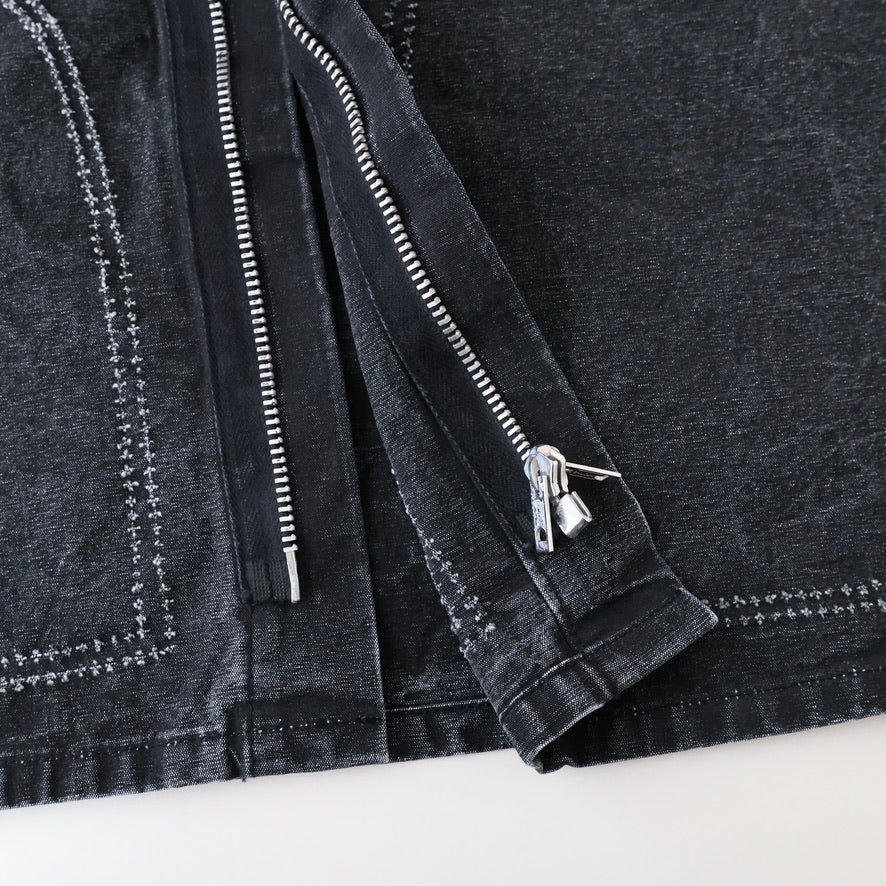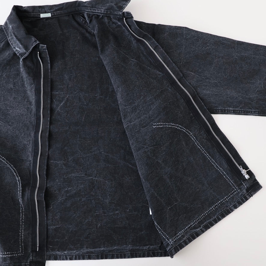 特殊な加工により生地にランダムなスレやアタリを出し、製品の迫力を出した。デニムの様に着込むことで経年変化する。