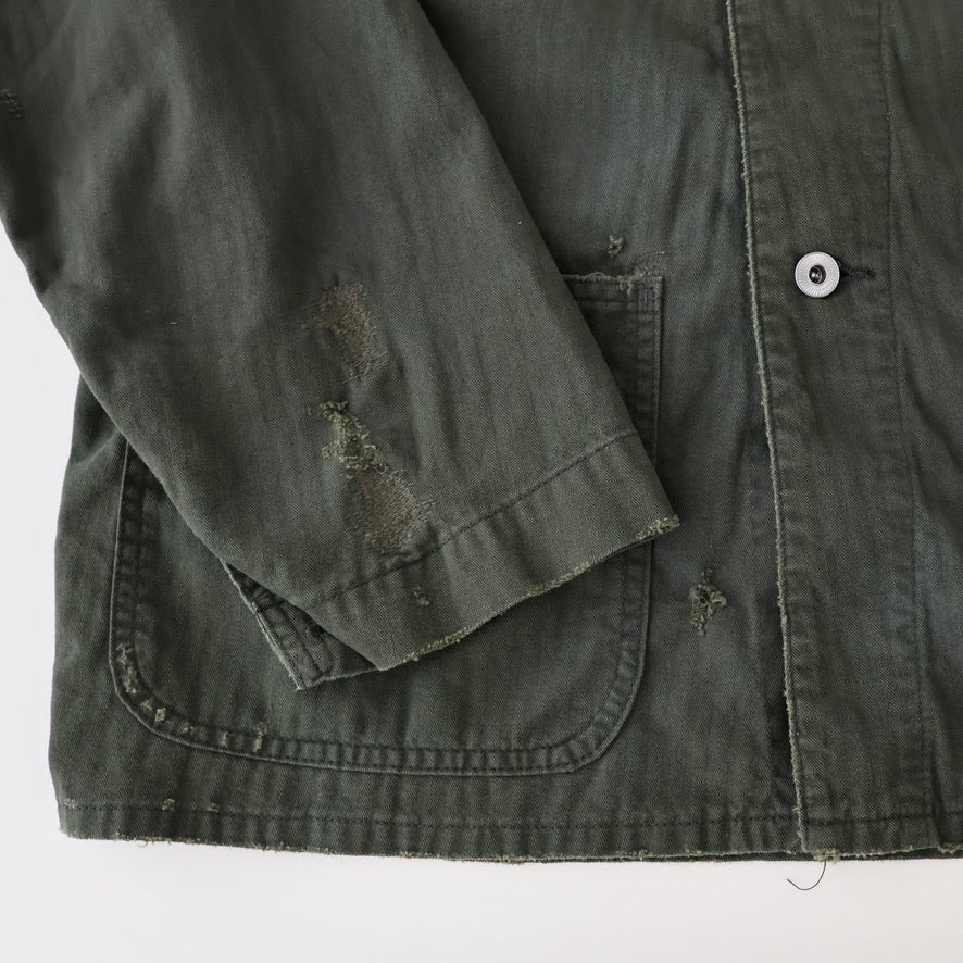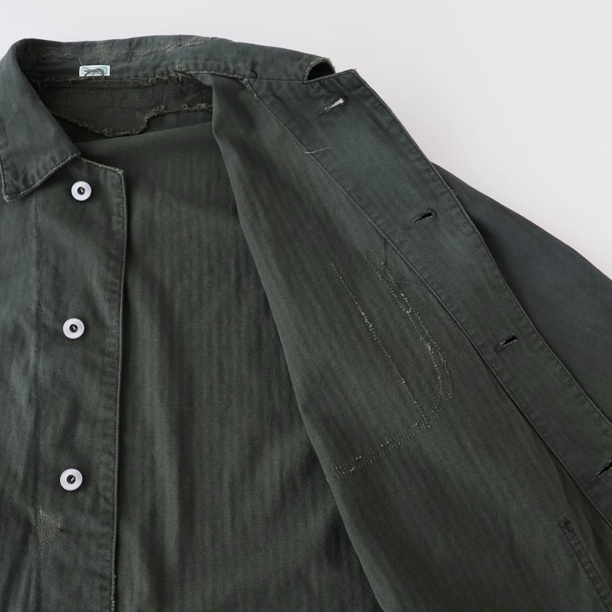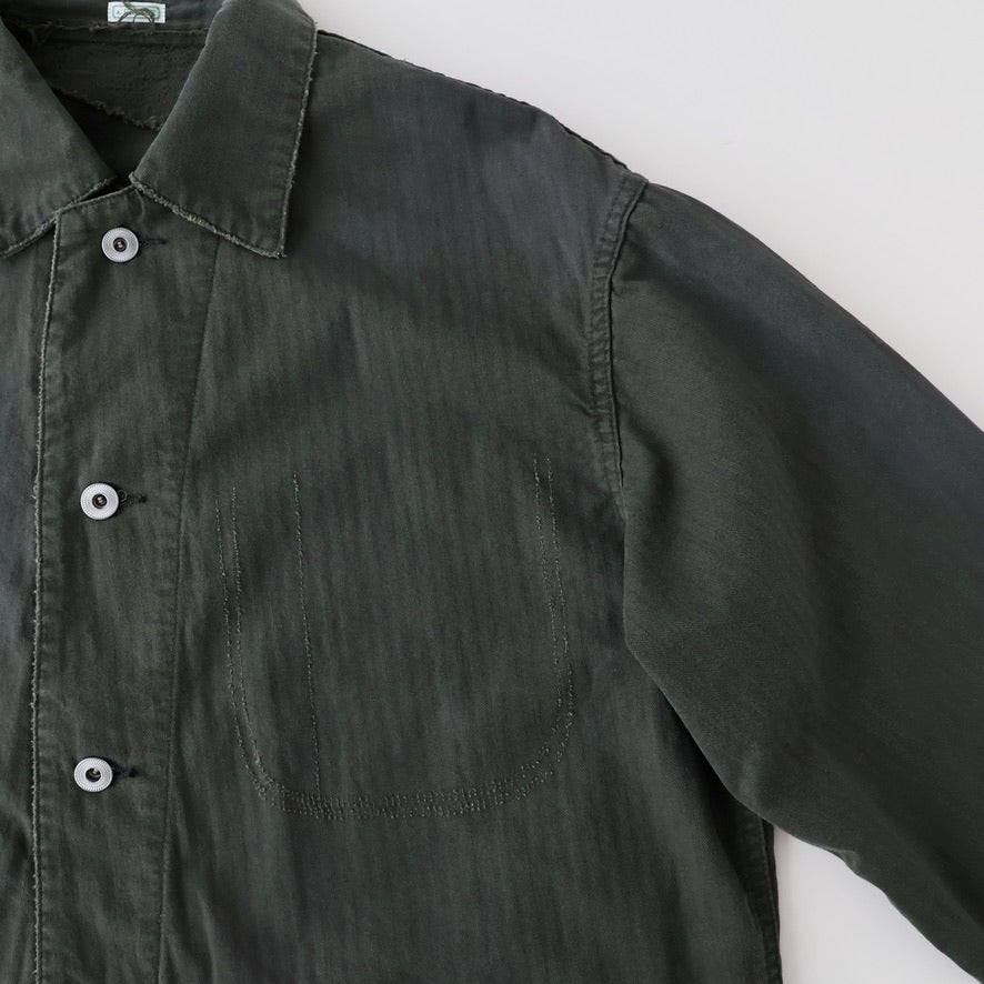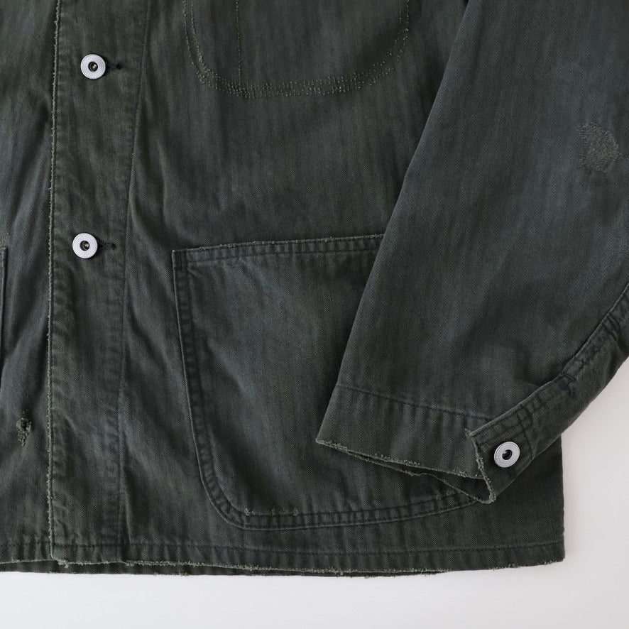 表地は経糸に綿の中太の単糸、緯糸には綿のムラ糸を使用し、広すぎず狭すぎないヘリ ンボーンのパターンピッチを採用。硫化染料で深いOLIVE に染めた後にヴィンテージ加工を施 し、緯糸のムラ糸が自然なヴィンテージ感が出る様に仕上げた。