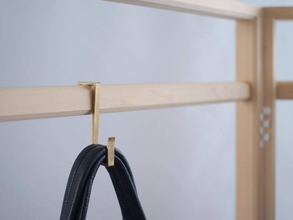 木製品の衣桁に真鍮の鉤がよく栄えます。ハンガーをかけることはもちろん、ジャケットやパンツをそのままかけることも可能です。また、バッグやアクセサリー、キーホルダーをかけることも。幅さえ合えばどこにでもご利用いただけます。かけやすく、外しやすくするため、両端を少し外側に反らした構造に。