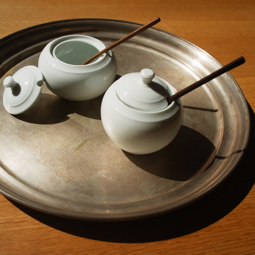 長崎県波佐見町、白岳窯で一つ一つ丁寧に製造されました。線の美しいデザイン、丸みのあるフォルムはどんなカトラリーやテーブルウェアと並んでも邪魔をしません。サイズは2種類。平たい方には七味、丸い方には山椒を入れる等、大きさ別に色々な薬味を分けていれるのも楽しい。また、幾つか並べる際は折敷とセットがおすすめ。テーブルがすっきりと纏まり、アクセントにもなります。
