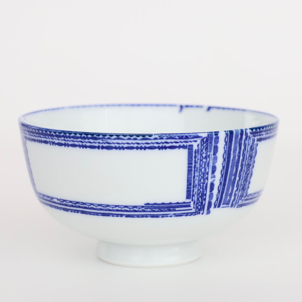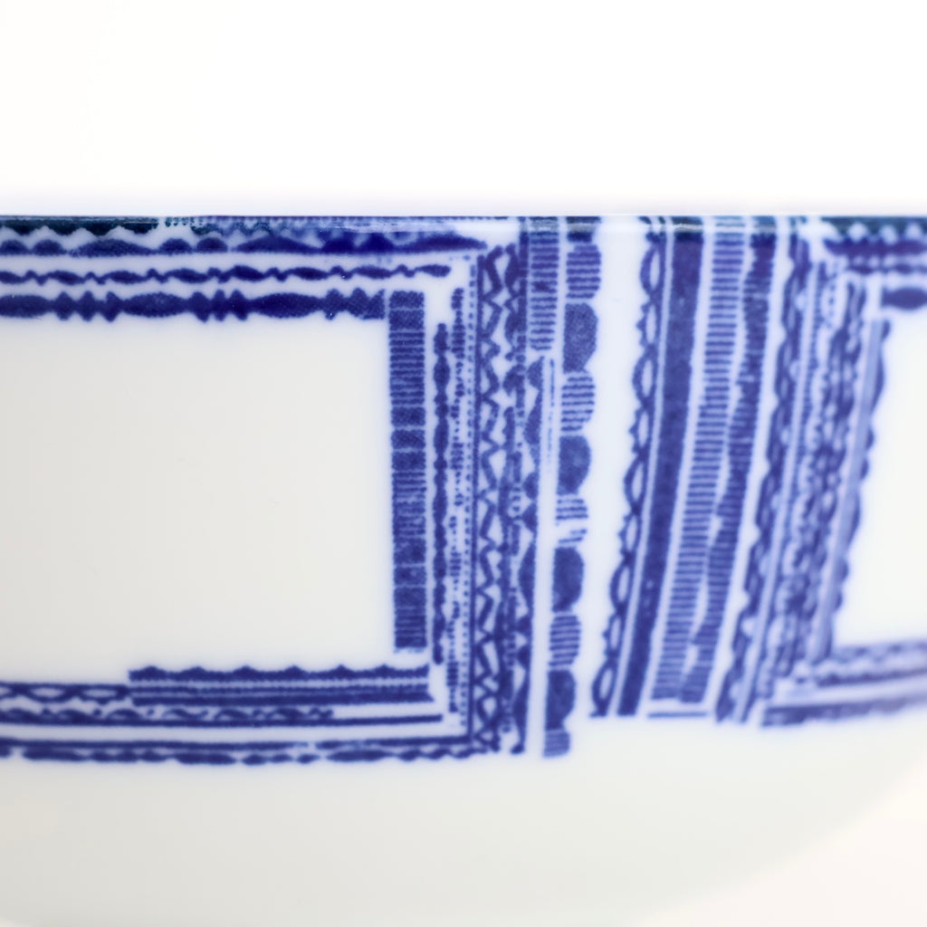 全ての柄は活版印刷の版を組み合わせてできています。江戸時代から続く印刷の手法で、焼き上がると爽やかな青色になる呉須という染料を使い、手作業で磁器へ転写します。ズレや滲みも含めた大量生産にはない不均一さが風合いとなっていきます。