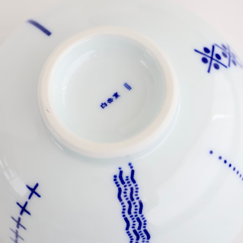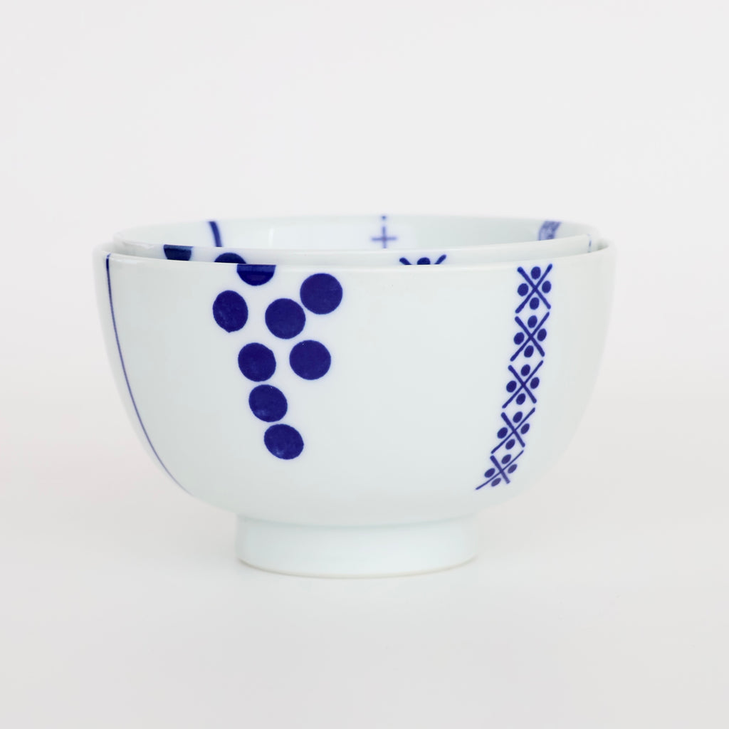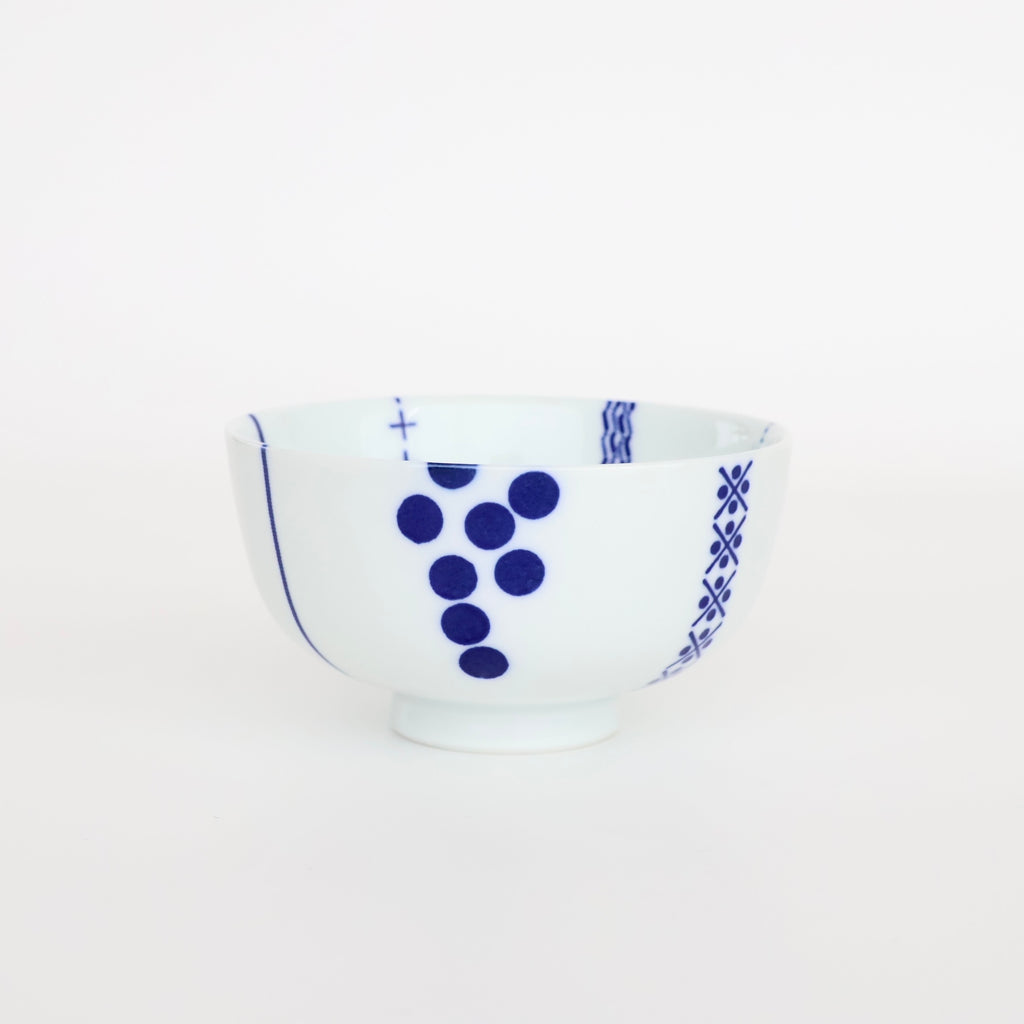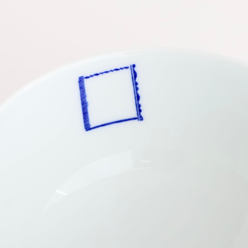 藍青色の文様が、真っ白な天草の磁器に映える印判。文様はアーティスト立花文穂さんのデザインです。