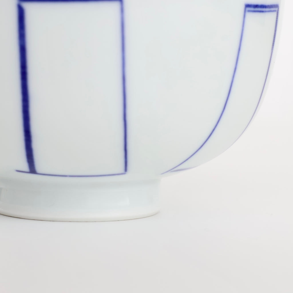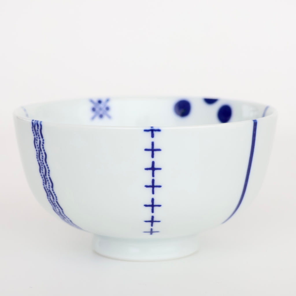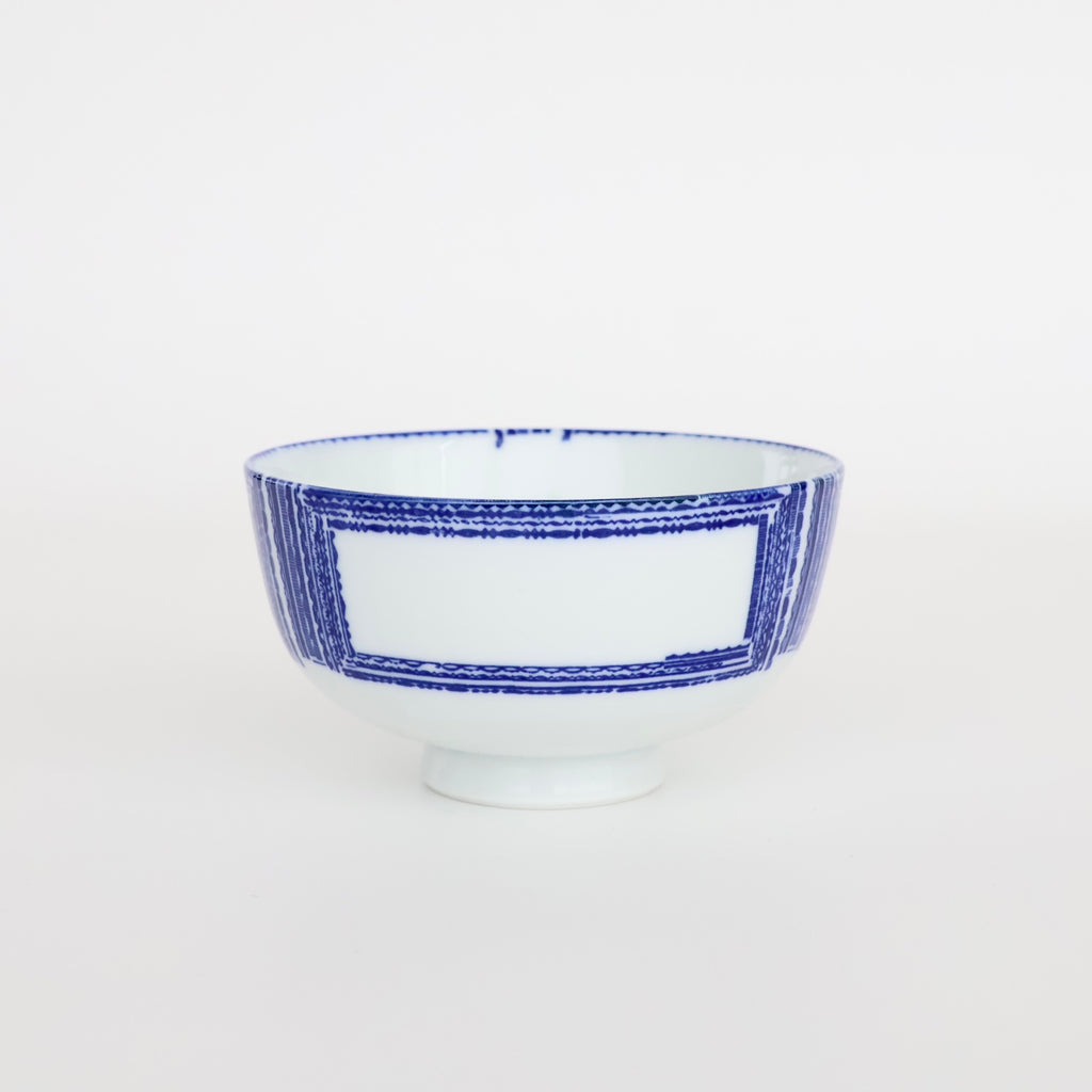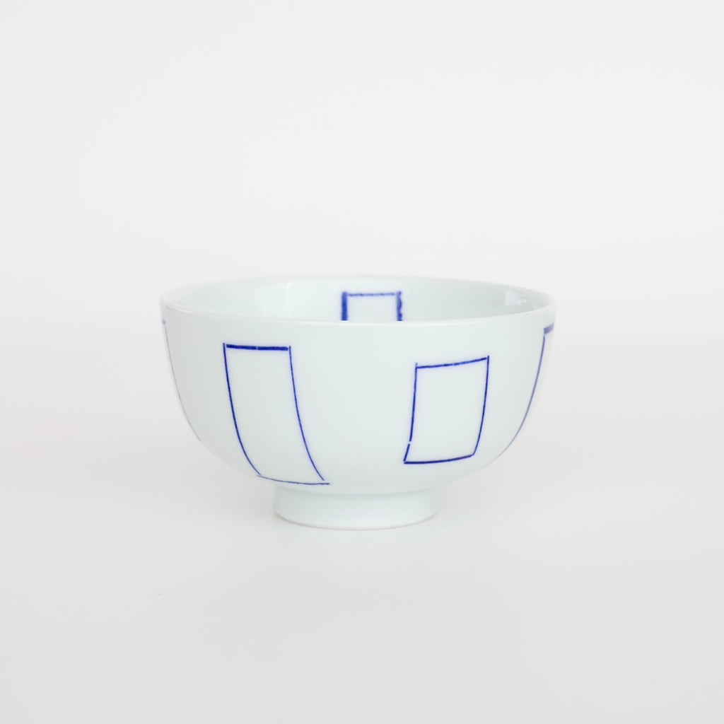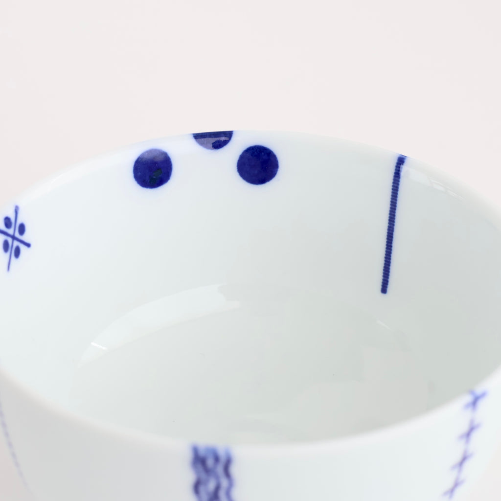 藍青色の文様が、真っ白な天草の磁器に映える印判。文様はアーティスト立花文穂さんのデザインです。