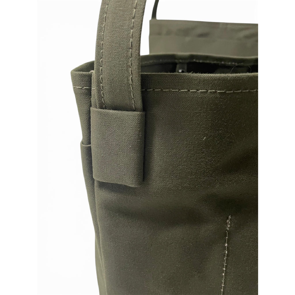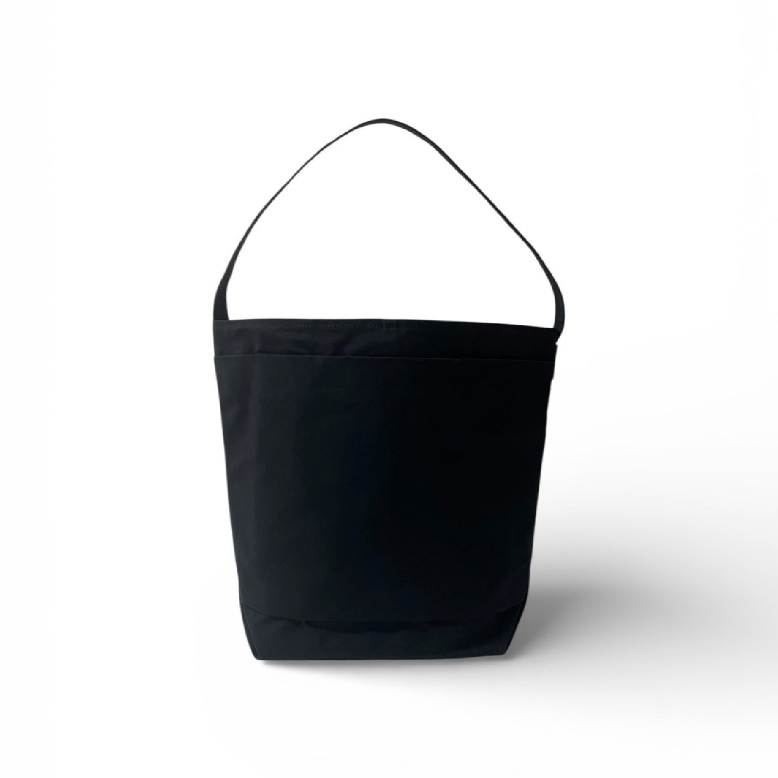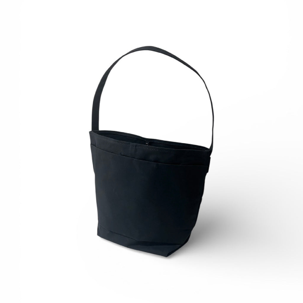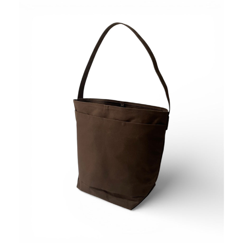 底マチをワイドに設けることで十分な容量を確保し、ショルダーストラップとホリゾンタルハンドルを鞄内側に搭載した、デュアルハンドル仕様のバケツ型トートです。