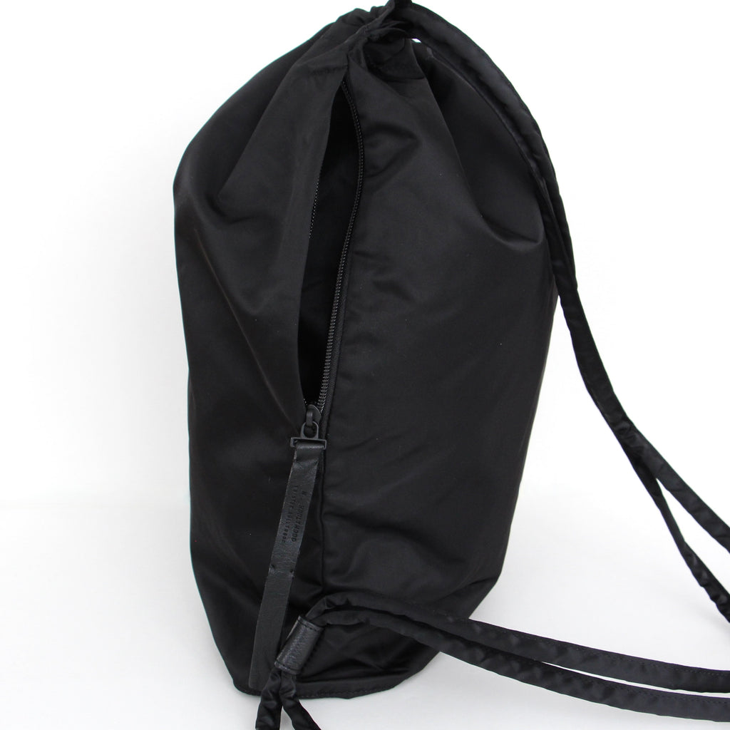 ・ロープは本体と共生地で製作。外ポケットはサイドアクセス仕様で、ブランドロゴを刻印した引き手を採用したオリジナルのファスナー付き。レザーのタブの内側にナイロン生地を付けることで、耐久性をアップ。サイドに両ブランドのブランドネームを配置。