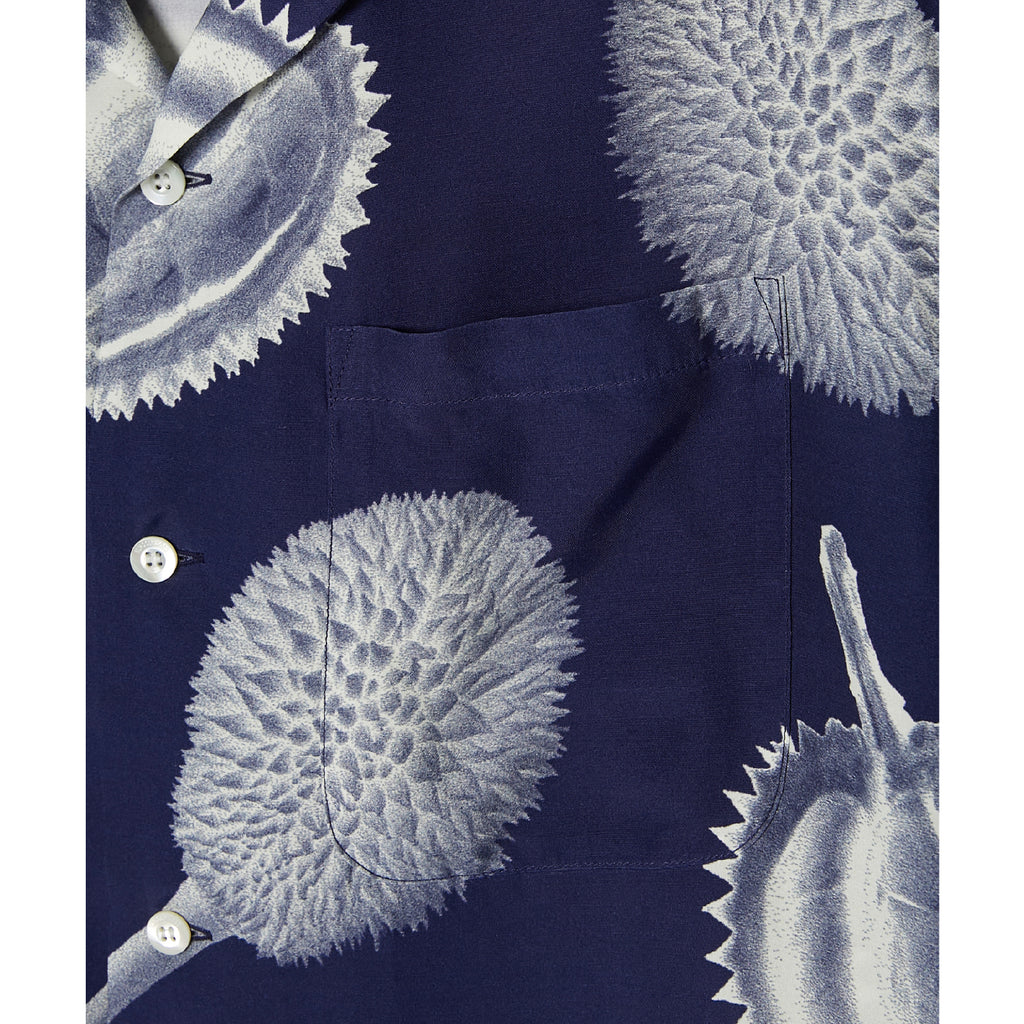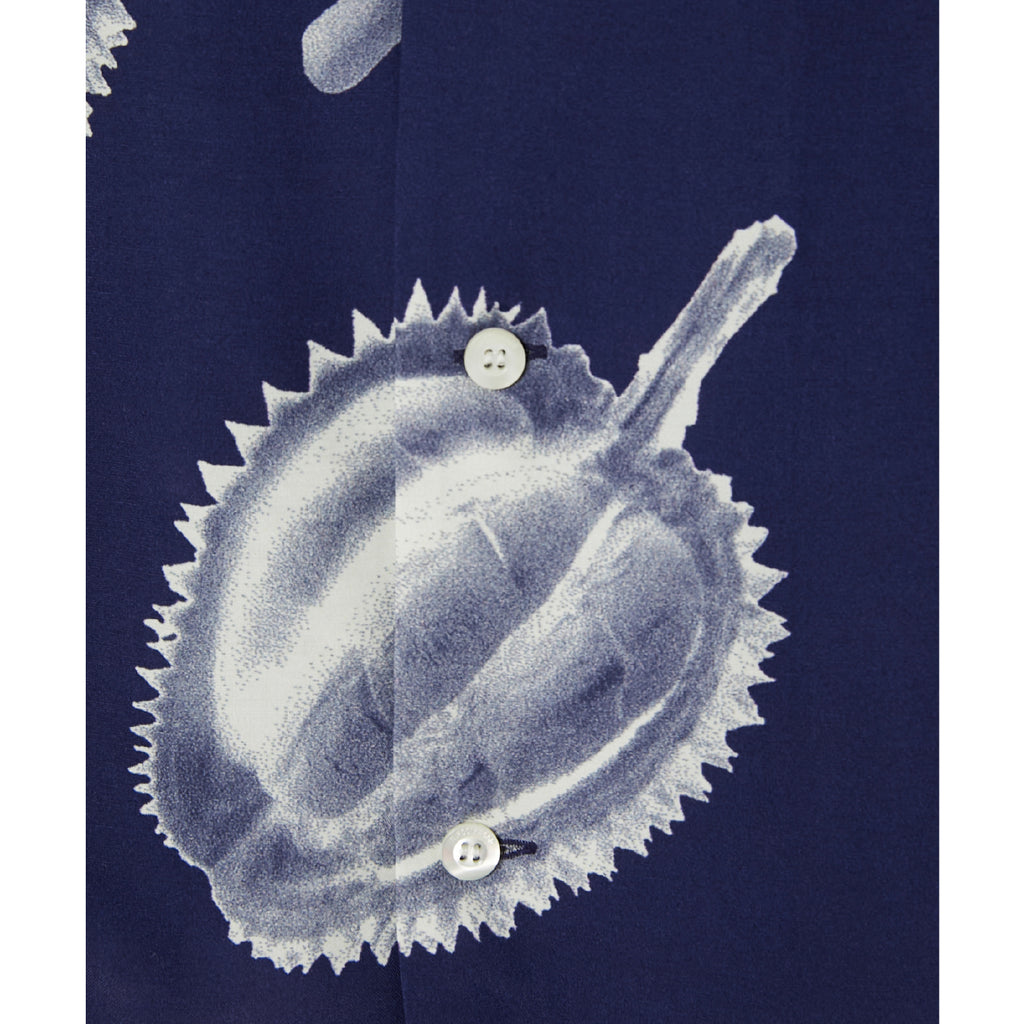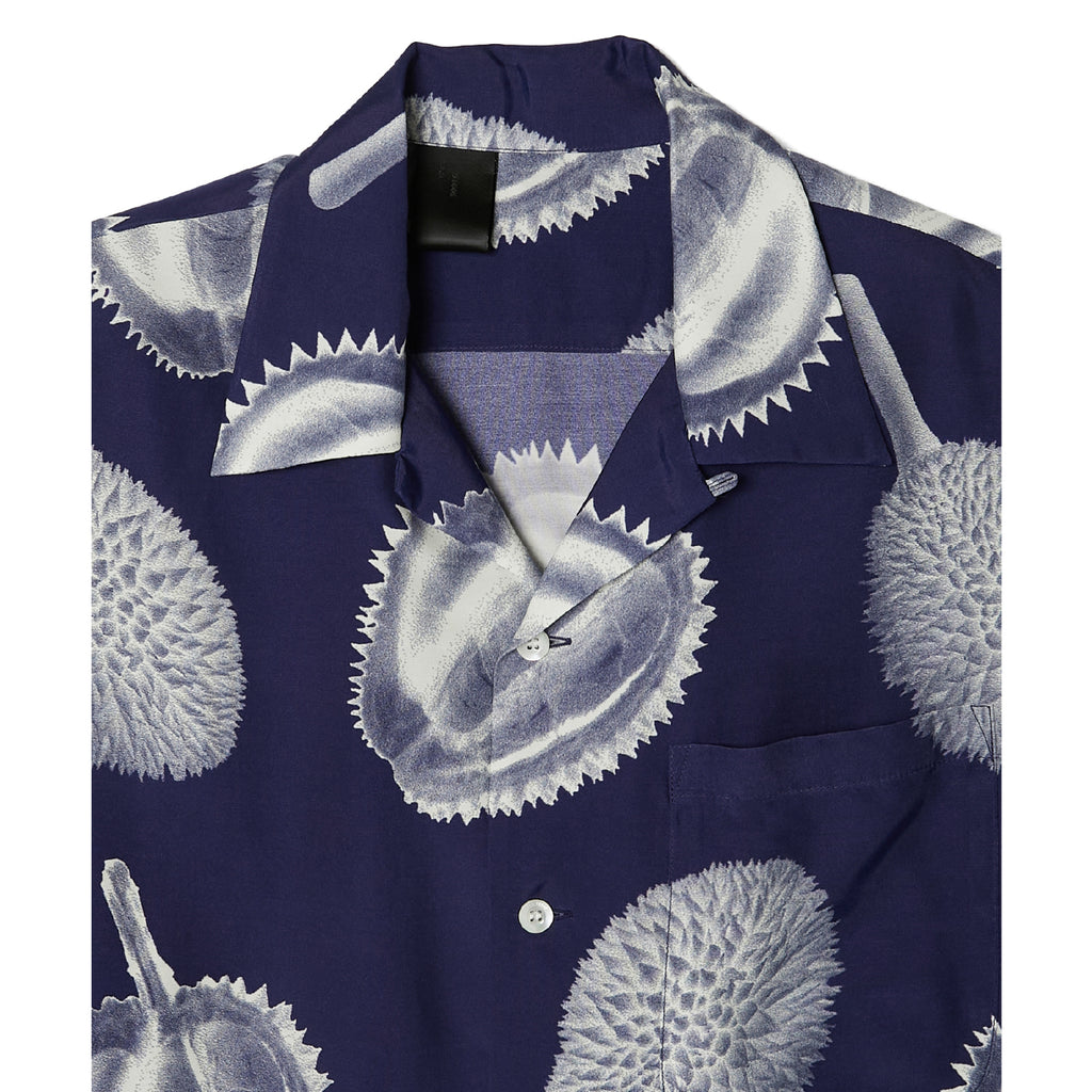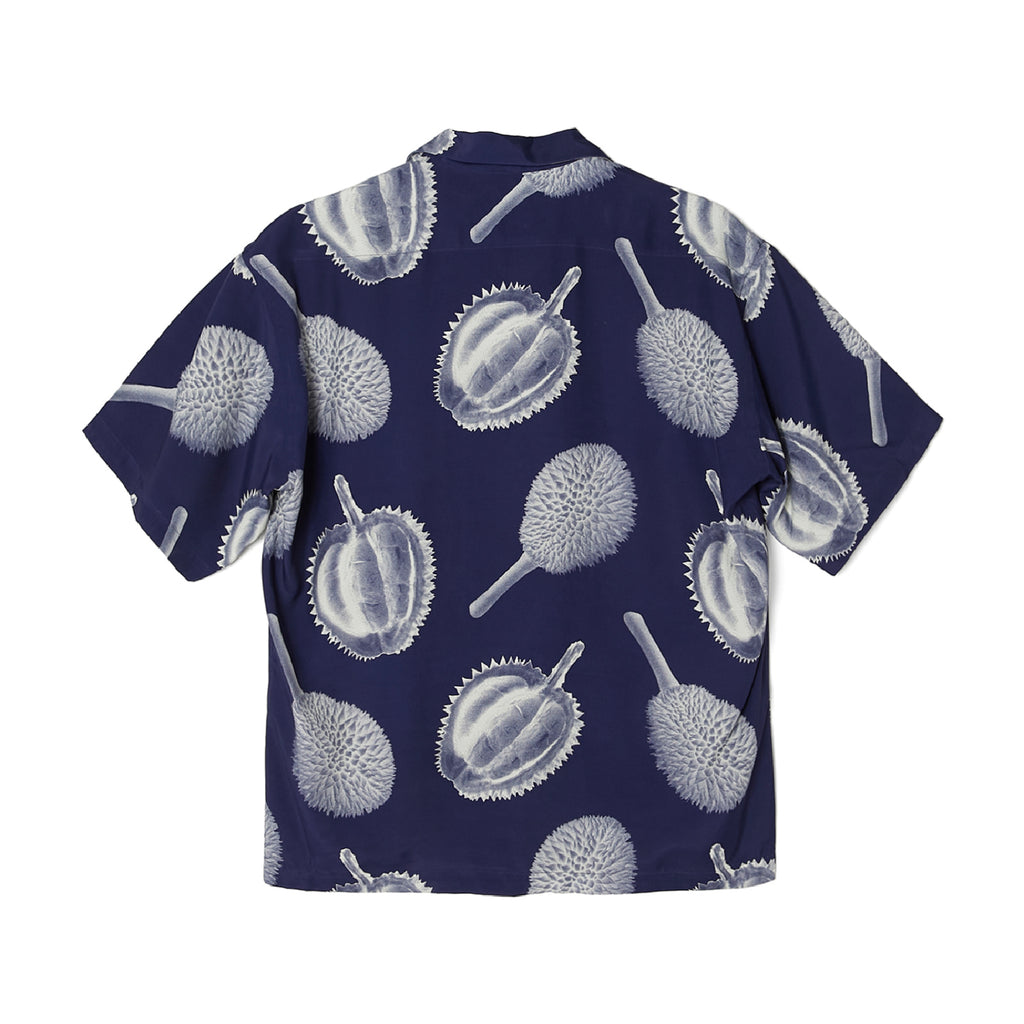 ・ドロップショルダー、ボックスシルエットのゆったりしたサイジング。ドレープが高級感のあるレーヨン素材。ドリアンの刺々しいヴィジュアルや断面が、写実的に描かれた総柄。
