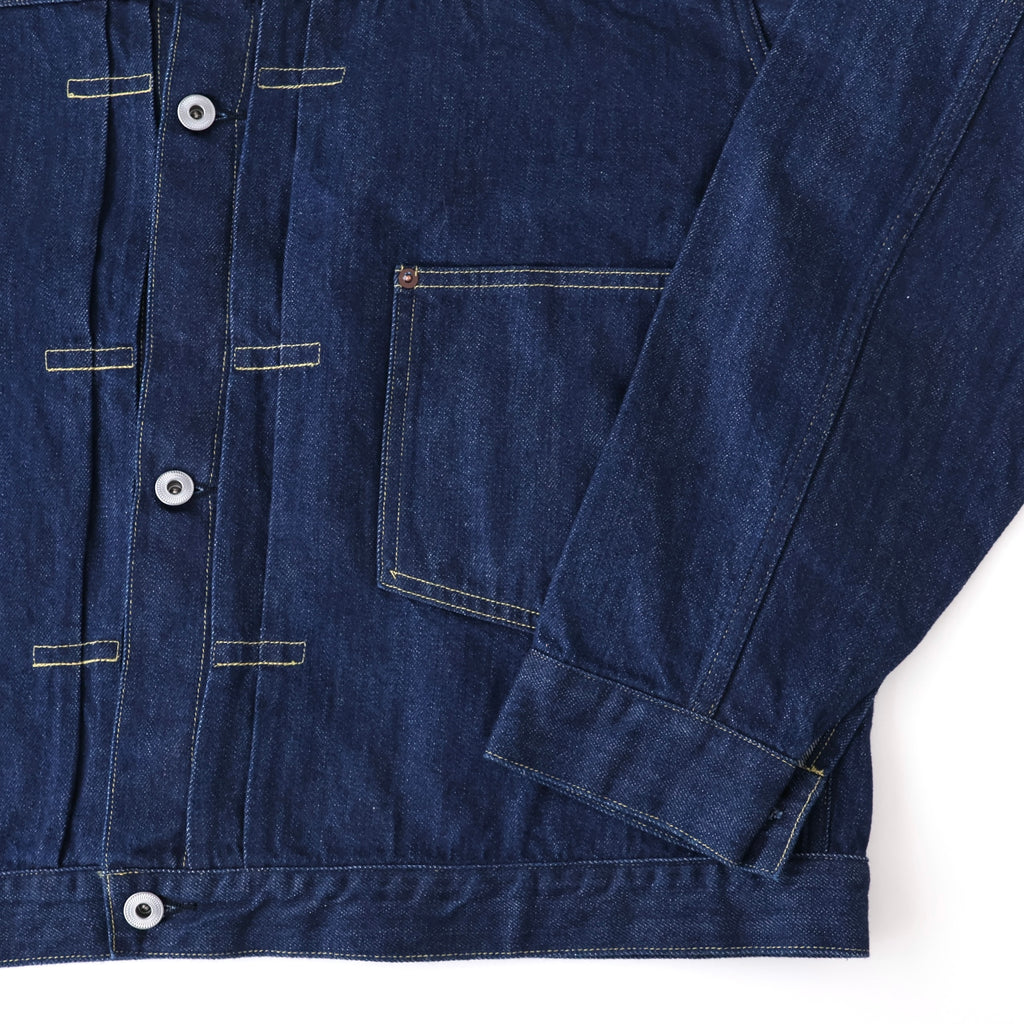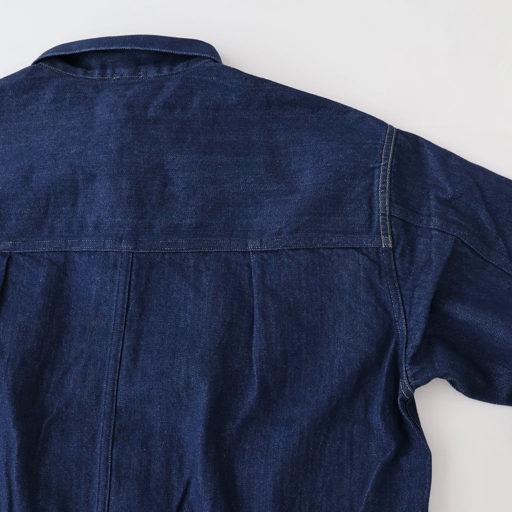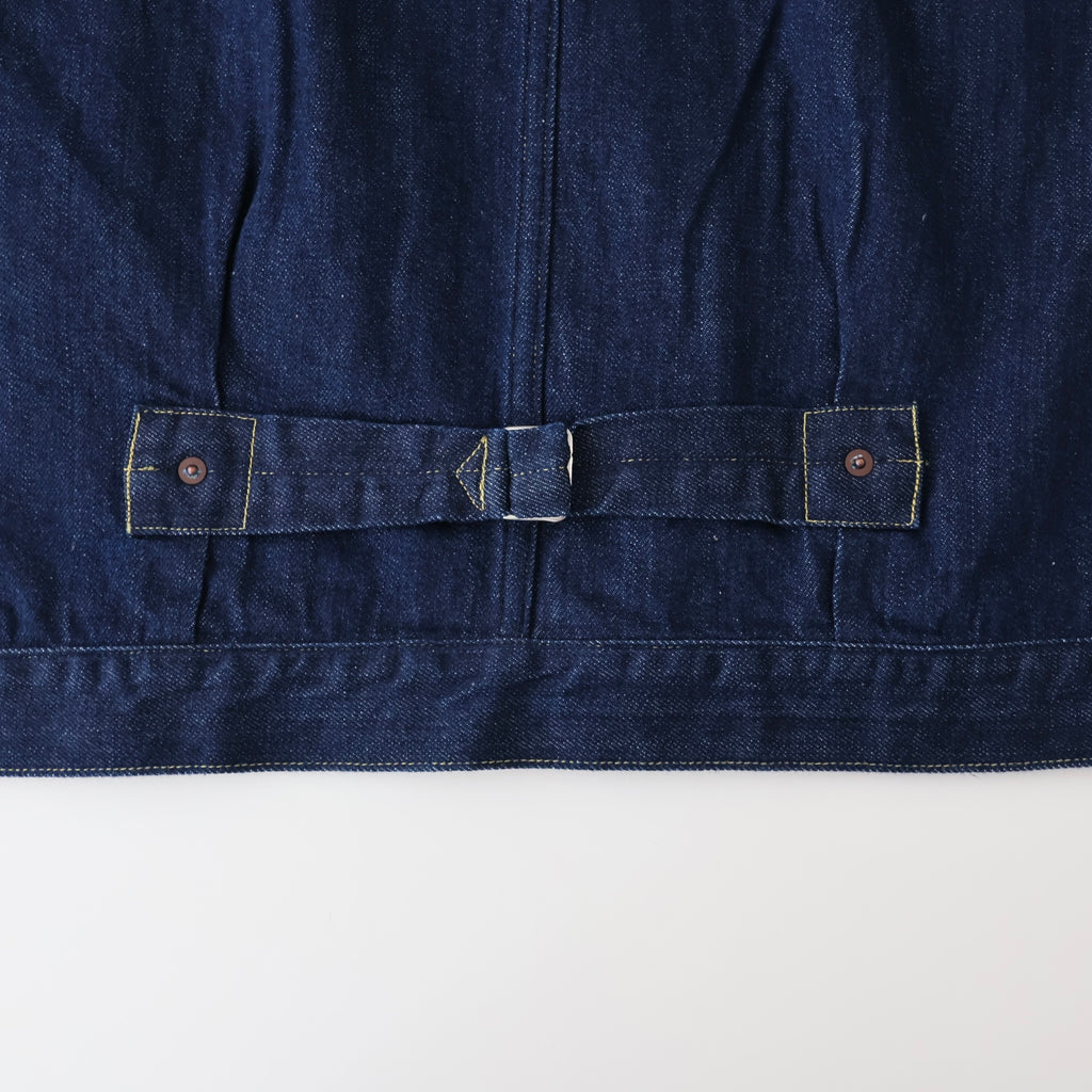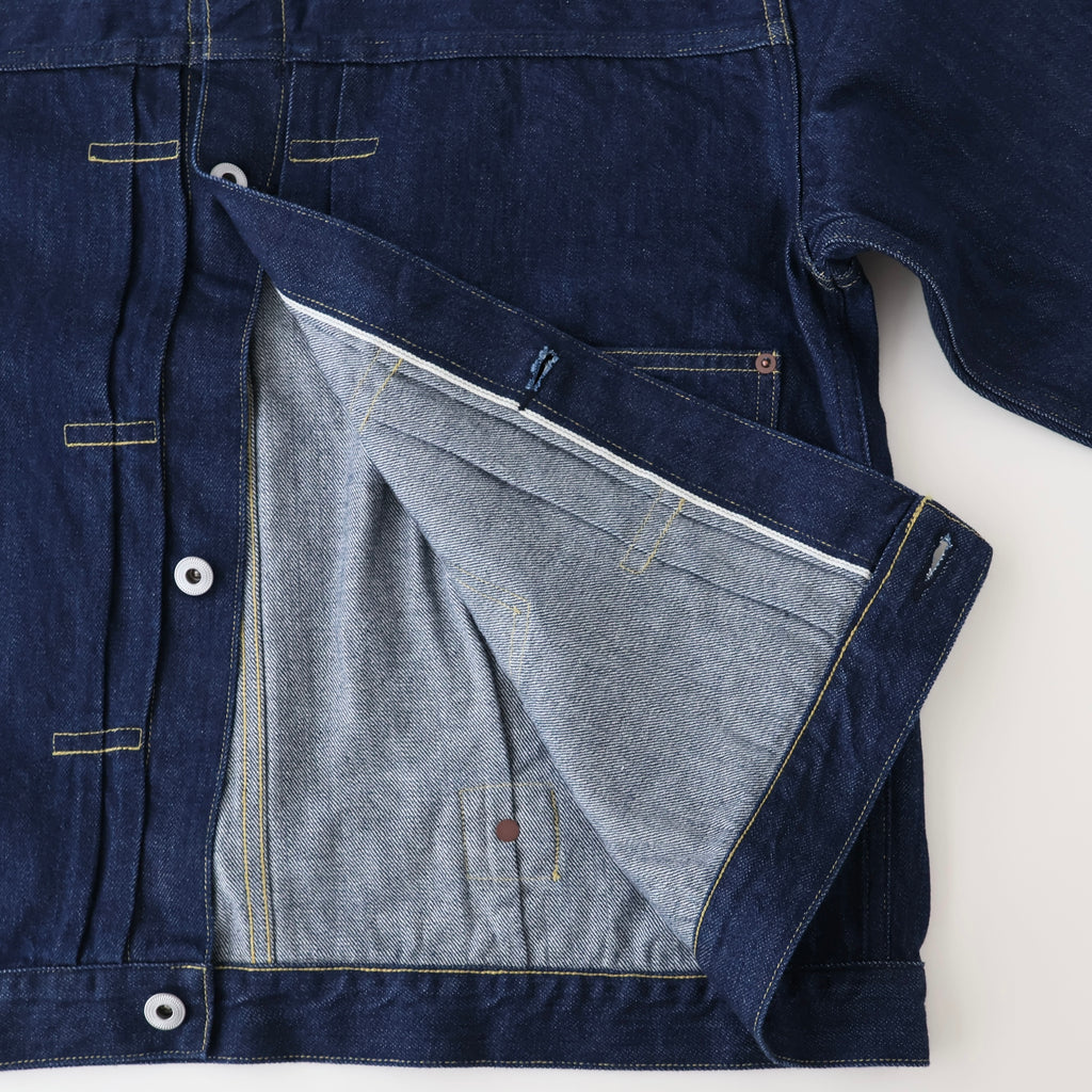 表地は不均一なムラ形状を、複数種の異形状の糸をミキシングして織ることで表現した。幾度となく研究して導きだしたインディゴの糸染め回数と時間の調整により、この絶妙な色を作り出した。ワンウォッシュ加工。