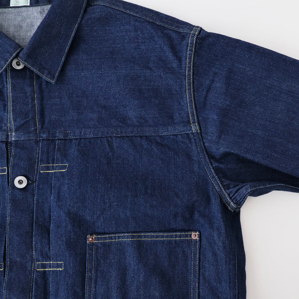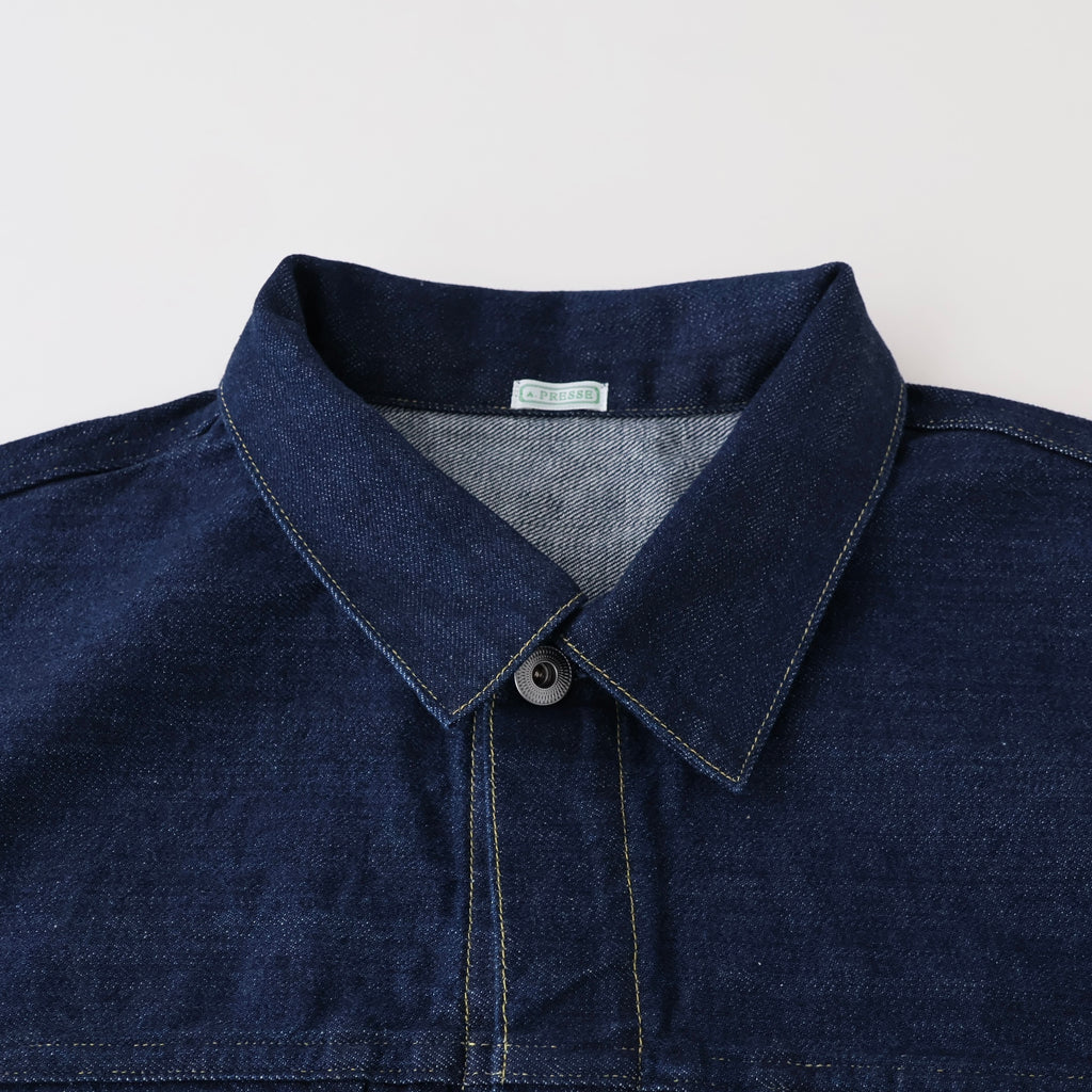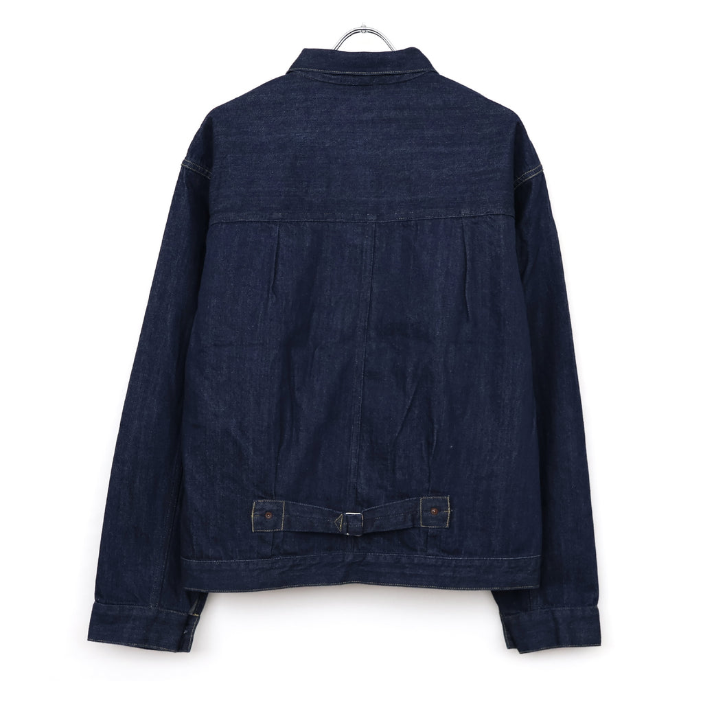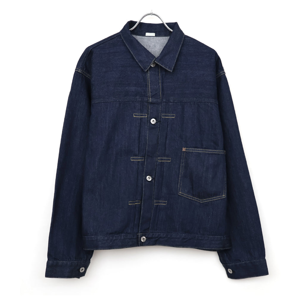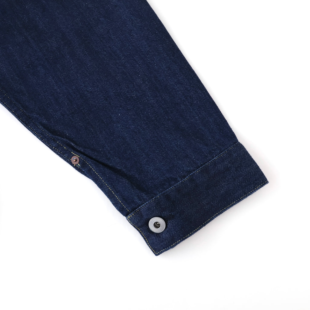 表地は不均一なムラ形状を、複数種の異形状の糸をミキシングして織ることで表現した。幾度となく研究して導きだしたインディゴの糸染め回数と時間の調整により、この絶妙な色を作り出した。ワンウォッシュ加工。