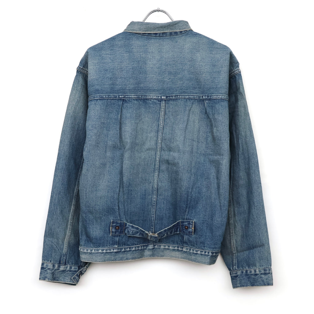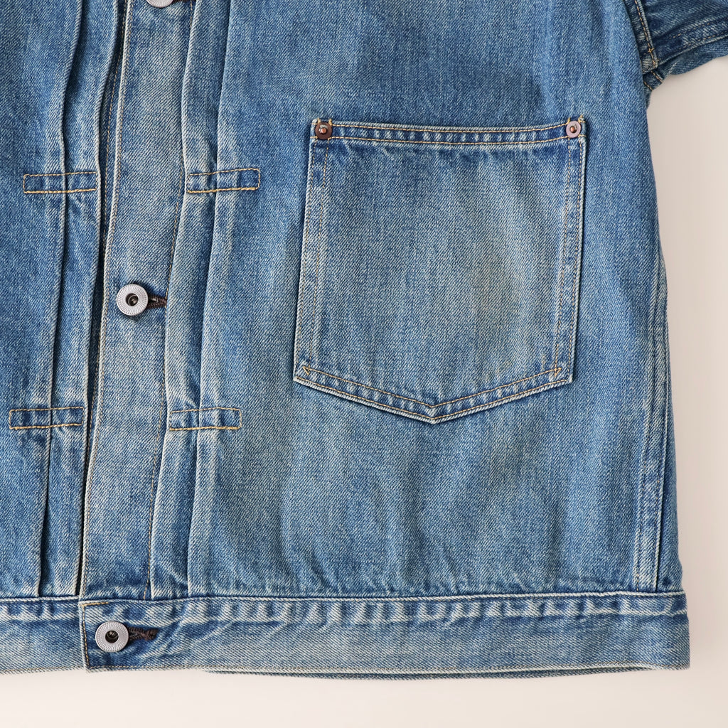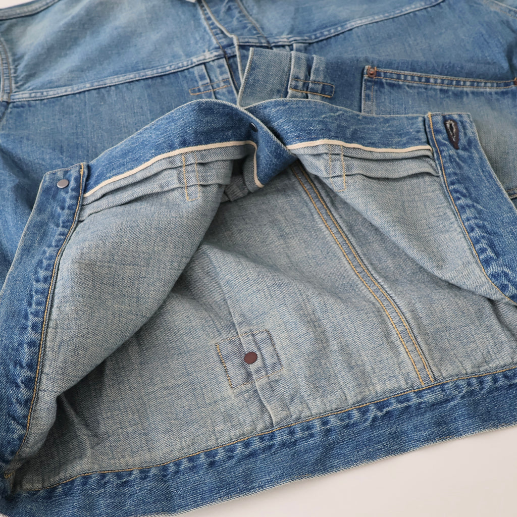 自然な経年変化を、手作業により再現。ヴィンテージを再現した加工感は、耳の色落ちまでこだわり、経年変化での退色したグレーカラーのセルビッチも特徴。