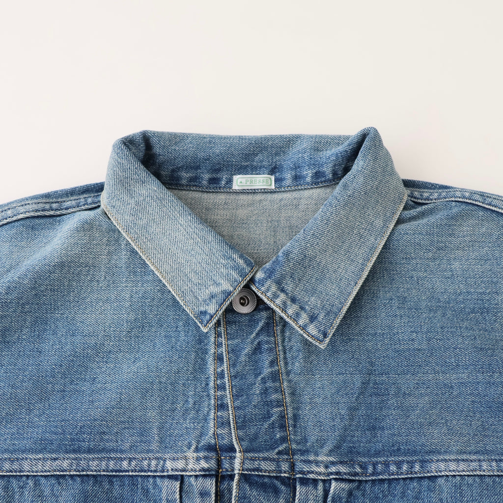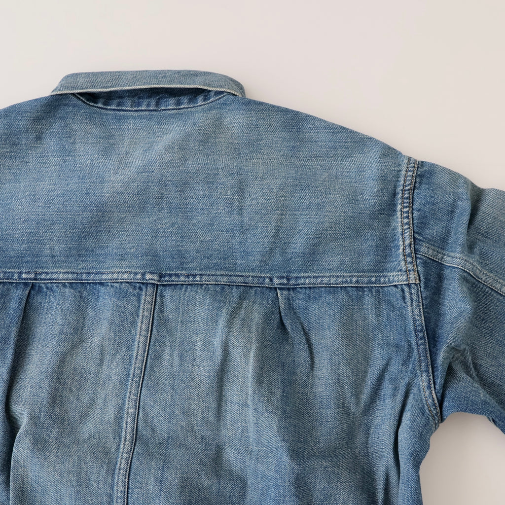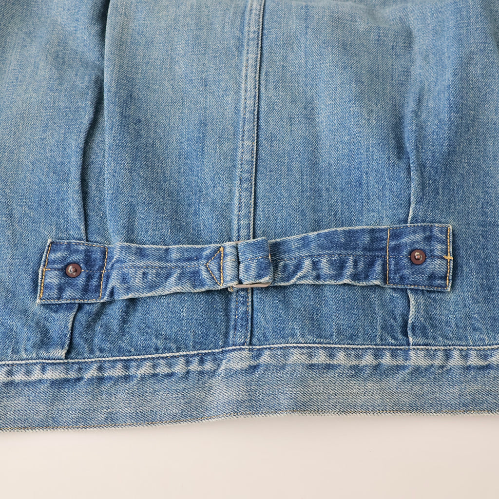 自然な経年変化を、手作業により再現。ヴィンテージを再現した加工感は、耳の色落ちまでこだわり、経年変化での退色したグレーカラーのセルビッチも特徴。