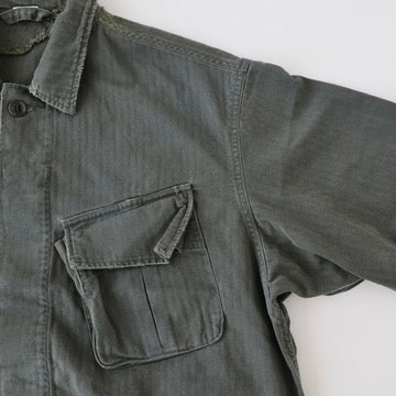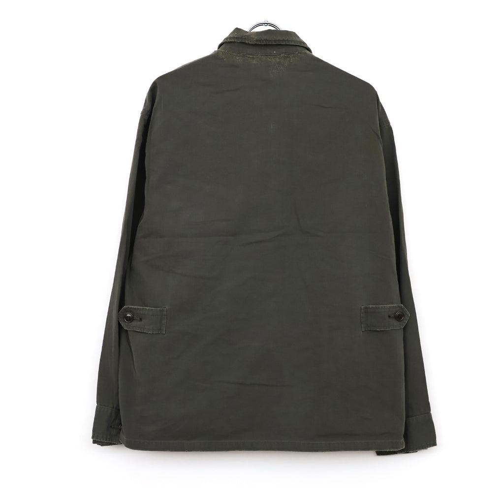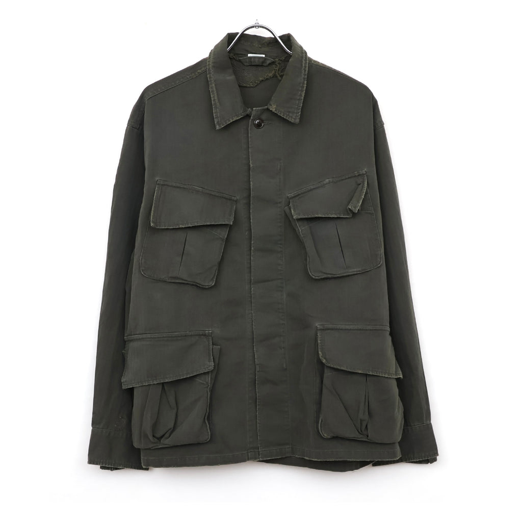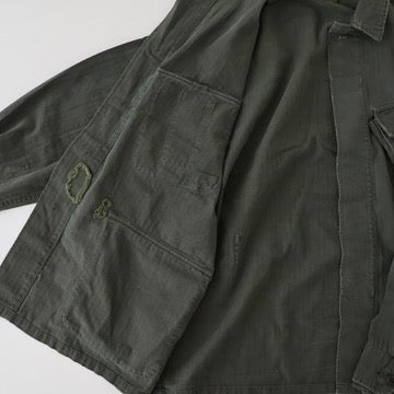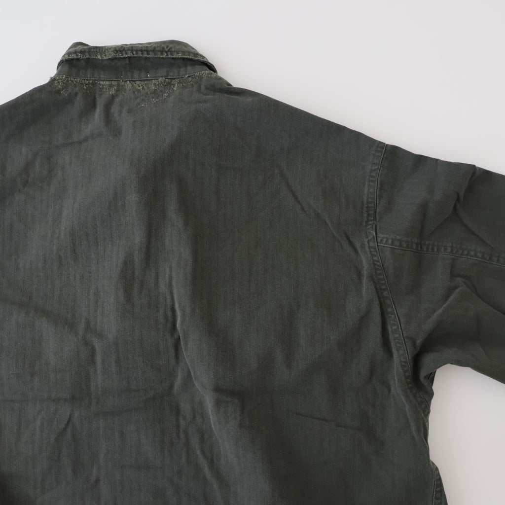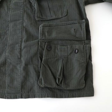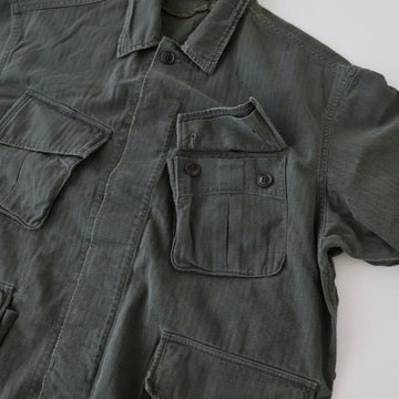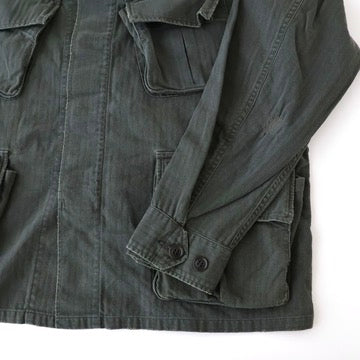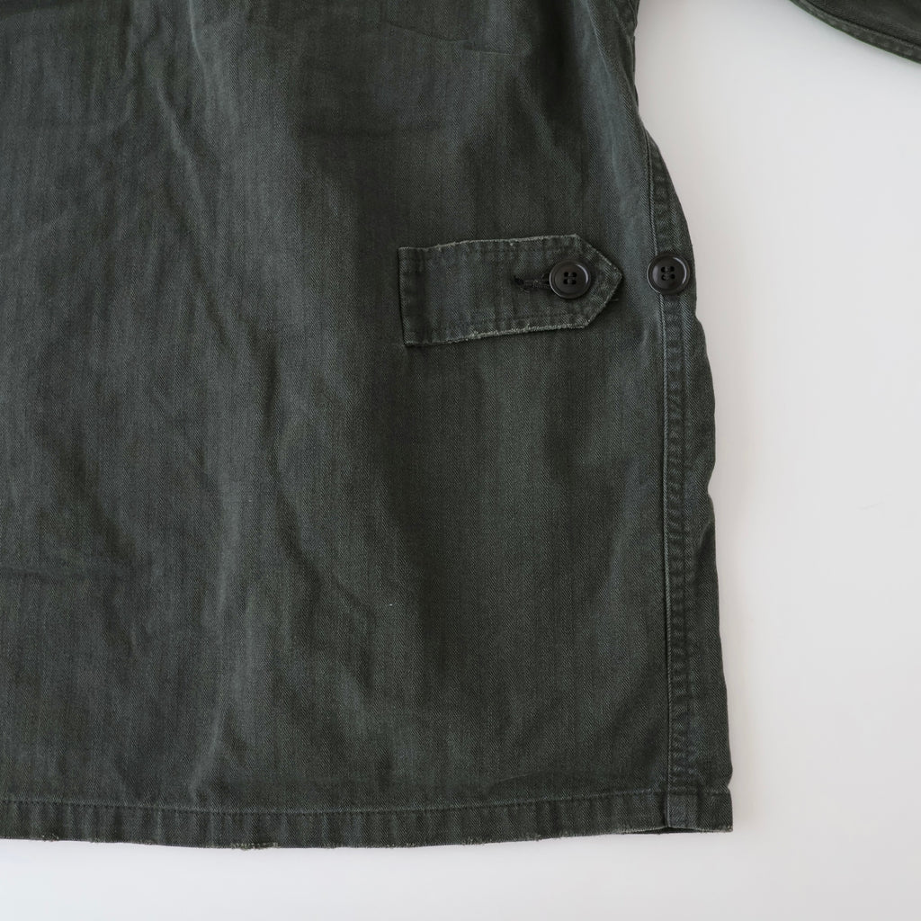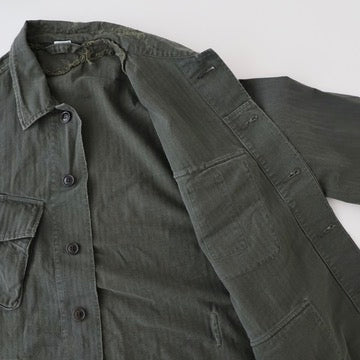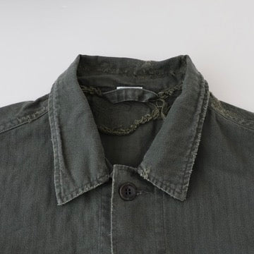 硫化染料で深いオリーブに染めた後に加工を施し、緯糸のムラ糸が自然なヴィンテージ感が出る様に仕上げた。