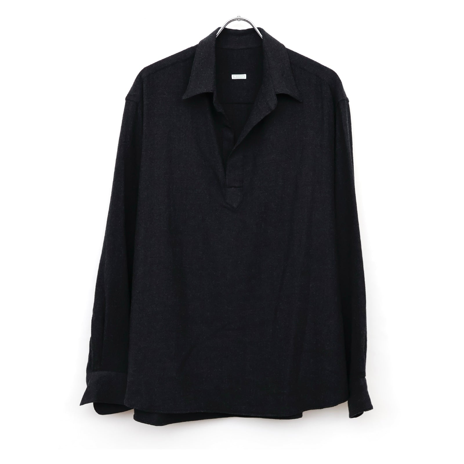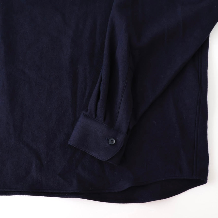 カシミアに匹敵する繊維の細さのsuper180'sメリノ梳毛糸を使用して織り上げたライトフランネル。軽めの縮絨で原料の柔らかさを最大限に活かしたシャツウエイトの上質素材。原料のもつ自然な光沢と、一切痒みの無い滑らかな肌当たりが特徴。