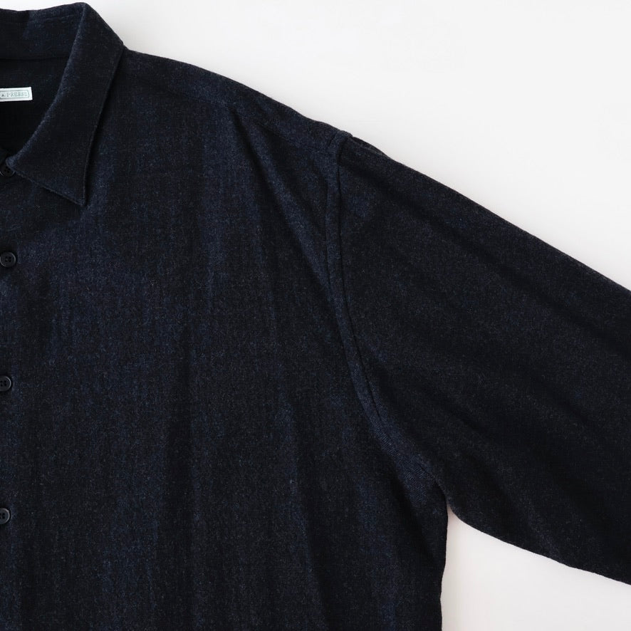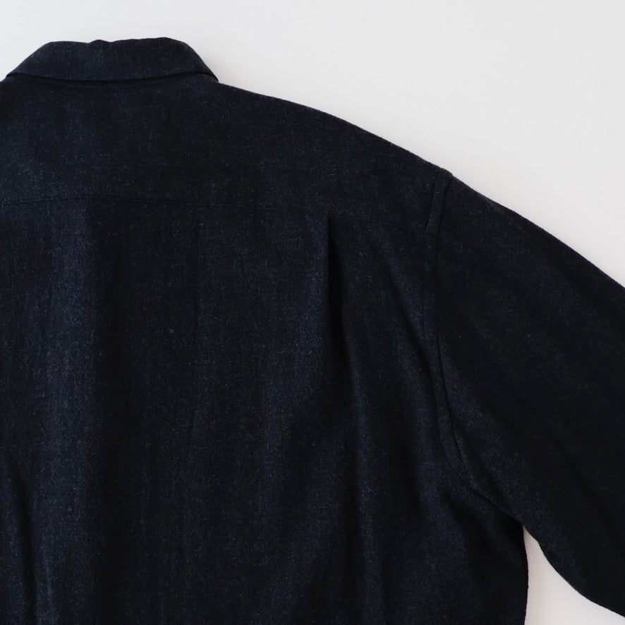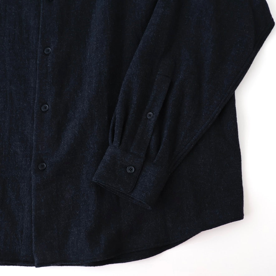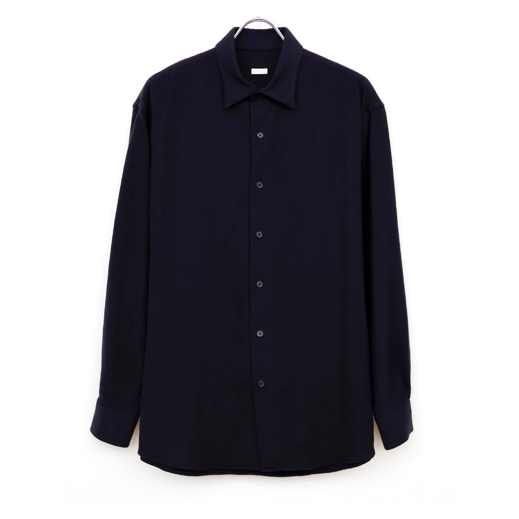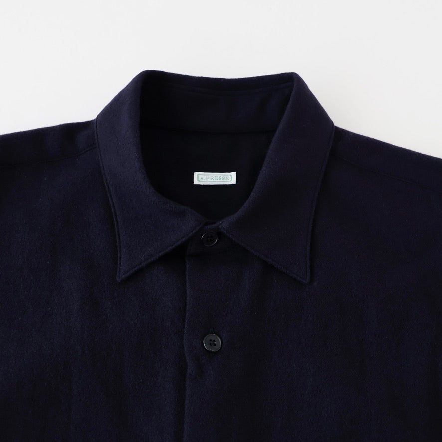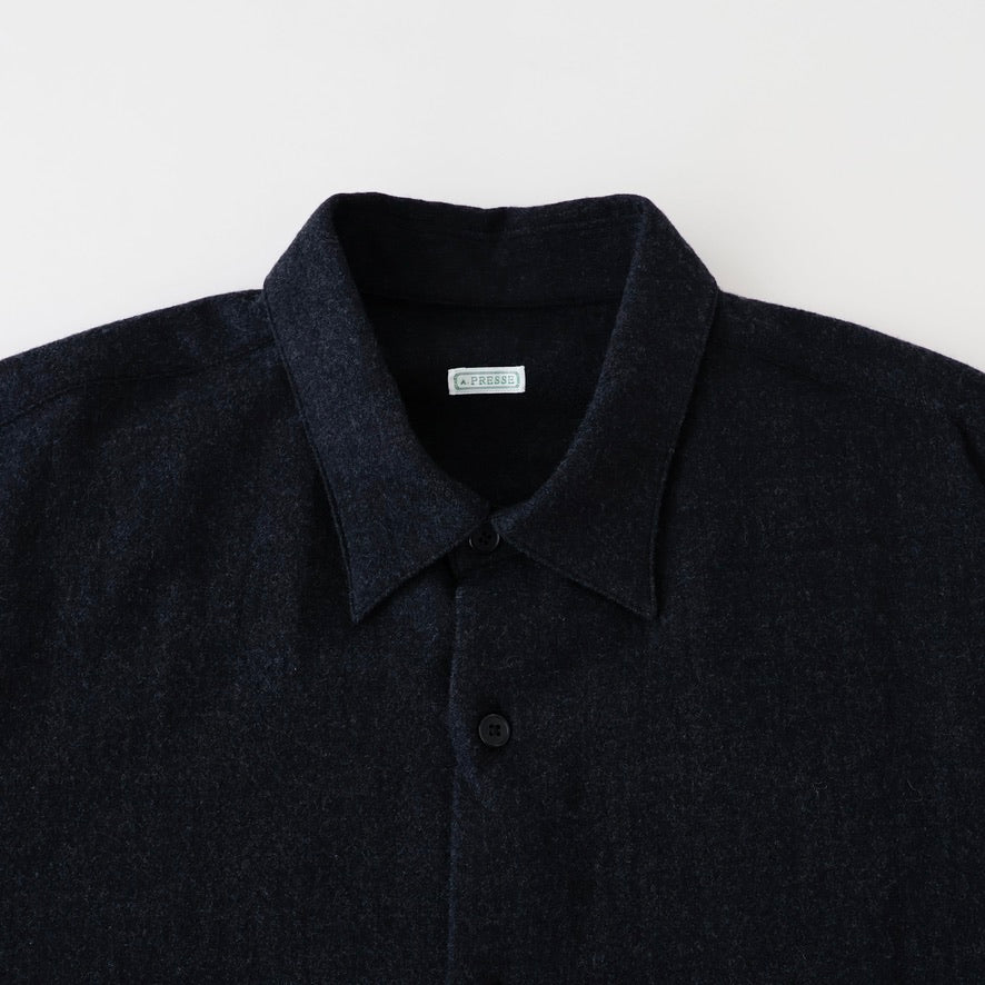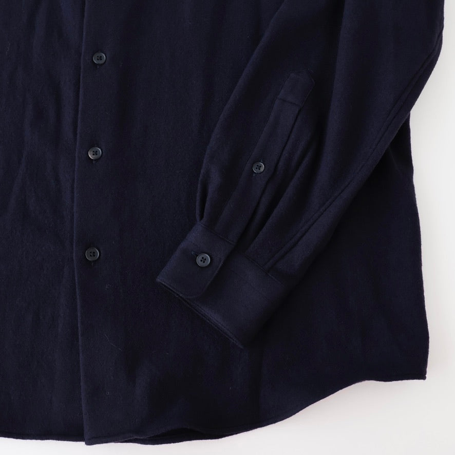 カシミアに匹敵する繊維の細さのsuper180'sメリノ梳毛糸を使用して織り上げたライトフランネル。軽めの縮絨で原料の柔らかさを最大限に活かしたシャツウエイトの上質素。材原料のもつ自然な光沢と、一切痒みの無い滑らかな肌当たりが特徴。
