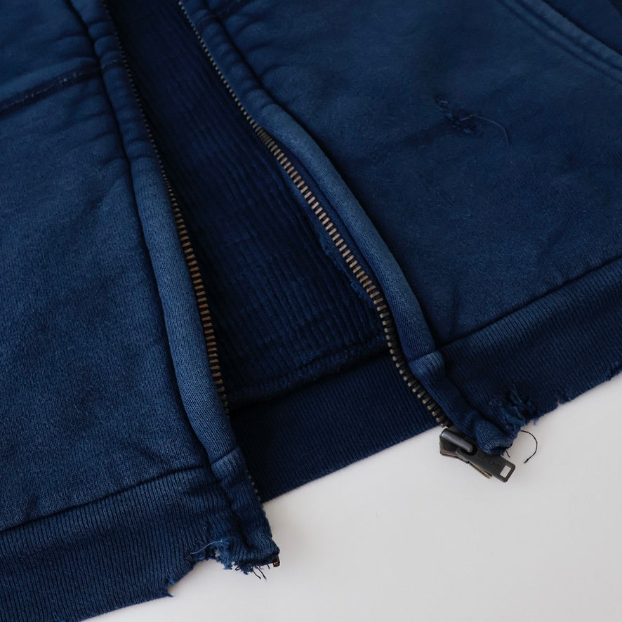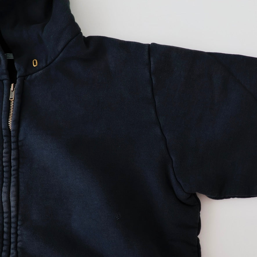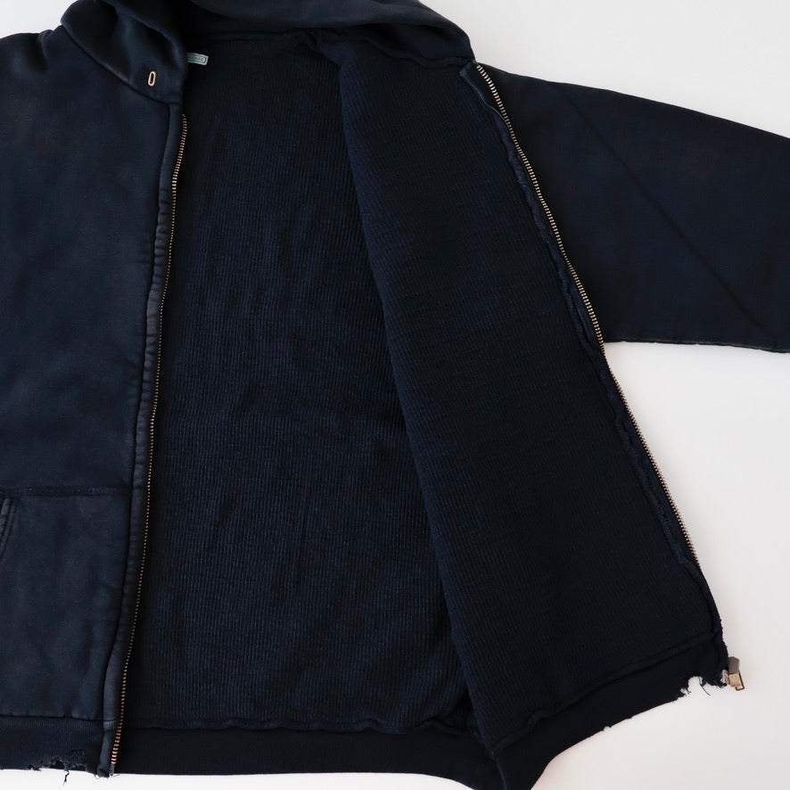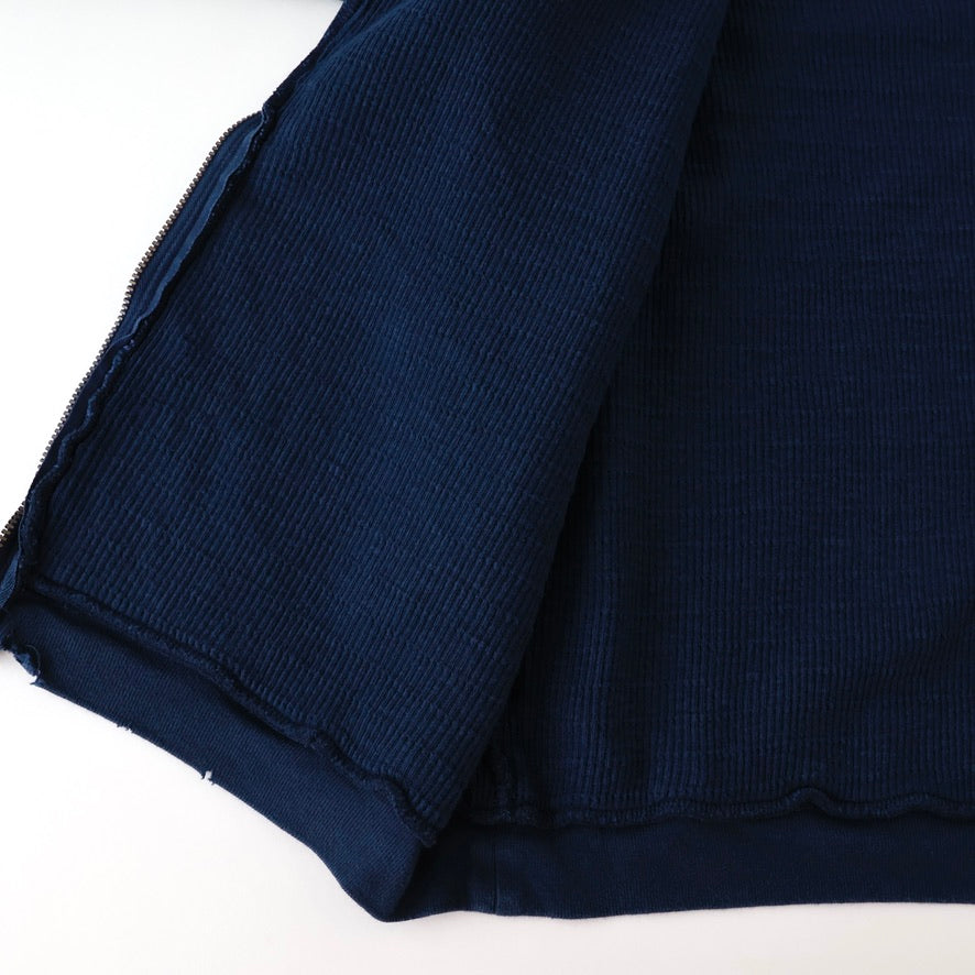 表地はヴィンテージを解析して作った吊り裏毛、1時間に1メートルというゆっくりとしたスピードでしか編み立てられないが、糸に余計な負荷を掛けないで編み上げることで、肉厚ながら固くならず、ふっくらとした風合いで仕上げた。裏サーマルもヴィンテージを解析し作成。