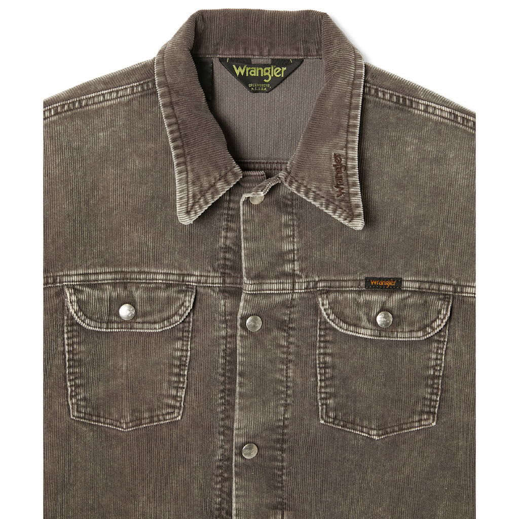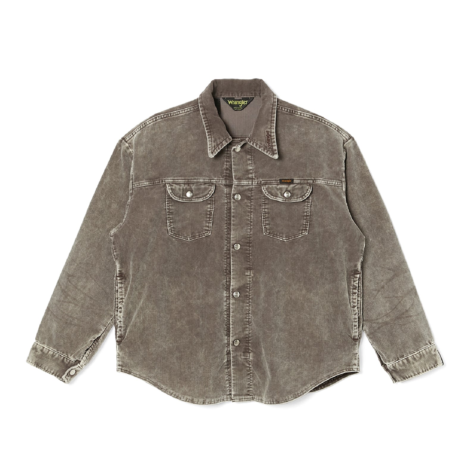 ・身幅を広げリラックスしたシルエットに変更。襟は程よいロングポイントにデザインし、70年代の雰囲気を踏襲。両胸のフラップポケットに加え、シームポケットを配置。フロントにはWranglerオリジナルのドットボタンを使用。襟羽にWranglerのロゴを同色でエンブロイド。胸元にWrangleのネーム、襟吊りにコラボレーション専用のネームを配し、左袖にはN.HOOLYWOOD COMPILEのアイコンであるブラックのブランドネームを配置。緩やかなラウンドカット。