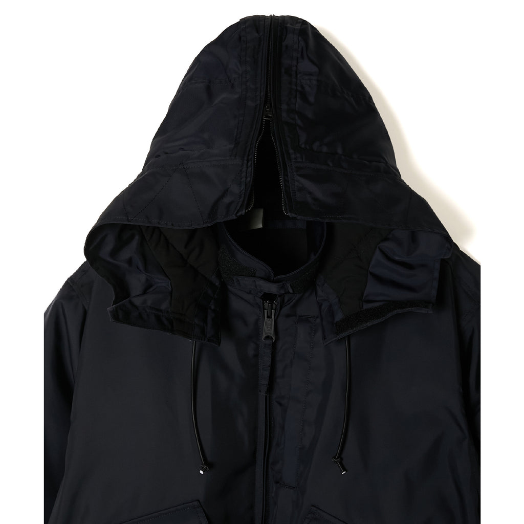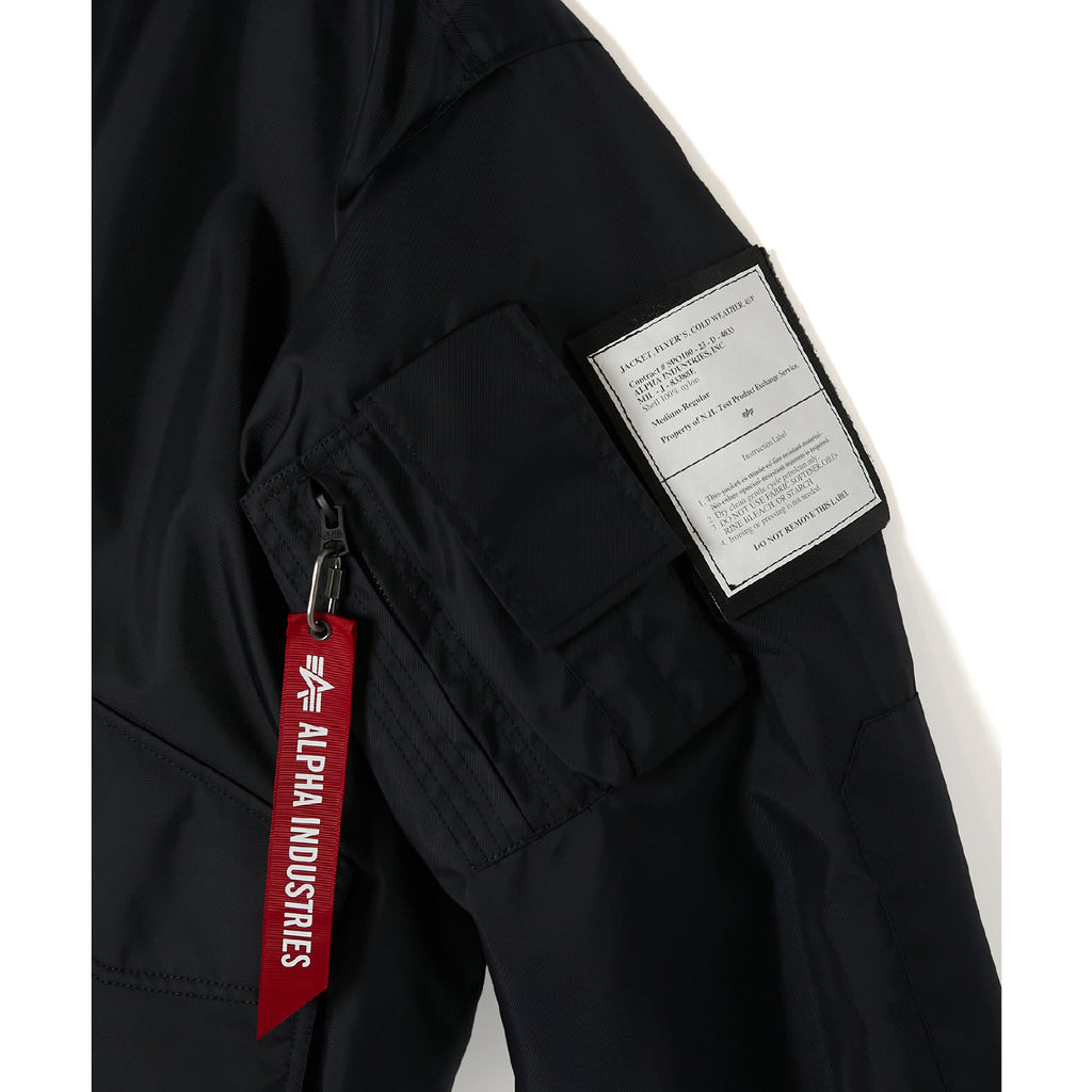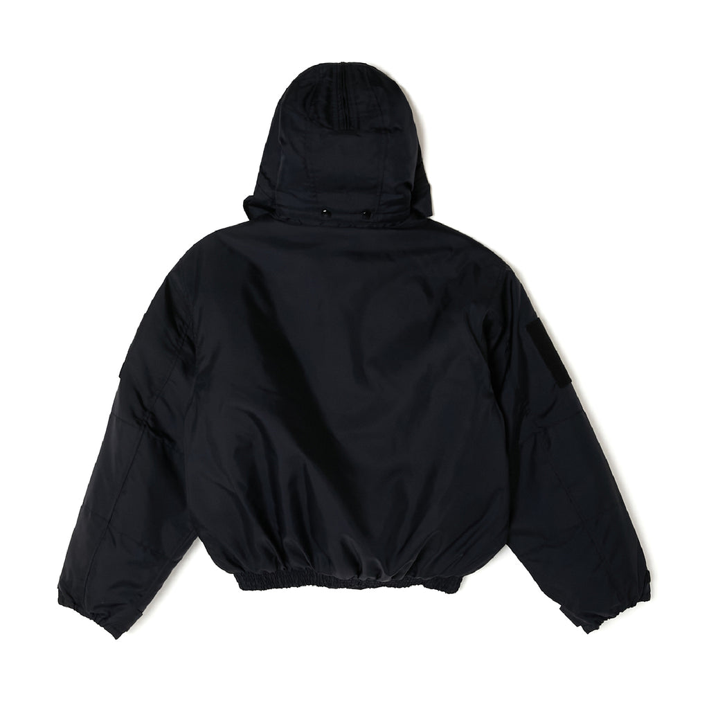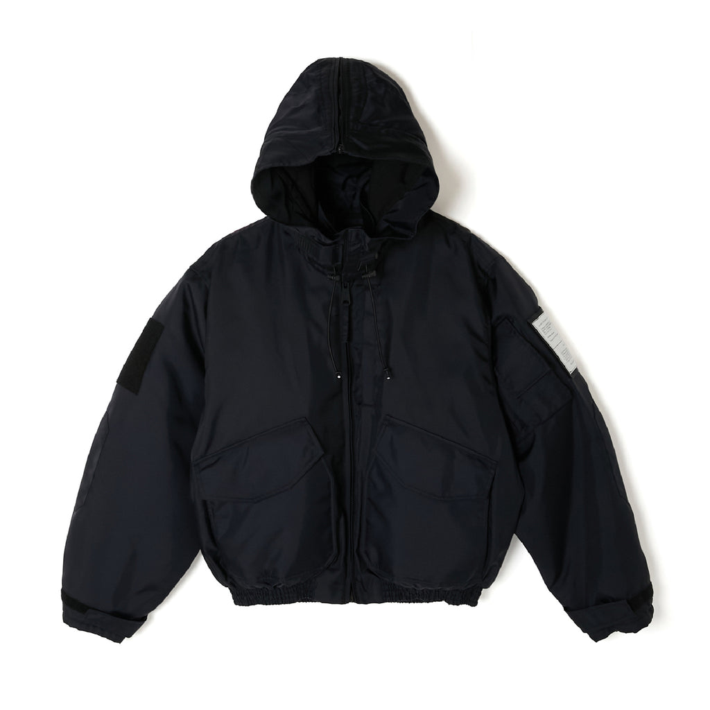 ・ ベースには、ALPHA INDUSTRIESが配給したCWU-106/Pを採用。着脱可能なフルオープン仕様のフードは、80年代に登場したCWU-45/P用のオプションフードを使用し、大きめにデザインすることでボディとのバランスを調節。スピンドルにはナイロン素材を採用しモダンな印象に。裏地に中綿のキルティングを施し、袖先にタブを配置。フロントポケット内側にALPHA INDUSTRIESのタグをアタッチ。ベルクロ仕様のオリジナルミルスペックは両腕、または内ポケットに装着が可能。フードのタブと背面の2箇所にオリジナルミルスペックを配置。