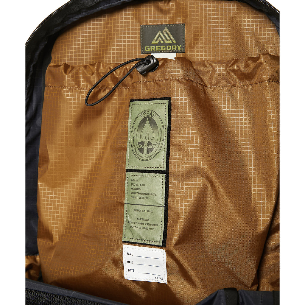 ・身体のラインに沿ったショルダーストラップが安定した背負い心地を実現。また、無数のループは用途に合わせてアクセサリーを装着可能。取り外し可能なウエストベルト付き。視認性の高いウイスキー色のリップストップを使用した内装には、PC等の収納に便利なスピンドル付きの大型ポケットとメッシュポケットを完備。背面にはネームタグと共にN.HOOLYWOOD TPESとGREGORY SPEARの可動式のミルスペックをアタッチ。止水ファスナーを採用。