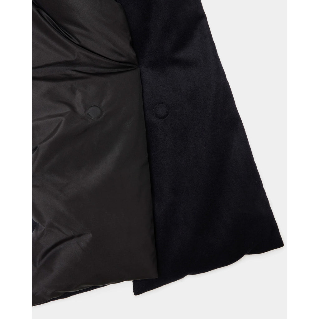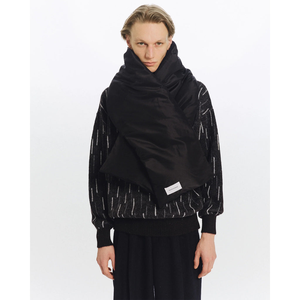 中綿にはダウンを封入し、軽さと高い保温性を両立しています。留め具にはマグネットを採用し、重ねるだけで簡単に着脱が可能。向きを変えることで左上前・右上前どちらの合わせにも対応し、男女問わずお使いいただけます。首元に自然なボリュームが出るよう設計されており、スタイリングのアクセントとしても映えるデザインです。