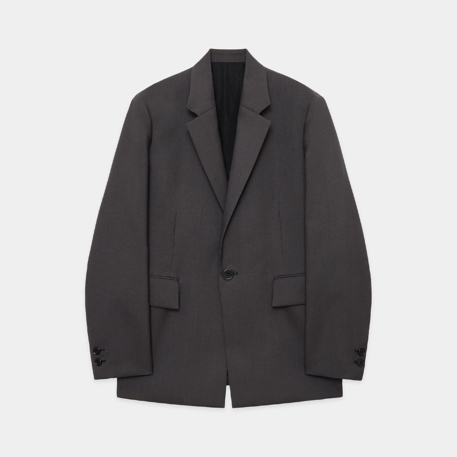 やや小ぶりに設計したラペルは、美しい返りを意識して丁寧に仕上げ、装飾を削ぎ落とすことで素材と構造そのものが際立つ、ミニマルな表情にまとめました。