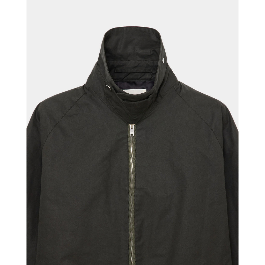 フロントには大容量のポケットを備え、実用性も十分。襟はストラップで留めることでスタンドカラーとしても着用でき、機能性の中に上品で男らしい表情を添えています。
