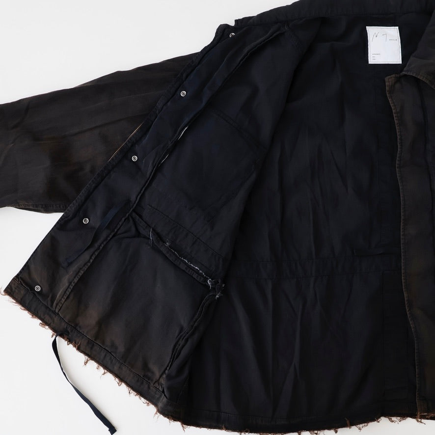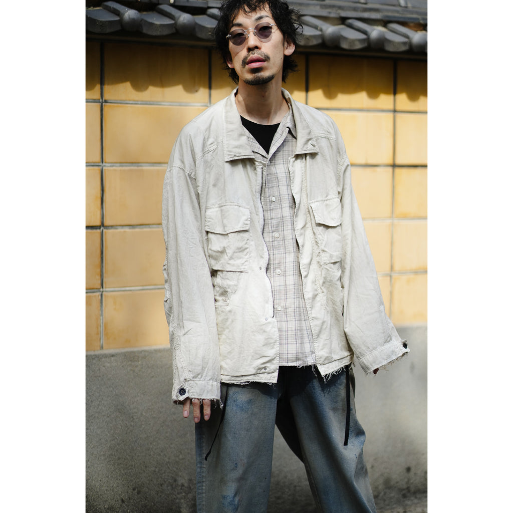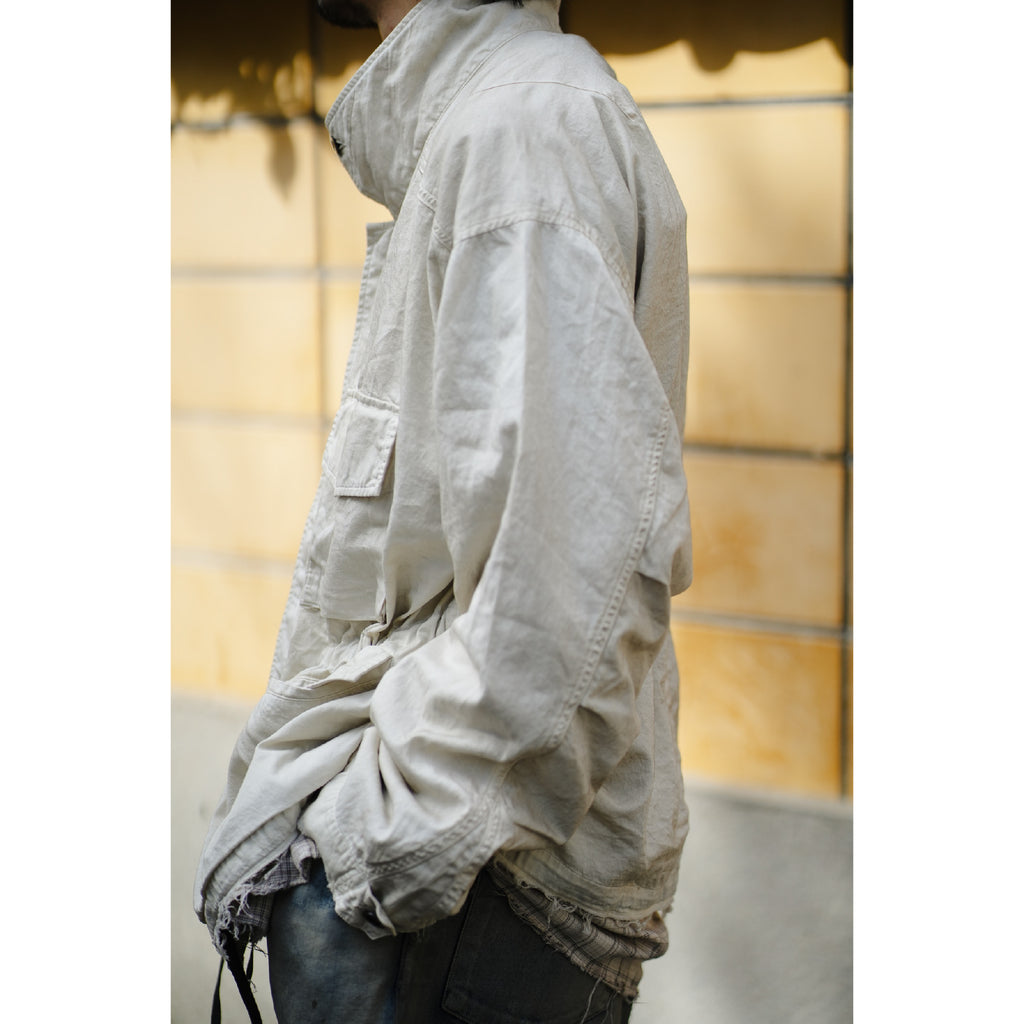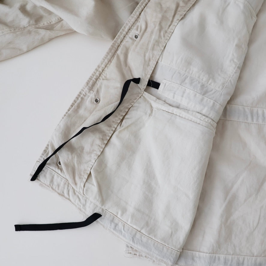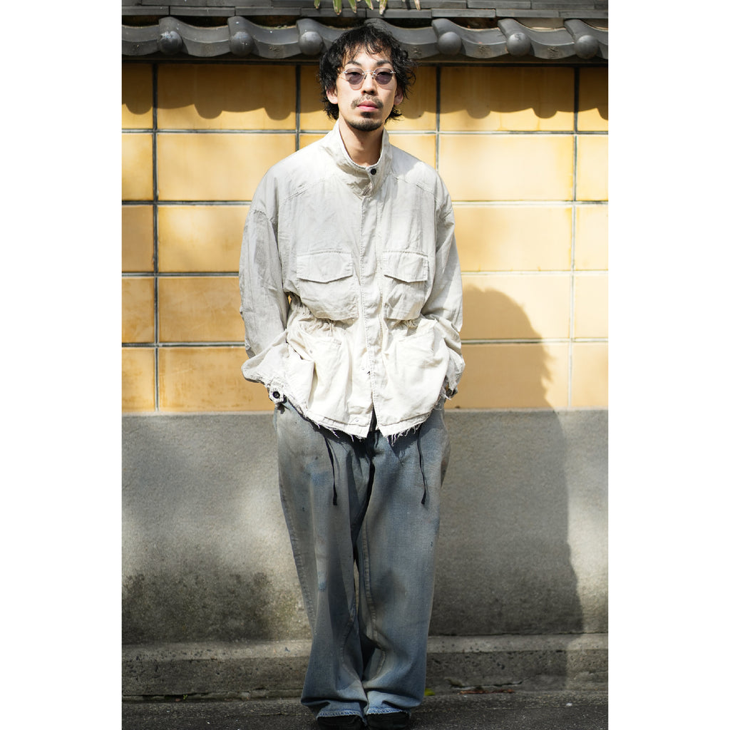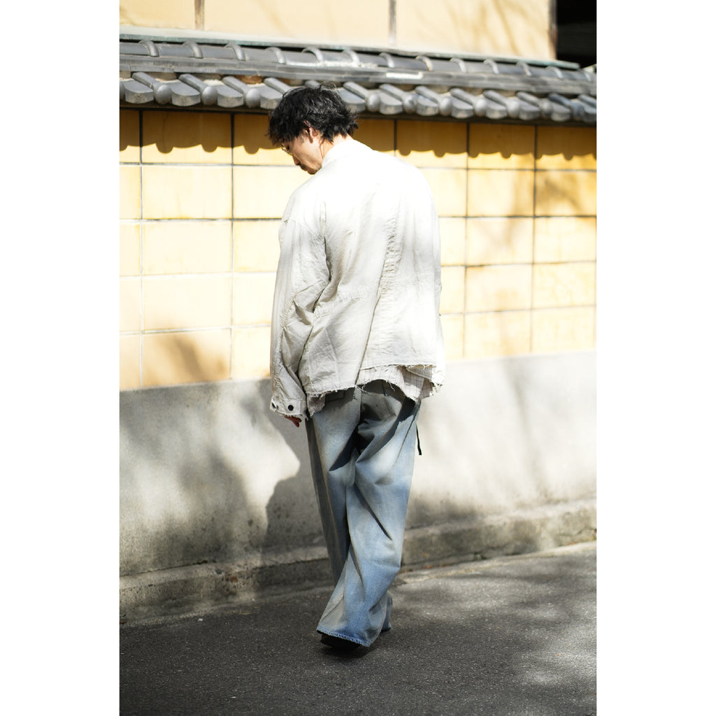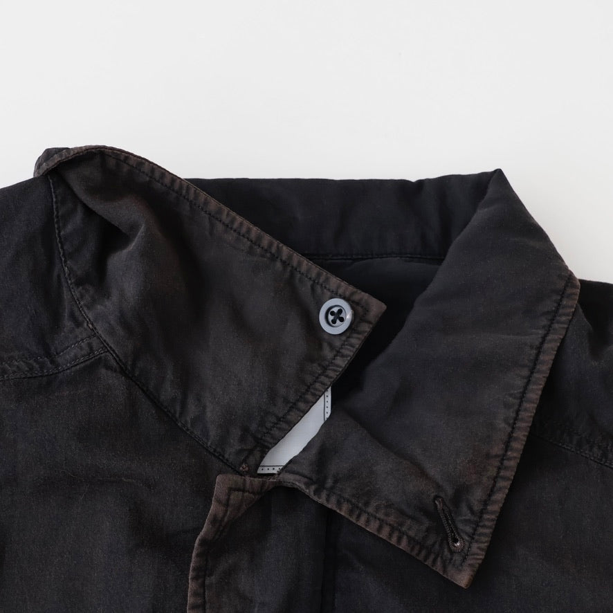 縫製に現れるパッカリングと蛇行、スナップのアタリ、断ち切りから垂れる糸など、粗さを含みながらも無骨になりすない羽織りやすさを目指し、全体のバランスを緻密に設計しております。