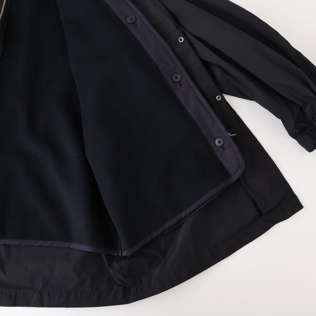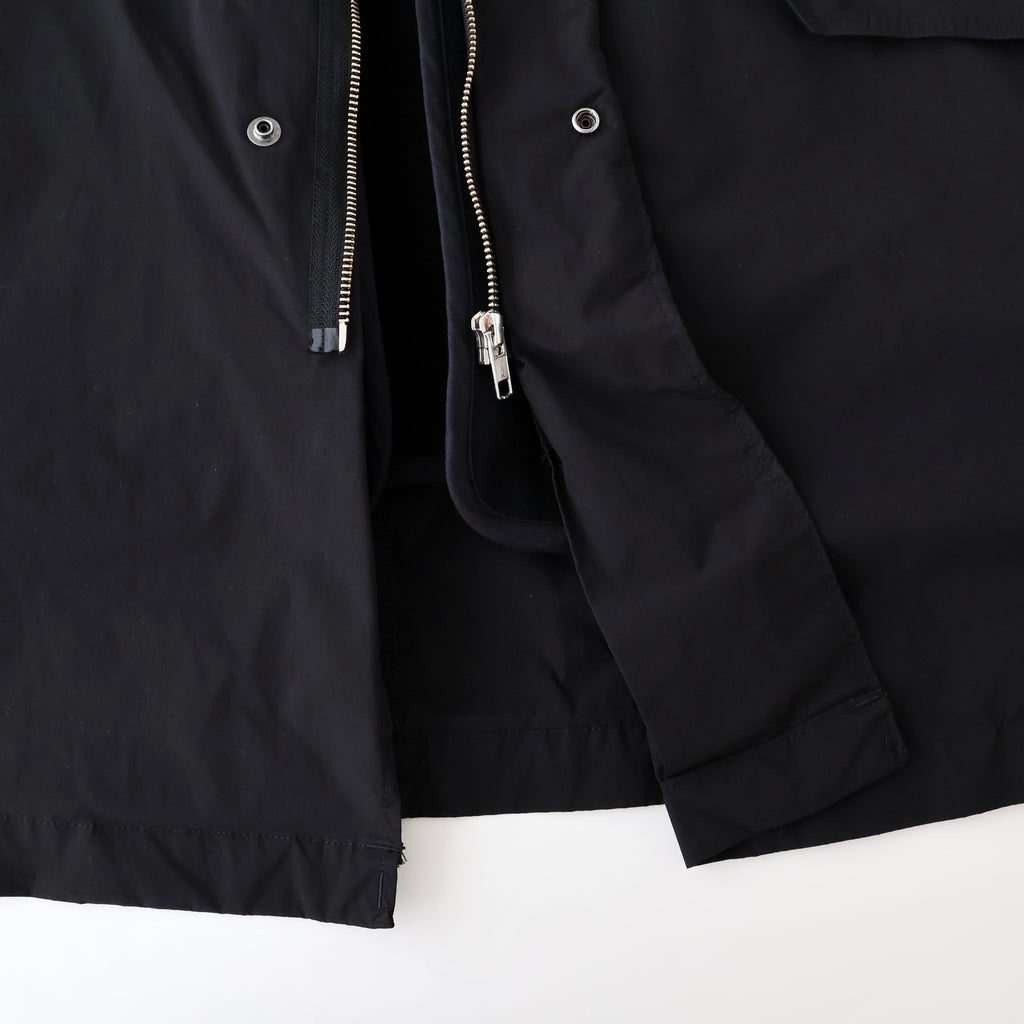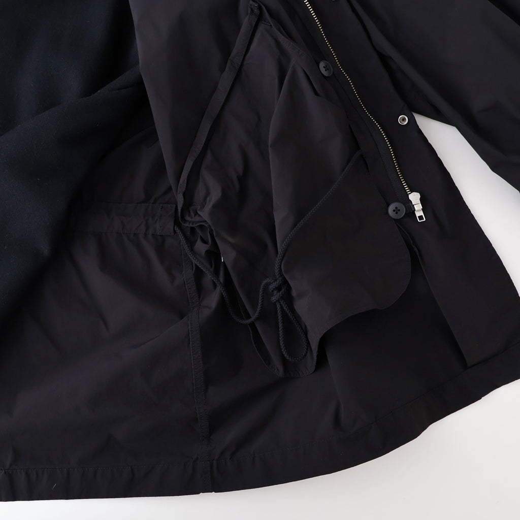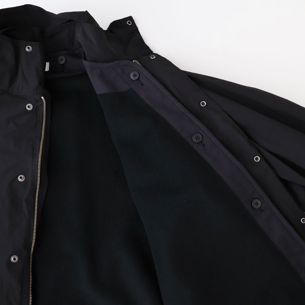 ナイロンとポリエステルの熱収縮率の違いを生かし、環境の変化により表情が変わっていく様を楽しむことのできる、天然繊維のような糸を使用し、石川県能美市にて高密度に織り込むことにより、独特の風合いを表現した素材です。製品染めで仕上げ、撥水加工を施しています。ライナーはしっかりと保温性が伴うので、真冬でも着用することができます。
