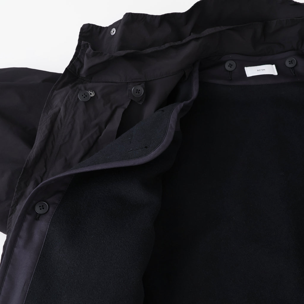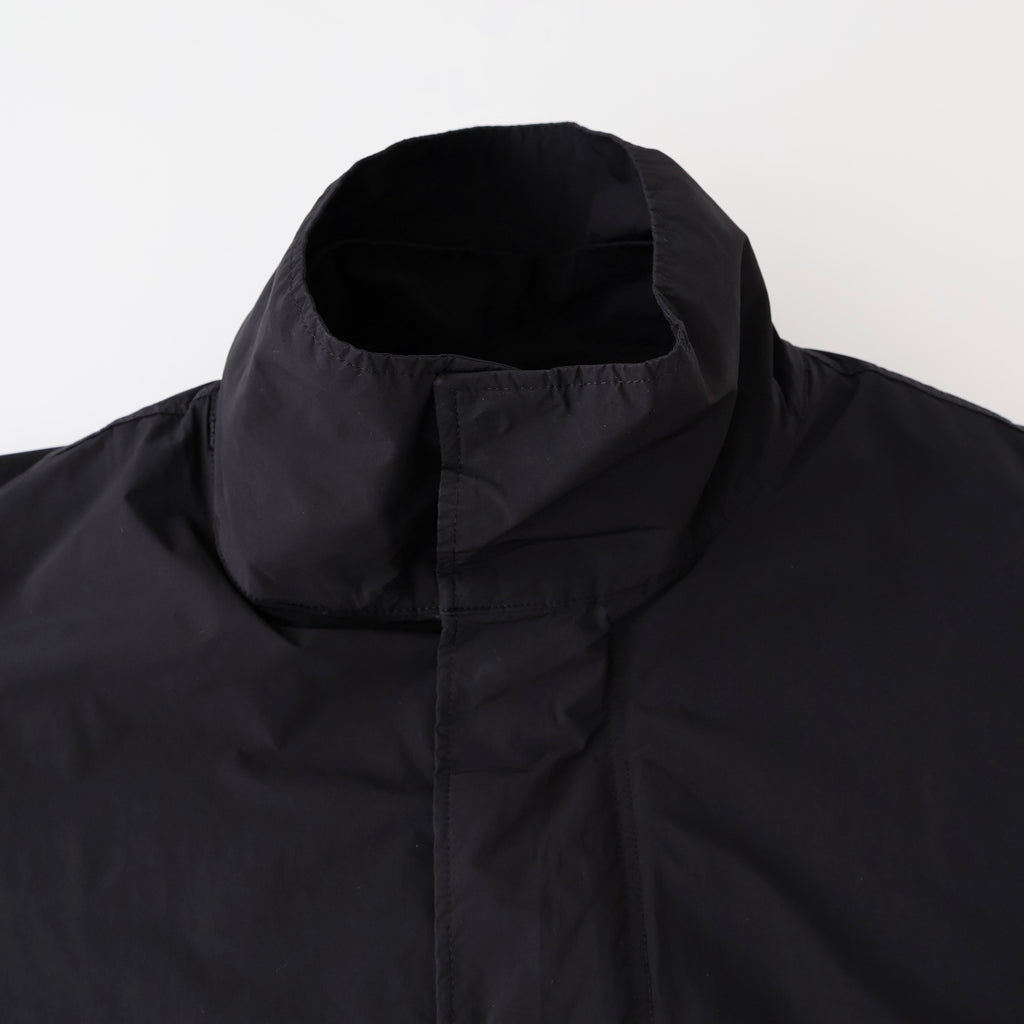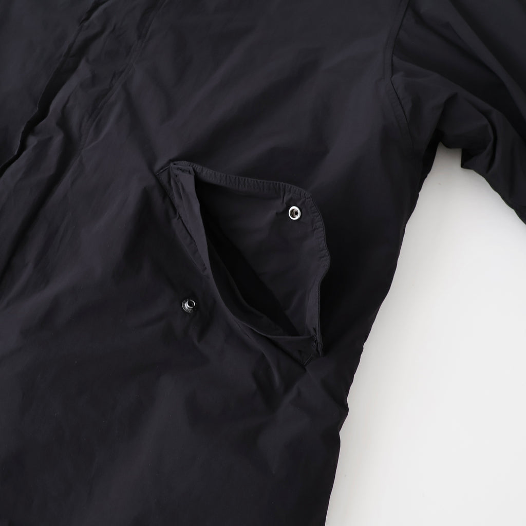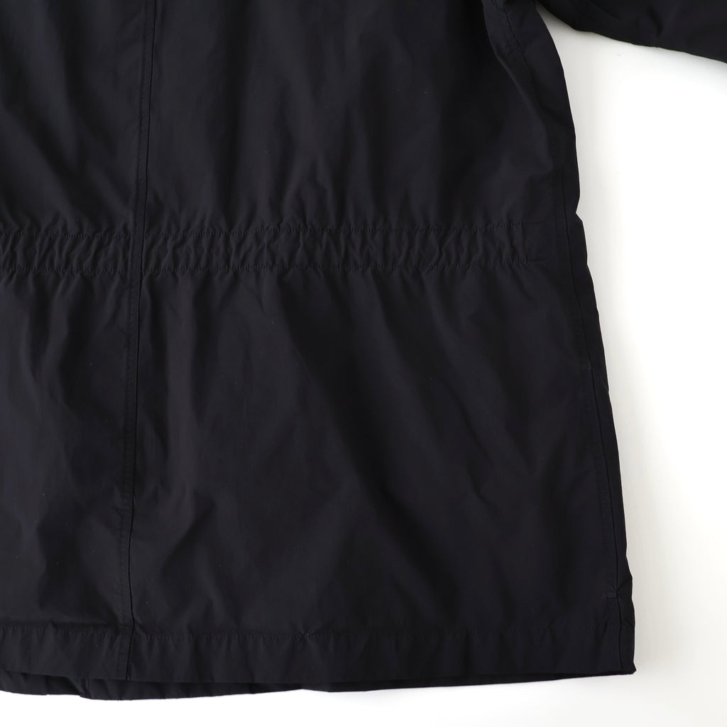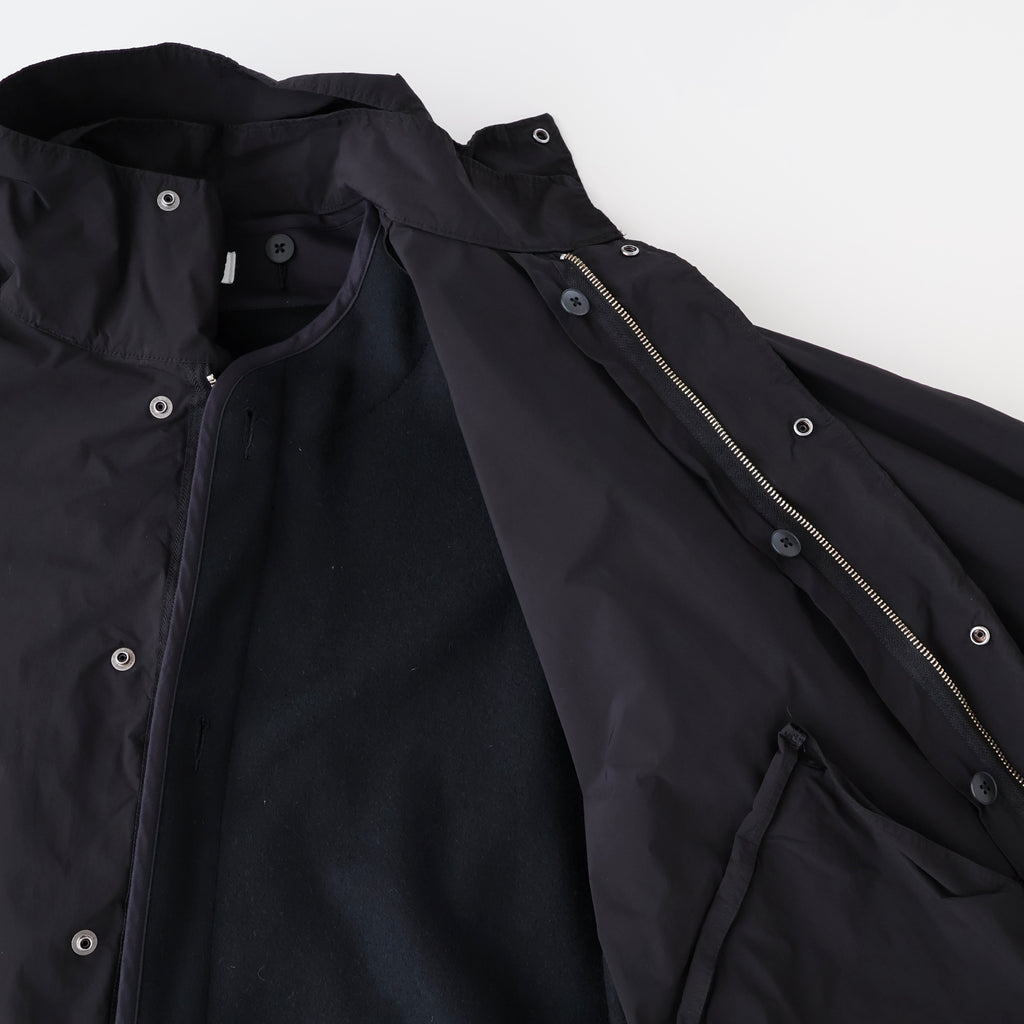ナイロンとポリエステルの熱収縮率の違いを生かし、環境の変化により表情が変わっていく様を楽しむことのできる、天然繊維のような糸を使用し、石川県能美市にて高密度に織り込むことにより、独特の風合いを表現した素材です。製品染めで仕上げ、撥水加工を施しています。ライナーはしっかりと保温性が伴うので、真冬でも着用することができます。
