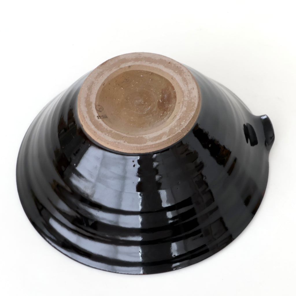 伊賀焼きの擂鉢は、どっしりとした素朴な風格があり、据わりがよく安定感があります。釉薬はとろりとした質感の味わい深い黒飴釉を回しかけ、焼き締めてあります。また単純な造りの様ですが、縁の内側にぐるりとある溝は、すりつぶした食材を別のお皿に移す際に、注ぎ口へと導く役割を果たしてくれます。食べ物が外へ飛び出さず、驚くほどスムーズに作業ができます。また、片口は二段口になっていて、液体の切れがよくなるよう工夫されています。一方で、櫛目は美しく繊細で、深すぎず浅過ぎもしない絶妙な切り込み。食材が溝に落ちてしまうことも滑って擦れなくなってしまうこともなく、胡麻や味噌、豆腐などをしっかり滑らかにすり潰し、その味の出来上がりに一役買います。