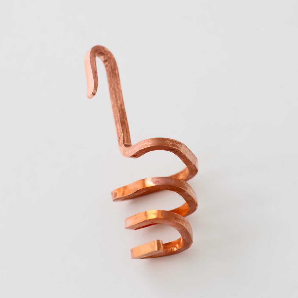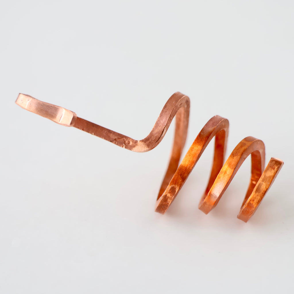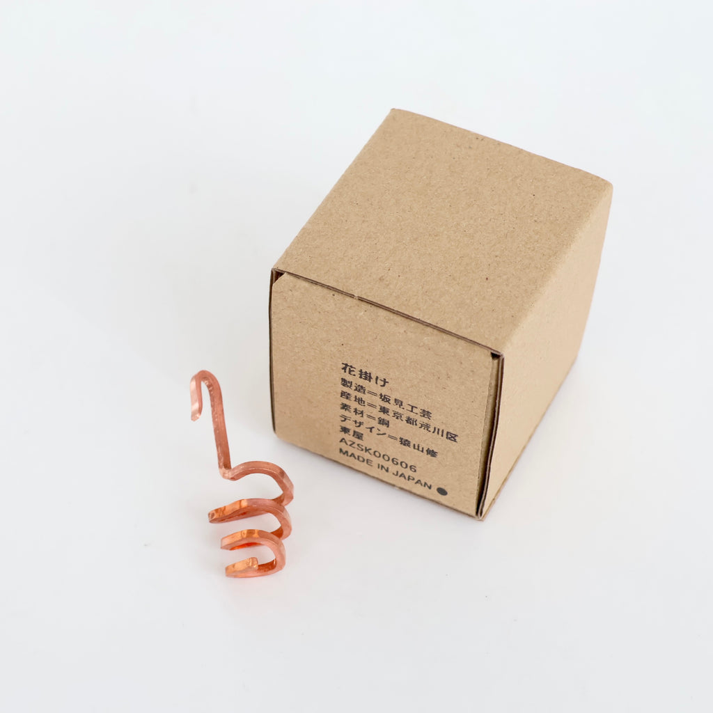 この「花掛け」は十円玉と同じ銅でできています。上野雄次は「花器は銅が古来からの常道」という。調べてみると、銅には殺菌作用があって水をキレイに保つとのこと。バクテリアの繁殖を抑えてお花が少し長生きするみたいです。赤金色の銅の肌は、水を浄化しながら慎ましやかな褐色に転じて、お花の引き立て役に徹していきます。