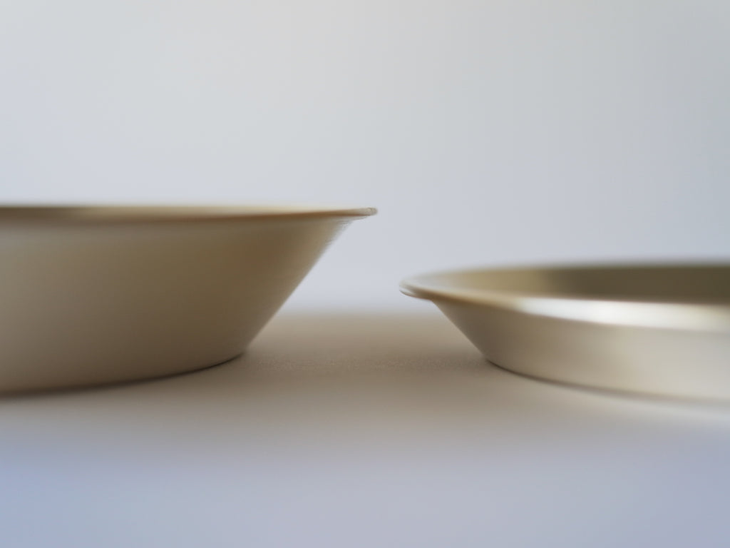 型は浅型の「小」と、縁がしっかり立ち上がった深型「大」の2種類。素材も、特性をそのまま楽しんでいただける真鍮と、経年の変化をより楽しんでいただける銀メッキをご用意。用途に応じてお選びください。