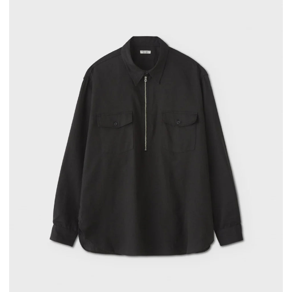 番手違いの撚り杢を一部に使用し、うっすらと 色抜けしたフェード感を表現。ビンテージライクなハーフジップワークシャツになります。