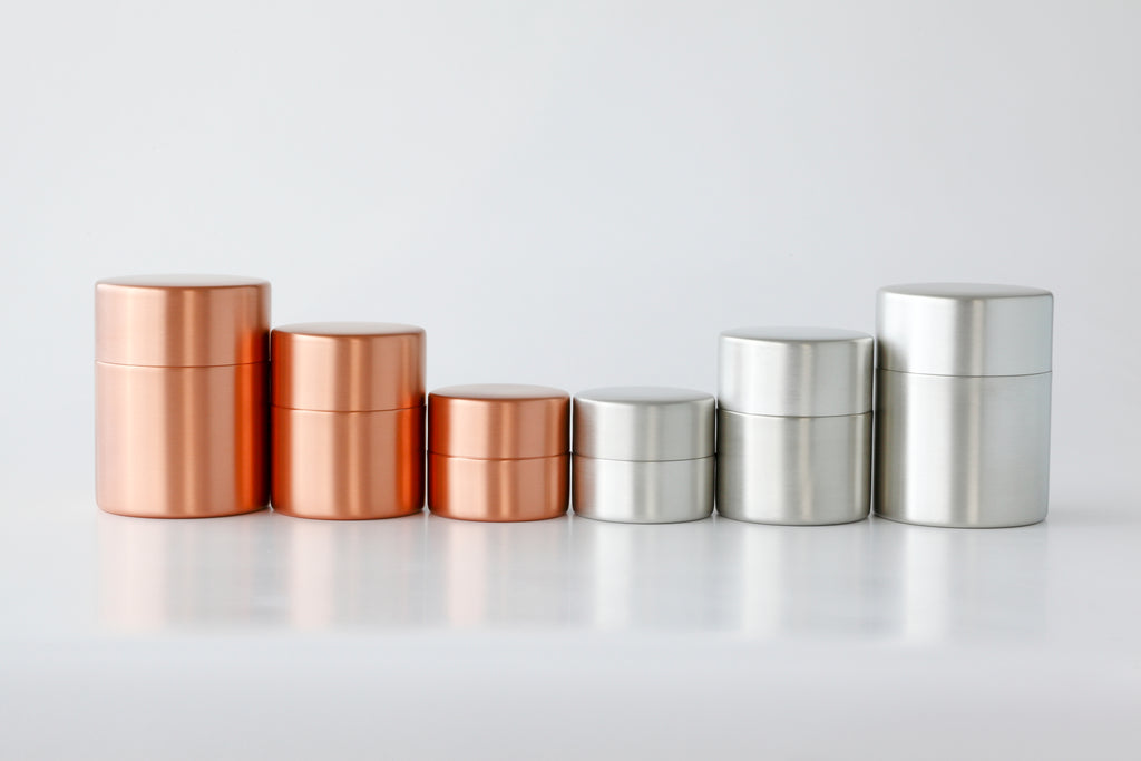 一枚の銅版から作られた、継ぎ目のない茶筒。一般的には側面に溶接の継ぎ目があるものが多いのですが、この茶筒は一枚の銅版を押し出して作られているため、一体型となり壊れることもありません。