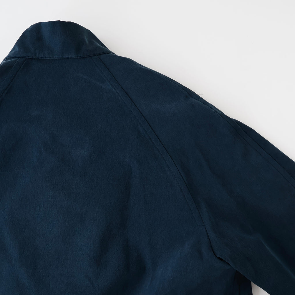 ポリエステルで作られた雰囲気をシルクで再現し、シルエットは低めに設定した襟で、首元が尖らず柔らかい表情にし、3パッチポケットでカジュアルな印象。スプリットラグランスリーブを採用し袖山はやや高くても袖の可動域は広くて着やすい。