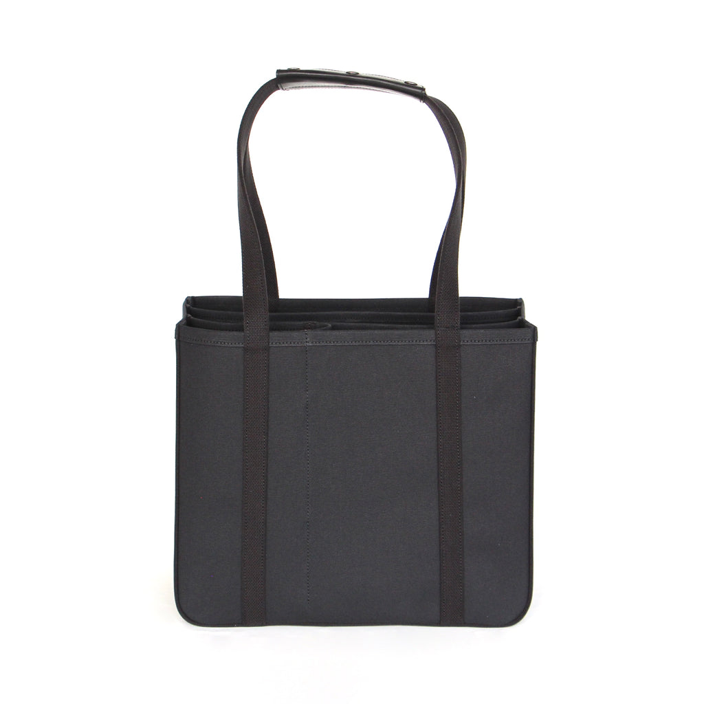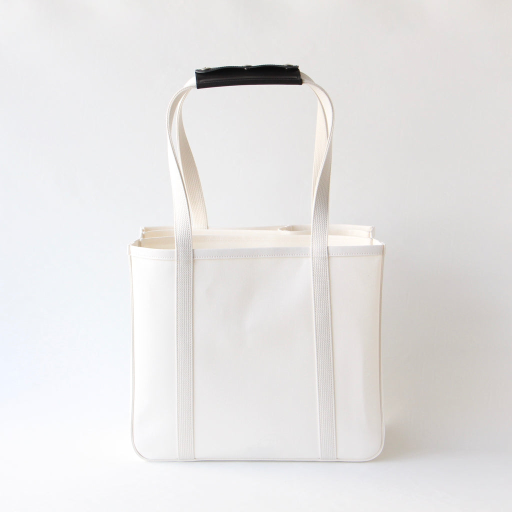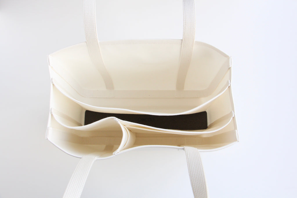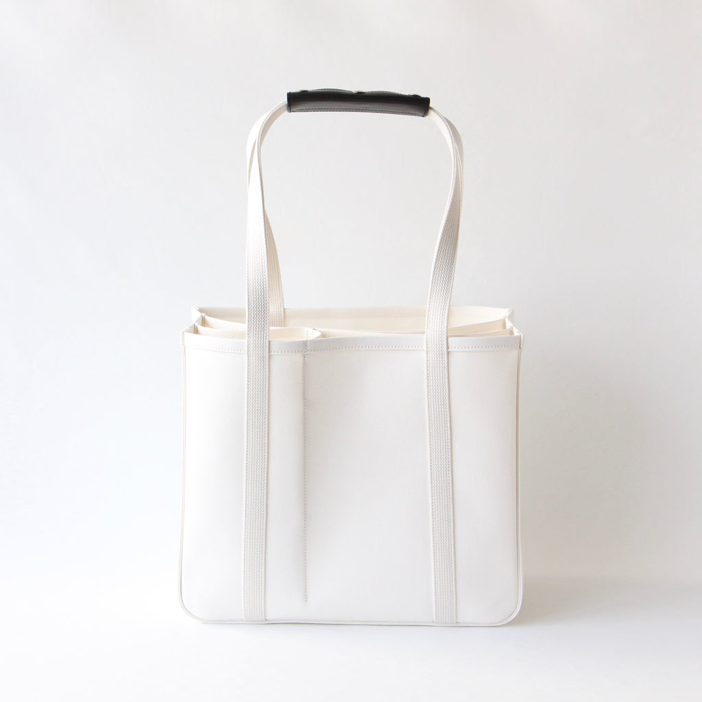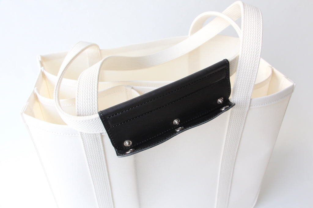 パソコン等薄型電子機器を収納することを想定し、仕切りのひとつにはレザーの底板を入れています。小さい仕切り部分には、水筒や折り畳み傘など立てて収納したいものを入れると便利です。
