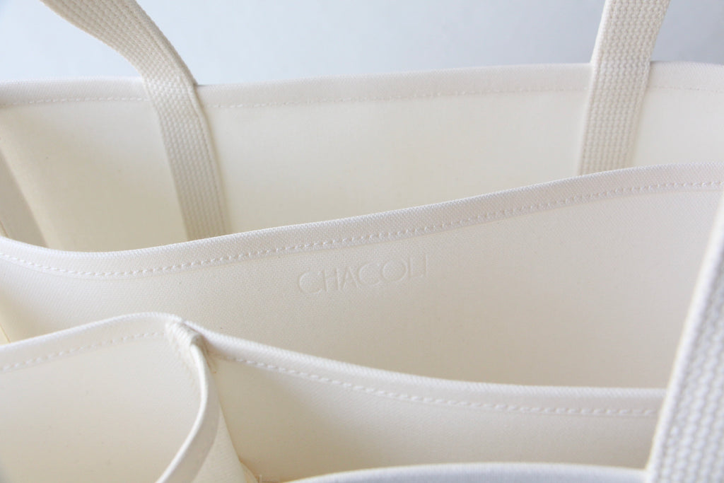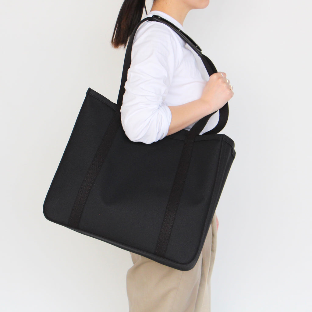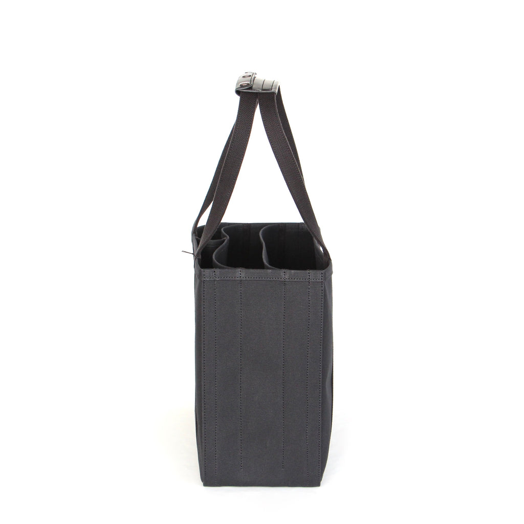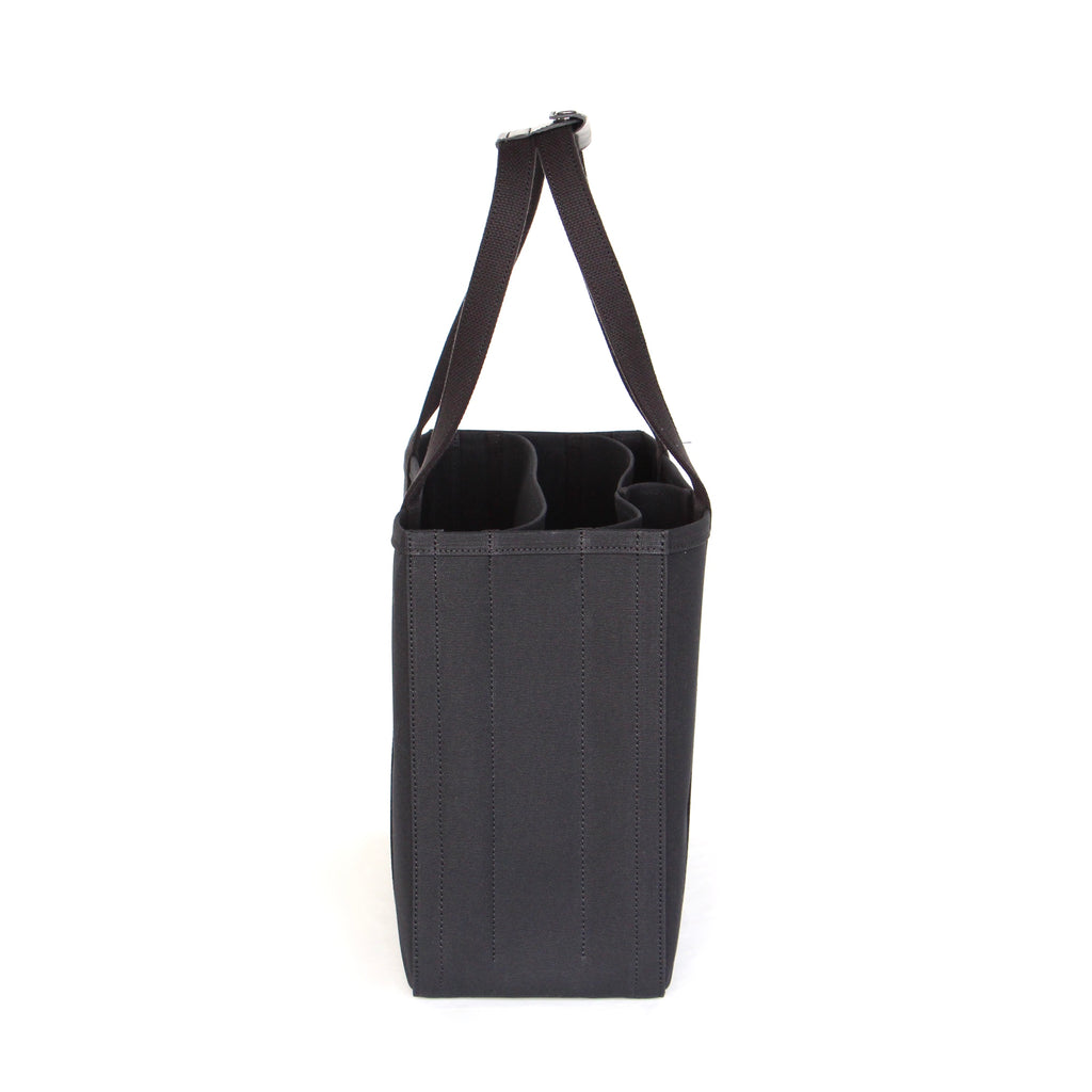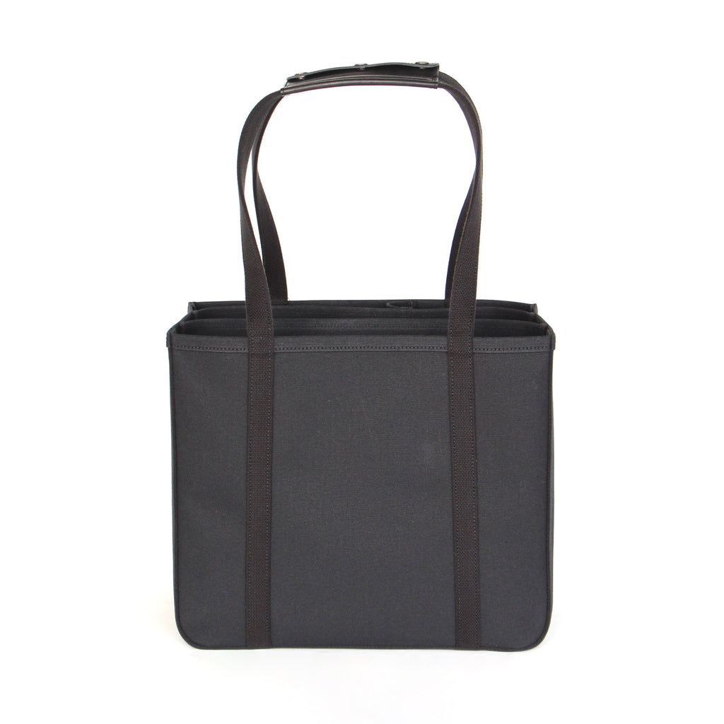 パソコン等薄型電子機器を収納することを想定し、仕切りのひとつにはレザーの底板を入れています。小さい仕切り部分には、水筒や折り畳み傘など立てて収納したいものを入れると便利です。