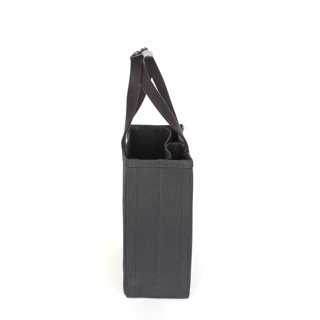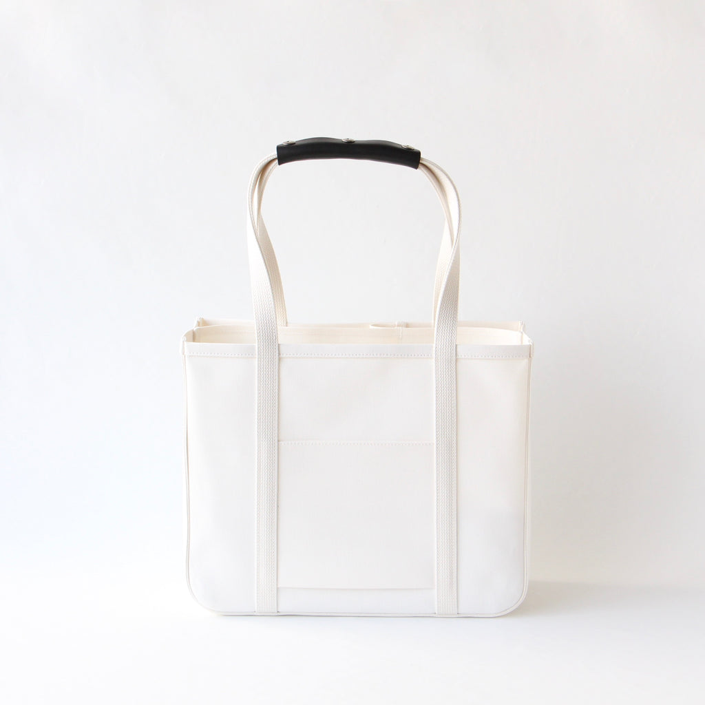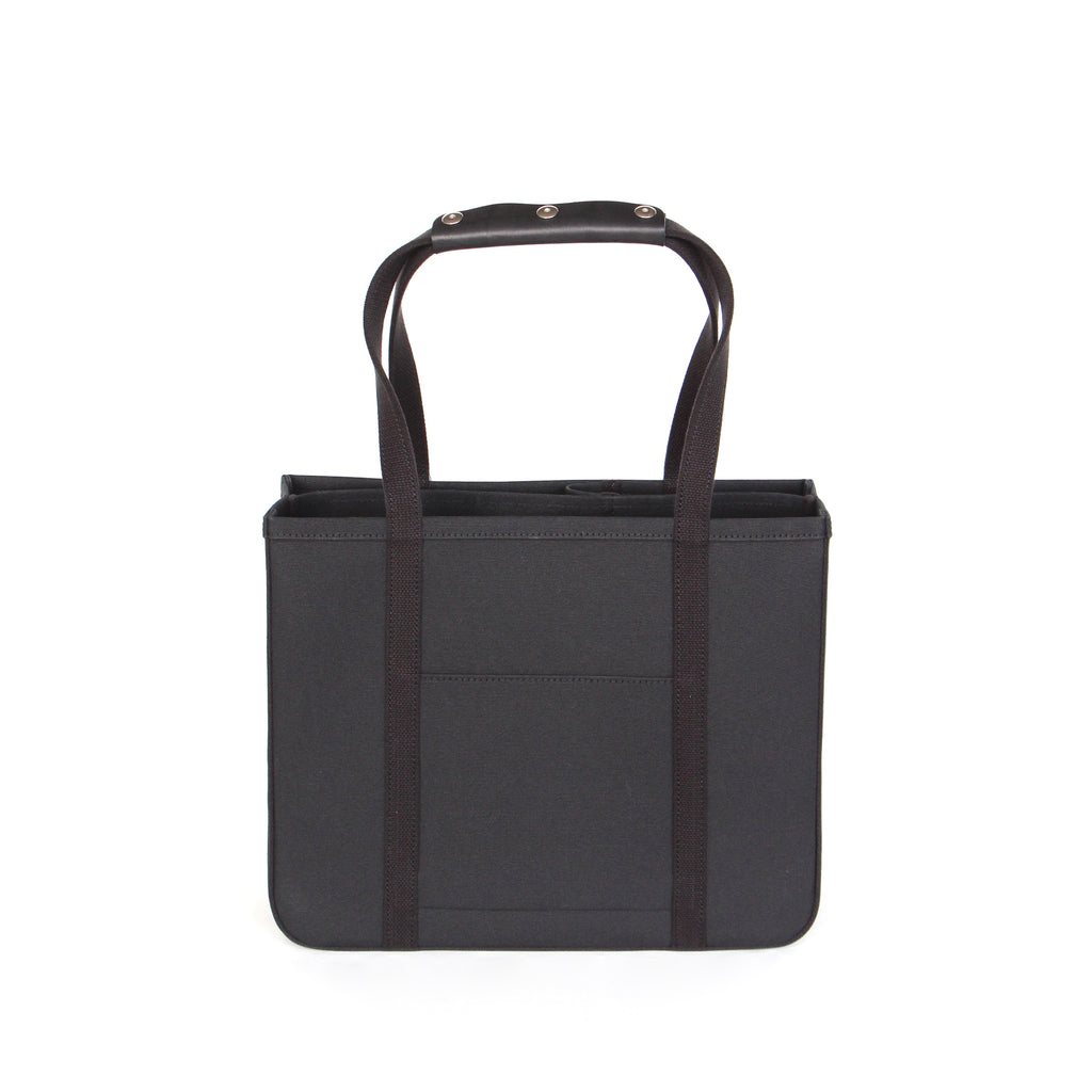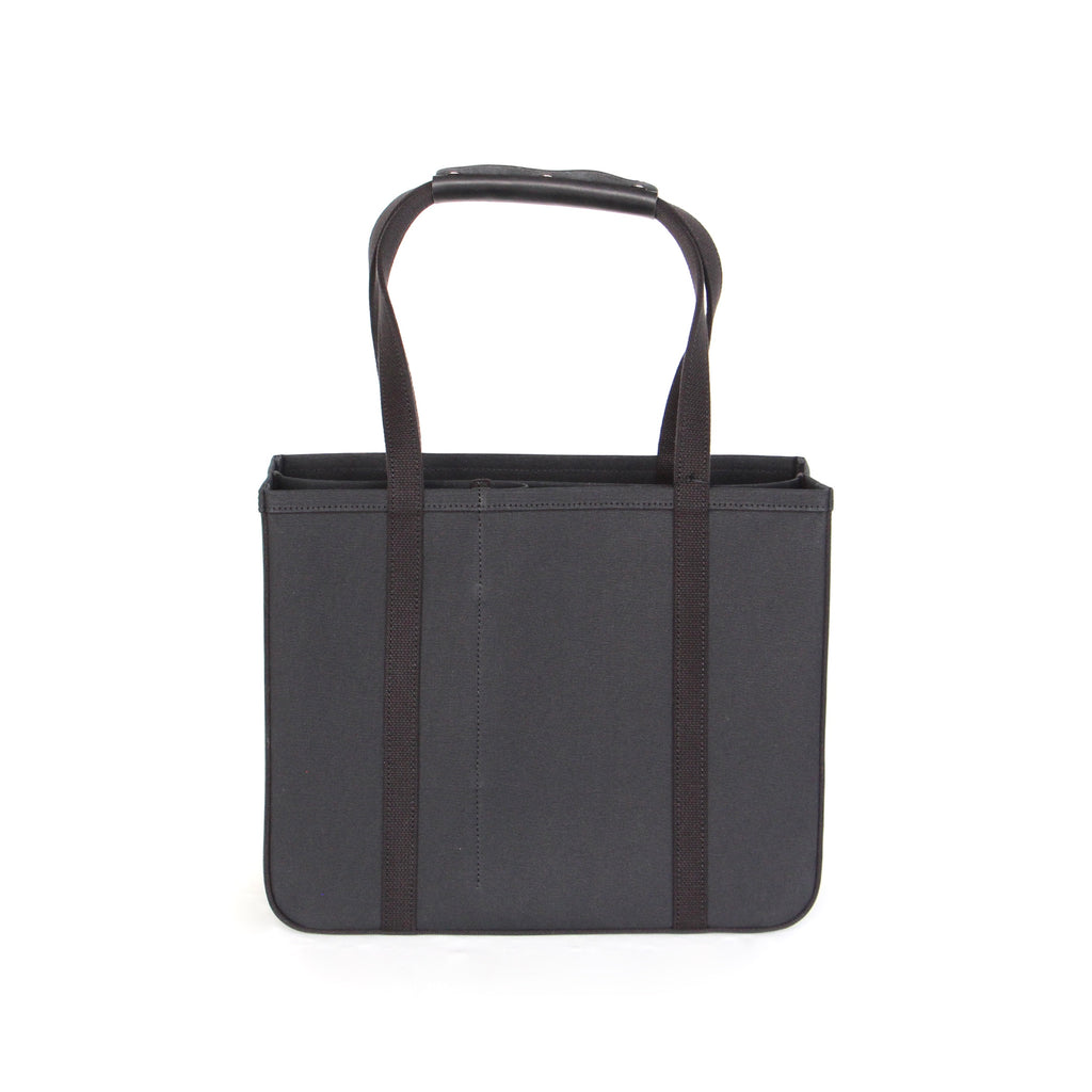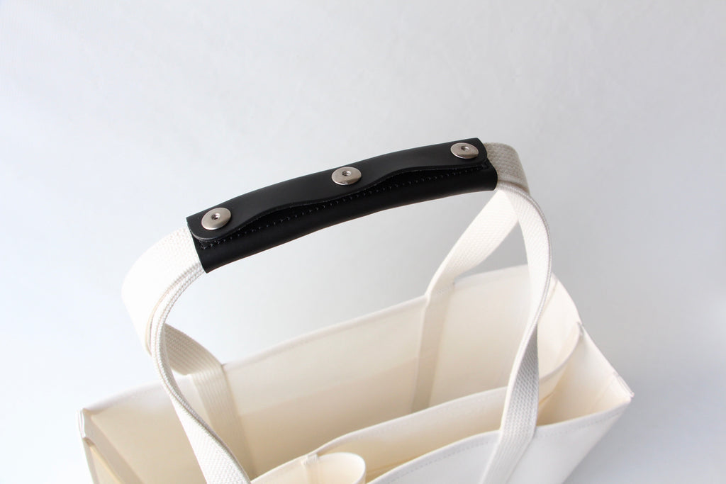パソコン等薄型電子機器を収納することを想定し、仕切りのひとつにはレザーの底板を入れています。小さい仕切り部分には、水筒や折り畳み傘など立てて収納したいものを入れると便利です。