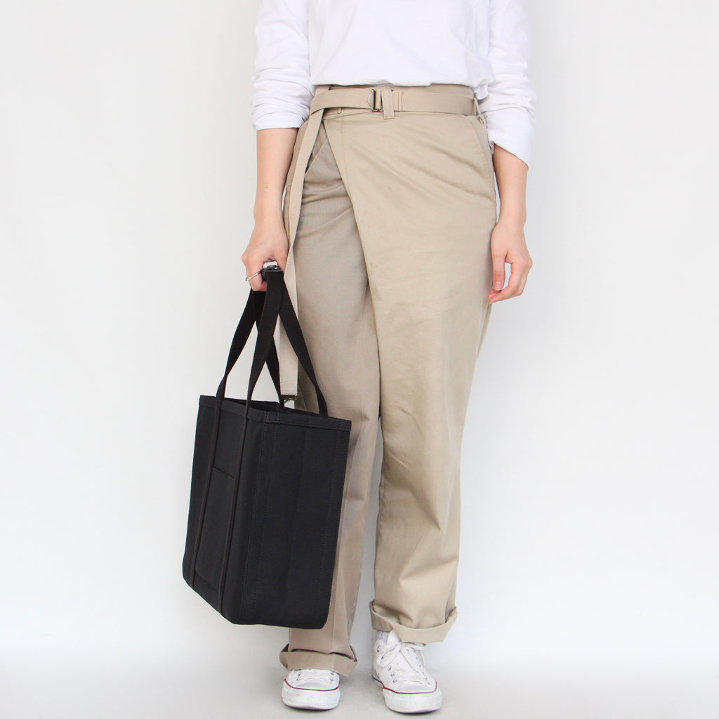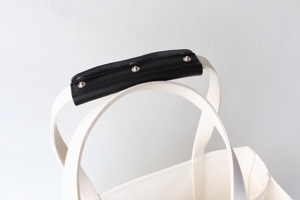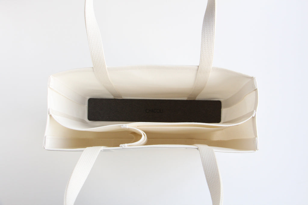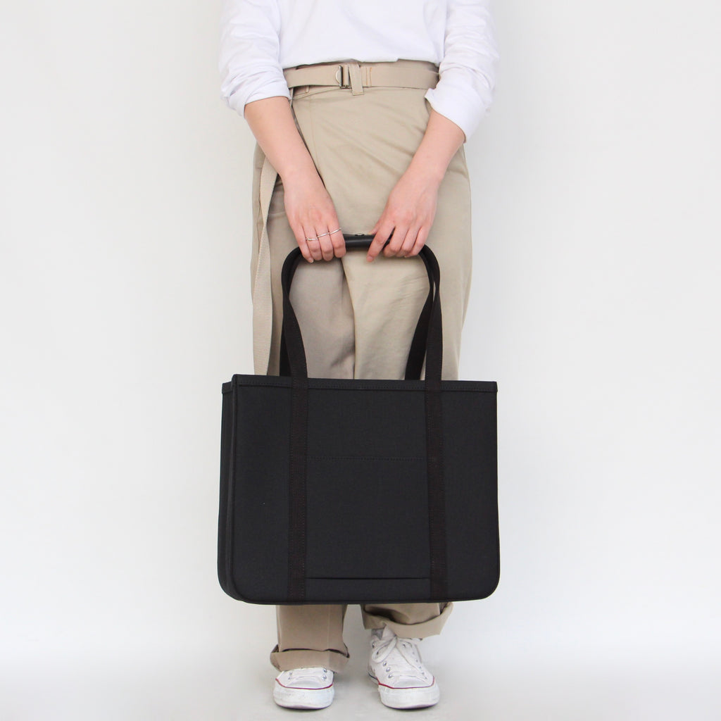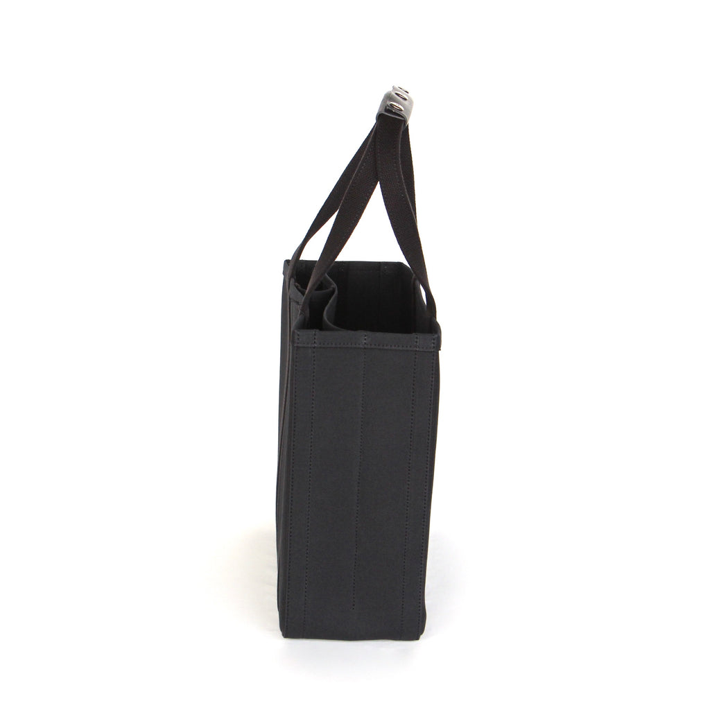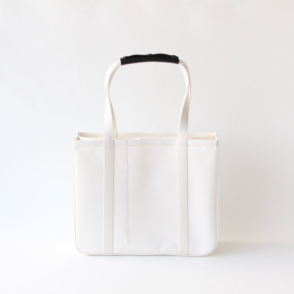 パソコン等薄型電子機器を収納することを想定し、仕切りのひとつにはレザーの底板を入れています。小さい仕切り部分には、水筒や折り畳み傘など立てて収納したいものを入れると便利です。