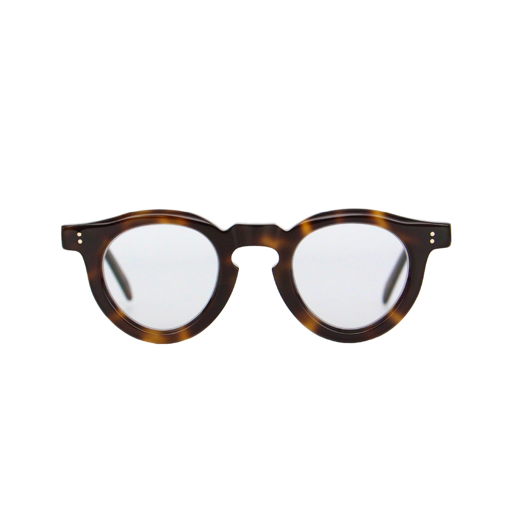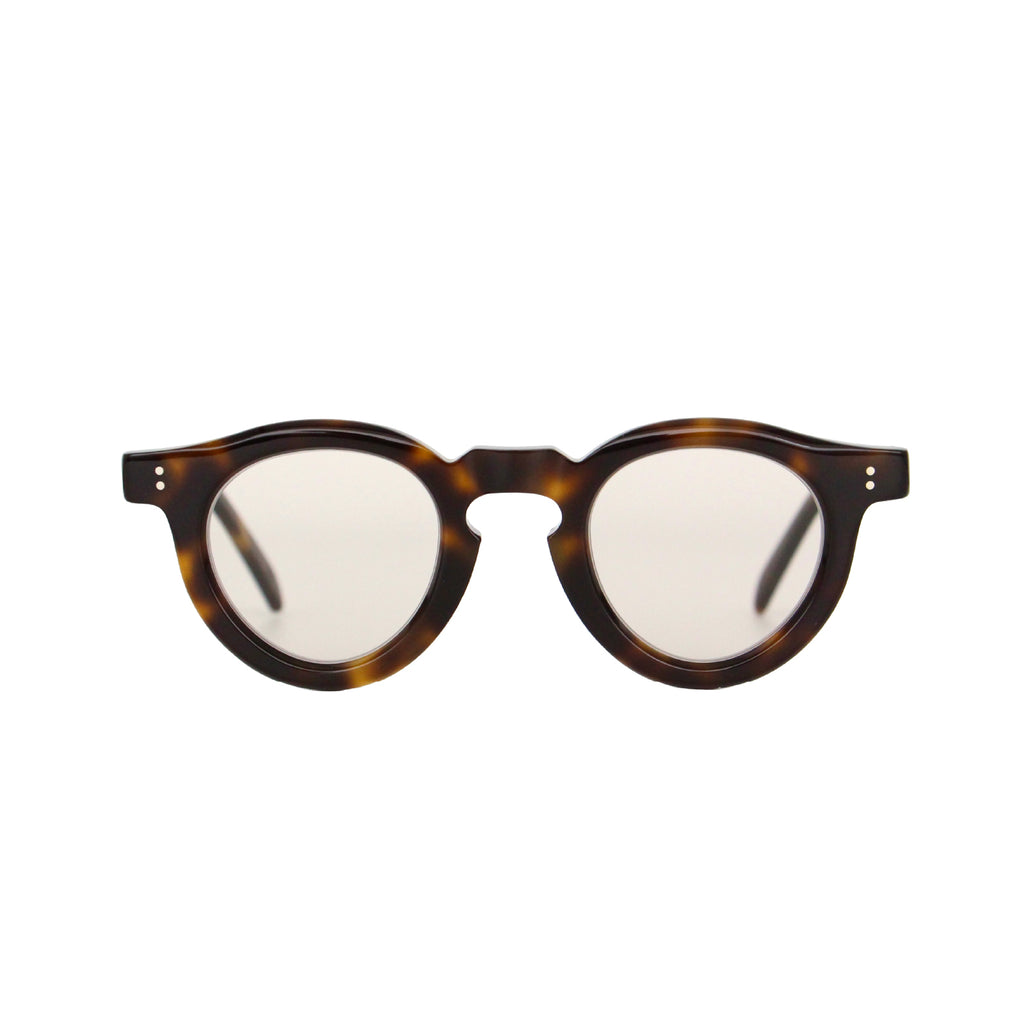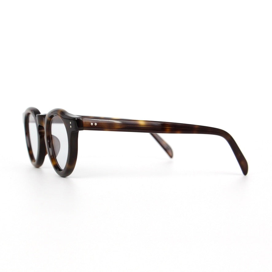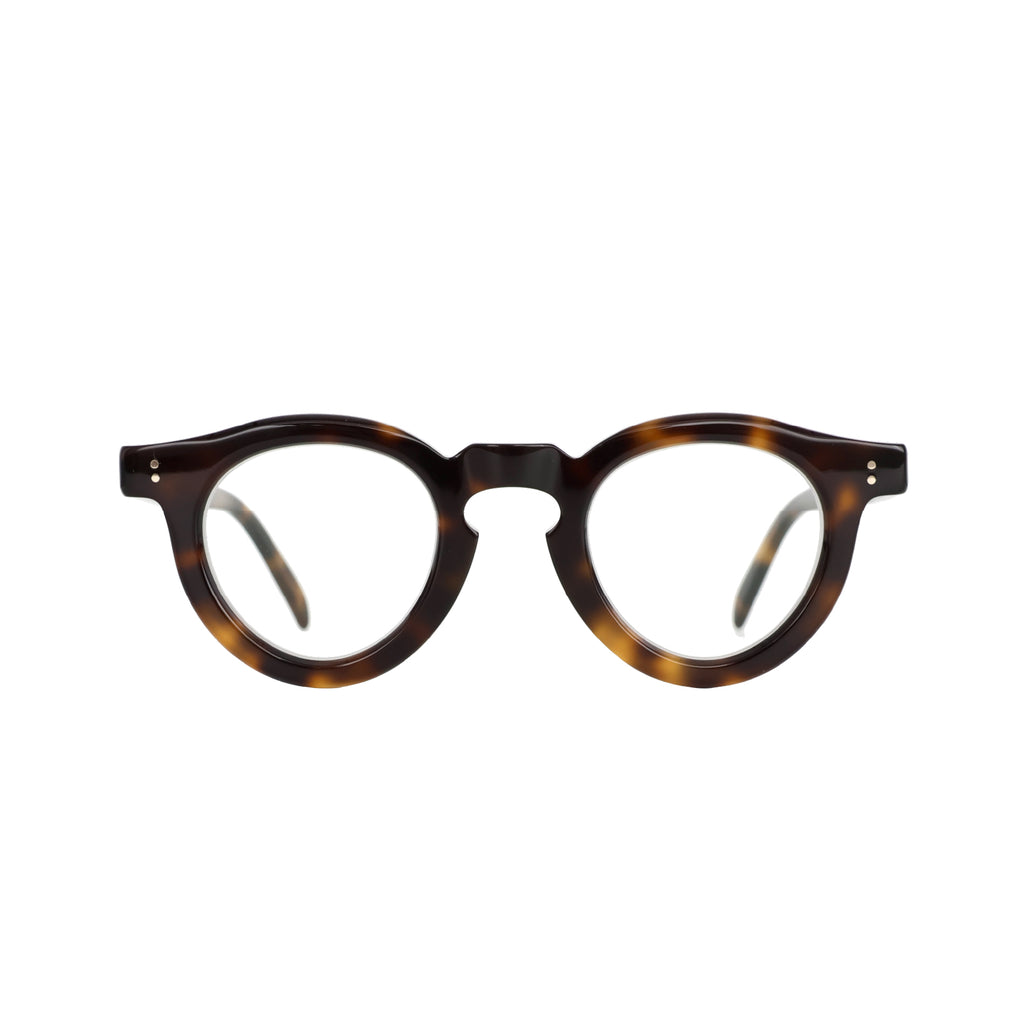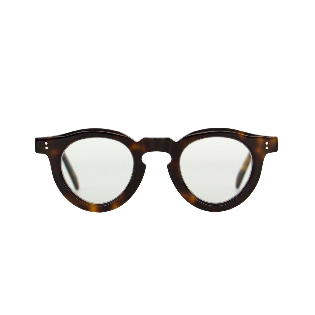 一般的なパントとは異なり、リム周りを厚めにとり、レンズシェイプは小ぶりなストロベリー。シンプルなようで主張が強いスタイル。